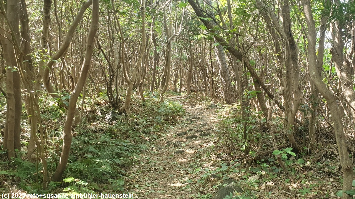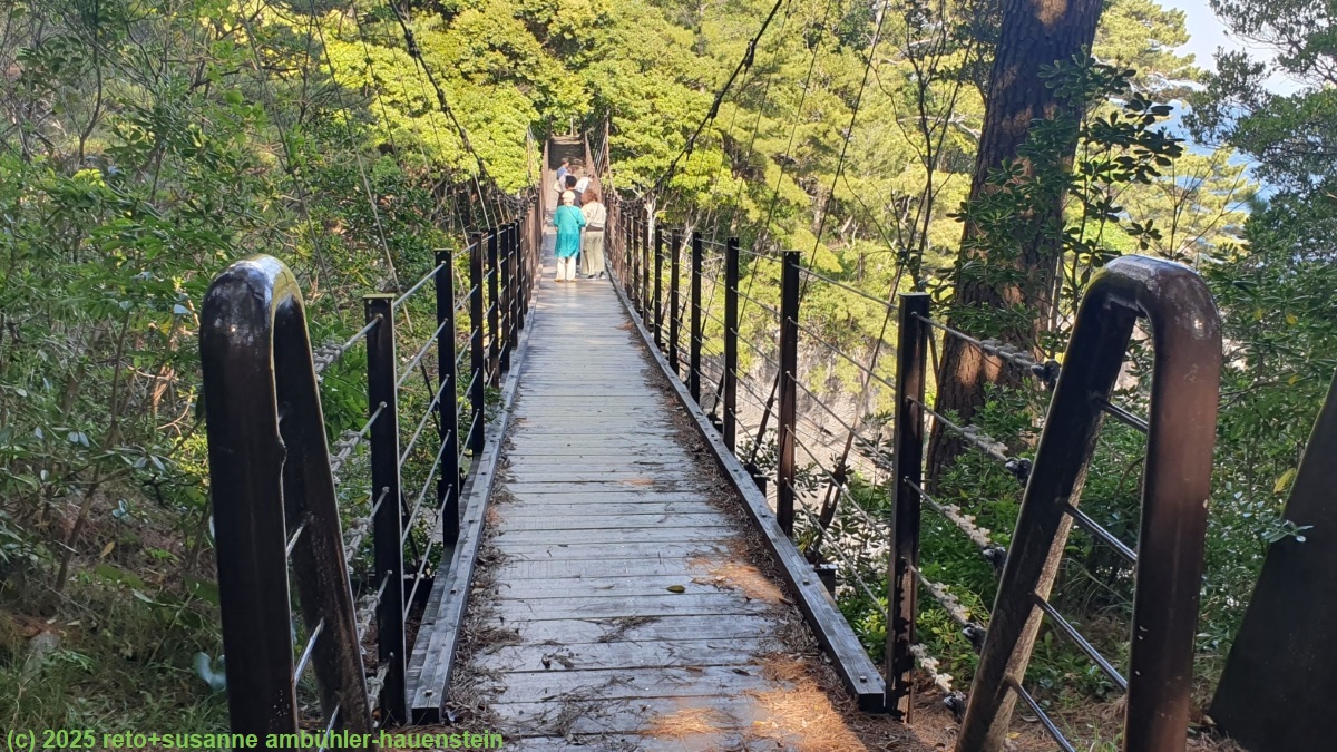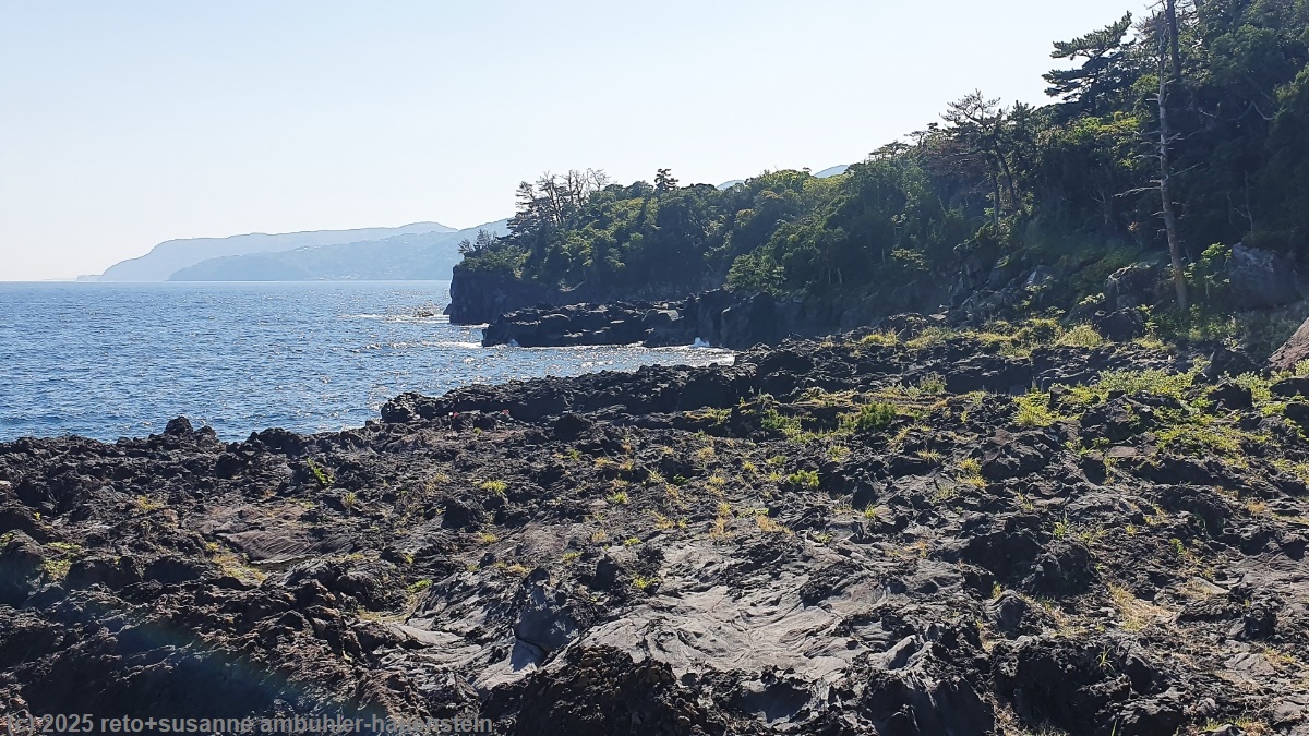 danach geht es weiter auf dem abwechslungsreichen weg. es gibt kurze auf- und abstiege und auch der wald ändert immer wieder. manchmal sind die bäume hoch und stehen etwas weiter auseinander, dann sind sie wieder klein und dicht. dazu kommen kleine landzungen mit vulkanischem gestein und schmale buchten mit grossen steinen. ich liebe das rauschen des meeres und das geräusch der ans ufer laufenden wellen, die an manchen stellen kräftig auf die senkrecht stehenden felsen prallen. gelegentlich entdecken wir die markanten, fünfeckigen basaltsäulen, wie wir sie auch auf island gesehen haben. gegen 15 uhr erreichen wir die hashidate hängebrücke und wenig später das ende des coastal trails in der nähe des yawatano fischerhafens. von da führt uns unser navi richtung bahnhof von izukogen.