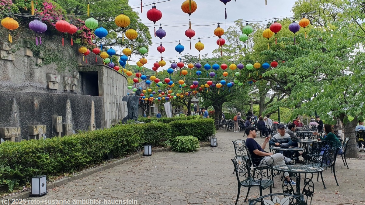 wir stehen um 07:30 uhr auf und frühstücken im hotel. um 9 uhr verlassen wir dieses und machen uns zu fuss auf den weg zum mount inasa, dem hausberg von nagasaki. wir marschieren erst dem fluss urakami-gawa entlang, danach geht es über schmale und stellenweise ziemlich steile wege durch ein wohnquartier. oberhalb der häuser folgen wir der alten bergstrasse, welche allerdings in einem üblen zustand ist. auf dem gipfel des mount inasa geniessen wir vom observatory tower aus die fantastische aussicht auf die stadt nagasaki. danach fahren wir mit der luftseilbahn wieder in die stadt hinunter und marschieren durch die siedlung dejima sowie am seaside park vorbei zum glover garden. wir picknicken auf einer parkbank, danach schlendern wir durch den schönen park und gönnen uns zum schluss ein getränk im teehaus. kurz vor 15 uhr fahren wir mit einer älteren strassenbahn bis zum nakashima-gawa. wir folgen ein stück weit dem fluss und bewundern die steinbrücken. anschliessend marschieren wir am koeizan choshoji tempel vorbei bis zu den hamanomachi arkaden. wir erfrischen uns mit kaffee und früchten, danach kehren wir zum hotel zurück. wir erfahren, dass wir heute zum vierten mal grosseltern geworden sind ! kurz vor 19 uhr marschieren wir noch einmal zu den hamanomachi arkaden und geniessen ein köstliches abendessen. obwohl es auf dem rückweg zum hotel wie aus kübeln giesst, trinken wir noch etwas im nahen starbucks. um 23 uhr sind wir im bett.