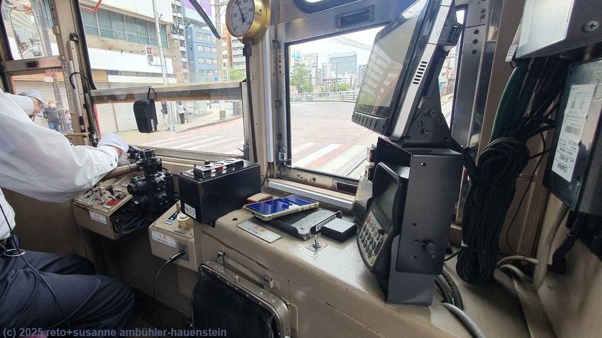 durch eine lebhafte strasse gelangen wir zur tramhaltestelle oura cathedral. mit einer älteren strassenbahn fahren wir bis zur tramhaltestelle meganebashi bridge.