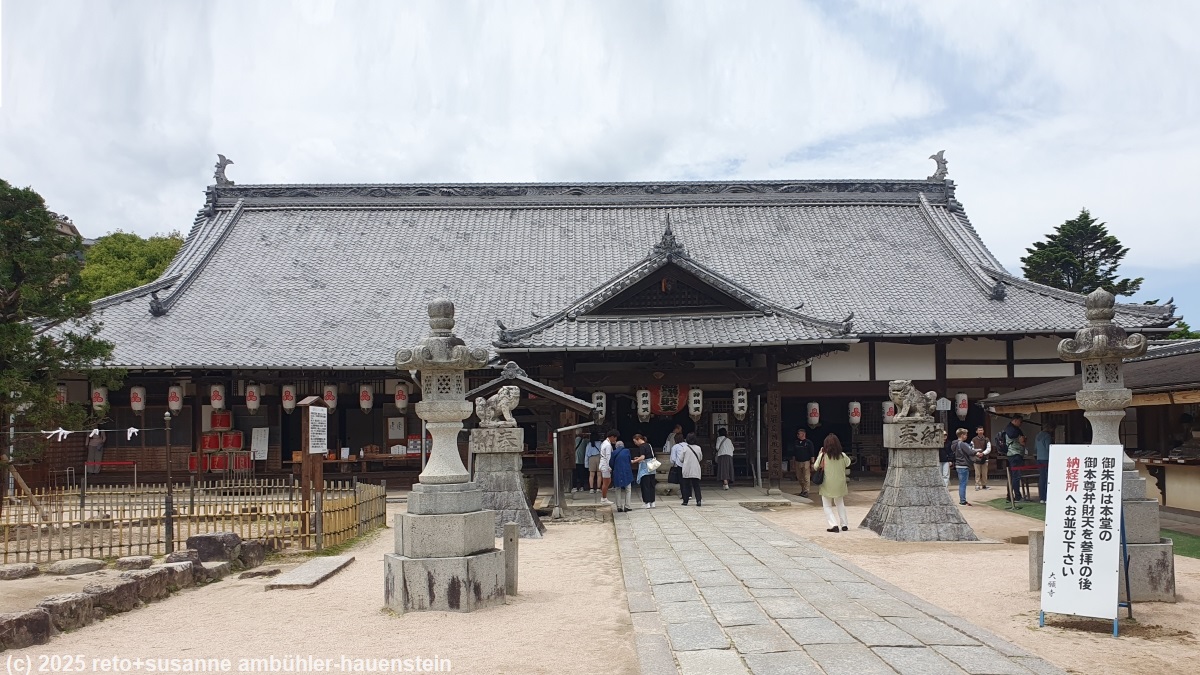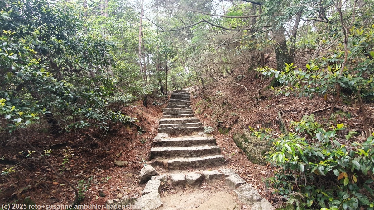 der pfad führt uns am daishoin tempel vorbei. nach einem kurzen besuch des tempels folgen wir dem "misen climbing path - daishoin course". in einem dichten wald geht es steil bergan. oft gehen wir über treppen mit sehr unregelmässigen stufen. im schatten der bäume ist es zwar angenehm kühl und wir sind auch vor dem wind geschützt, heiss wird uns trotzdem. wir sind etwas überrascht, wieviele menschen uns entgegen kommen. im hafen stand, die seilbahn sei wegen starkem wind nicht in betrieb, aber wir vermuten, sie läuft nun doch. um 12:45 uhr erreichen wir die misen hondo main hall kurz unter dem gipfel. hier hat es zahlreiche bänke. auf einer solchen essen wir zu mittag.