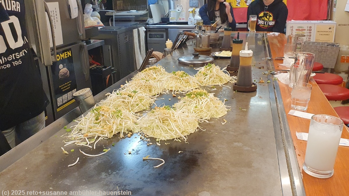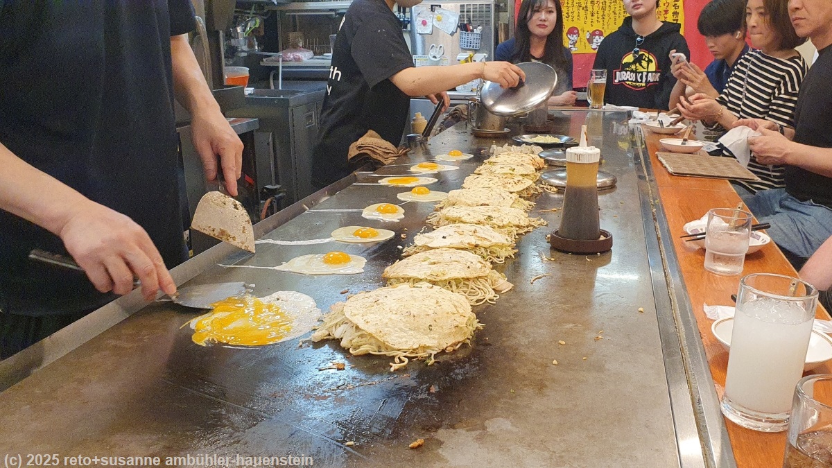 nach einer kurzen pause am ufer marschieren wir zum hafen und fahren mit der nächsten fähre zurück aufs festland. schon bald bringt uns ein zug zurück nach hiroshima. im bahnhof kaufen wir einige lebensmittel für morgen, dann gehen wir zum hotel. wir duschen uns, danach machen wir uns auf den weg richtung altstadt. susanne hat ein besonderes restaurant evaluiert. im zweiten anlauf finden wir den unscheinbaren eingang zum lokal okonomimura, welches über drei stockwerke verteilt ist. das essen wird auf einem heissen metalltisch zubereitet. der tisch ist an drei seiten von einer holztheke umgeben, hier sitzen die gäste. man kann zwischen verschiedenen varianten des gerichtes okonomiyaki - auch als japanische pizza bezeichnet - wählen. die meisten varianten haben fisch, crevetten oder austern drin, aber es gibt auch eine version mit gemüse, käse und schinken. diese ist genau nach unserem geschmack. wir können zuschauen, wie das essen zubereitet wird. das restaurant ist völlig überrannt, wohl mindestens 80% der gäste sind westler.