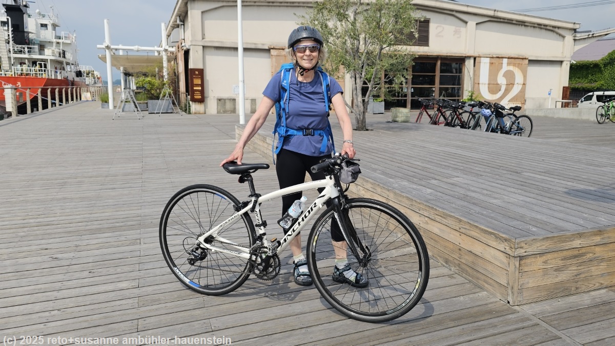 unser handy weckt uns um 07:30 uhr. das wetter sieht schon bedeutend freundlicher aus als gestern abend. es ist trocken und zwischen den wolken erkennen wir etwas blauen himmel. wir frühstücken im restaurant unseres hotels. auch hier gibt es müesli und etwas frische früchte. nach dem essen packen wir unsere rucksäcke. die beiden tagesrucksäcke nehmen wir mit auf die dreitägige radtour, die beiden grossen rucksäcke dürfen wir im hotel cycle lassen. dorthin begeben wir uns nun. nachdem die beiden grossen rucksäcke deponiert sind, übernehmen wir die fahrräder. susannes velo steht schon bereit, für mein rad begleitet mich eine dame vom empfang des hotels zum verleih giant am anderen ende des gebäudes. die räder werden als cross bikes bezeichnet, aber für mich sehen sie aus wie rennvelos. wir erhalten beide noch einen helm und einen ersatzschlauch, dann geht es los. bevor wir den "setouchi shimanami kaido" in angriff nehmen, machen wir noch je ein foto von uns und unserem bike. mein navi befestige ich behelfsmässig am lenker mit einem schubändel aus dem supermarkt.