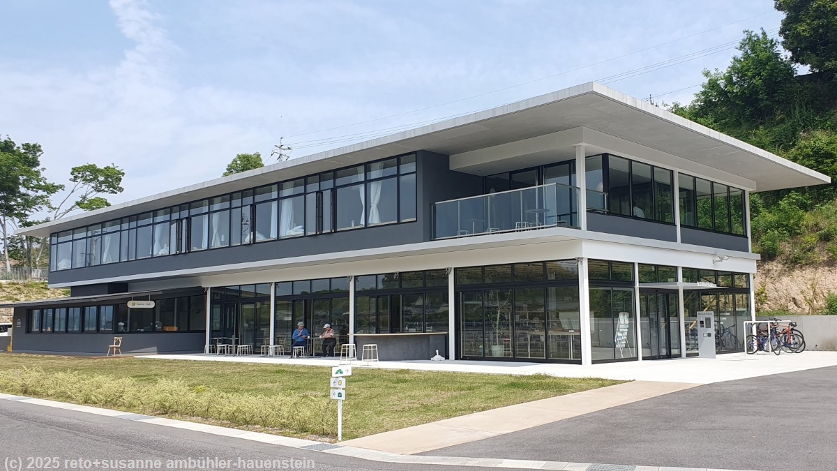 nachdem wir die brücke überquert haben, befinden wir uns auf der insel ikuchijima. auf dieser liegt auch unser tagesziel. wir folgen der nördlichen küste westwärts. neben der eher schmalen landstrasse hat es einen radweg. dieser ist allerdings ziemlich holprig. unsere räder haben keine federung und die reifen sind bretthart, da spürt man jede noch so kleine unebenheit. kurz nach 12:30 uhr bemerken wir etwas überrascht, dass wir nur noch 4 km vom tagesziel entfernt sind. wir wollten eigentlich unterwegs zu mittag essen, aber das hat sich gerade erübrigt. kurz vor 13 uhr sind wir beim hotel bonapool. wir werden freundlich empfangen, das zimmer ist jedoch noch nicht bezugsbereit. wir dürfen aber susannes rucksack hier deponieren. auf einem fotopunkt gerade neben dem hotel essen wir zu mittag. danach radeln wir ins ortszentrum um für heute abend und morgen lebensmittel einzukaufen. auf dem weg zum supermarkt kommen wir an einer autowerkstatt vorbei. durch das offenstehende garagentor sehe ich werkzeug herumliegen. während unserer heutigen radtour haben wir bemerkt, dass die sättel unserer fahrräder etwas zu tief eingestellt sind. mit hilfe der übersetzungsapp frage ich den mann im büro, ob wir uns einen imbuss-schlüssel ausleihen dürfen. er meint, wir sollen uns in der werkstatt nehmen, was wir brauchen. schon bald haben unsere sättel die richtige höhe, das ist toll. im lebensmittelgeschäft kaufen wir zwei menus, die wir heute abend im hotel in der mikrowelle zubereiten können. nach dem einkaufen fahren wir zum fluss setodasuido und finden an dessen ufer ein heimeliges cafe. kurz vor 15:45 uhr sind wir wieder beim hotel. nun ist das zimmer bezugsbereit. die dame am empfang gibt uns endlose anweisungen, von denen wir nur einen bruchteil verstehen. unser zimmer ist, wie das ganze hotel, sehr schön. ein film im eingangsbereich zeigt im zeitraffer die errichtung dieses gebäudes. es wurde erst vor etwas mehr als einem jahr fertiggestellt. die sanitäranlagen sind wunderschön. wir geniessen eine erfrischende dusche, danach liest susanne, ich führe die bücher nach. draussen wird das wetter immer sonniger, morgen wird ein schöner, aber sehr warmer tag. gegen 18 uhr gehen wir in die küche und bereiten in der mikrowelle das nachtessen zu. dieses schmeckt überraschend gut.