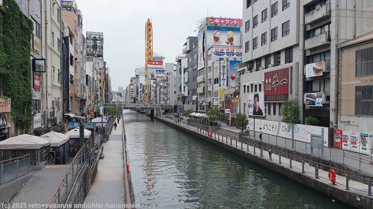 die fahrt mit dem shinkansen "hikari 574" von himeji nach shin-osaka dauert 29 minuten. shin-osaka ist der bahnhof der hochgeschwindigkeitszüge. von hier gelangen wir mit einem lokalzug zum hauptbahnhof. unser hotel ist mehr als 2 km von diesem entfernt. wir versuchen deshalb mit der metro näher zum hotel zu kommen. anfangs tun wir uns schwer, die richtige linie zu finden, denn auf unseren karten fehlen die nummern der stationen. als wir dann endlich einen brauchbaren plan des u-bahnnetzes finden, klappt es mit der anfahrt. diese wird dadurch verkompliziert, dass wir drei verschiedene linien nehmen müssen. mit viel intuition und etwas glück gelangen wir bis auf 150 meter an unser hotel, näher gehts nicht mehr. wir deponieren das gepäck im hotel, dann fahren wir mit der metro drei stationen südwärts. wir spazieren dem dotonbori river entlang. dieser fluss geht mitten durch das lebhafte stadtviertel dotonbori. auf dem wasser verkehren boote voll mit touristen. überhaupt hat es hier enorm viele leute. wir spazieren dem fluss entlang bis zur konzerthalle namba hatch. hier finden wir einen kleinen park - genau genommen ist es ein platz mit etwas grün darum herum und einigen sitzbänken. auf einer solchen picknicken wir. danach spazieren wir durch die dotonbori strasse wieder zurück. google map schreibt zu dieser verkehrsfreien strasse "as busy as it gets", besser kann man es wohl nicht beschreiben. es hat unglaublich viele leute aus allen herren länder. ob das immer so ist, oder ob das an der weltausstellung liegt, wissen wir natürlich nicht. in einem starbucks trinken wir einen kaffee. aus dem ersten stock haben wir eine tolle aussicht auf die belebte strasse.
