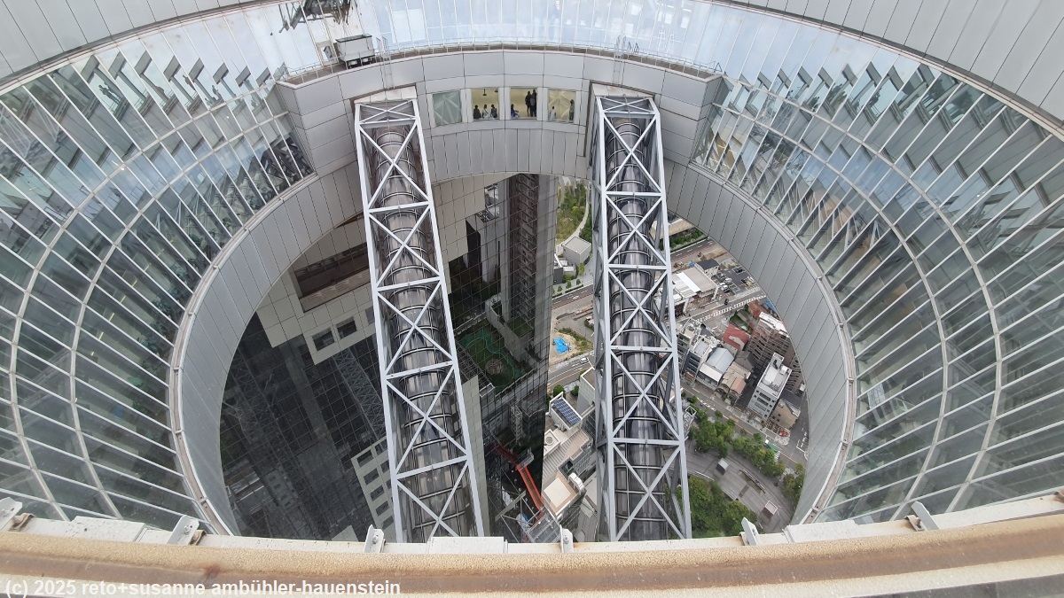 vom bahnhof osakajokoen fahren wir mit dem regionalzug zur osaka station. von da ist es nicht mehr weit bis zum umeda sky building. wir entdecken über einem kaufhaus eine terrasse, von welcher aus man bestimmt einen tollen blick auf das beeindruckende sky building hat. wir tun uns schwer, den zugang zur terrasse zu finden und als wir endlich oben sind müssen wir zu unserer enttäuschung feststellen, dass man das gebäude gar nicht richtig sieht. als wir endlich wieder draussen sind, machen wir uns auf den weg zum sky building. unter dem gebäude ist ein festival im gang. es hat duzende stände und auf einer bühne spielt eine gruppe hawaiianische musik. zu meiner überraschung gibt es keine warteschlange beim aufzug. die ersten drei stockwerke müssen wir mit rolltreppen erklimmen. dann geht es mit einem aufzug zum 35. stock hinauf. eine weitere rolltreppe bringt uns zum 39. stock. nachdem wir den eintritt bezahlt haben, dürfen wir uns auf der plattform umsehen. auf der unteren ebene der plattform hat es ein restaurant. wir erfrischen uns mit einem getränk und geniessen die aussicht über die stadt. danach begeben wir uns auf die obere plattform, welche im freien ist. die rundsicht auf die stadt ist atemberaubend. leider ist der himmel leicht bedeckt, die sonne ist gerade knapp zu erkennen. nachdem wir die plattform einmal umrundet haben, lassen wir uns mit dem aufzug wieder auf den festen boden hinunterbringen.