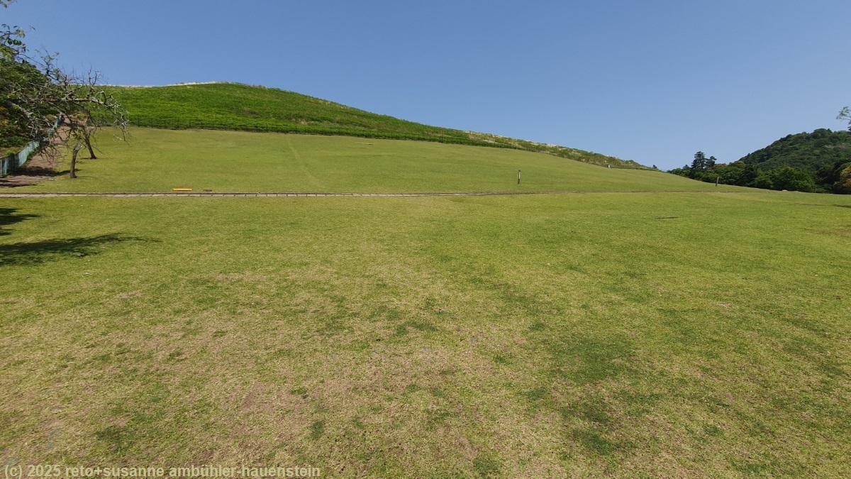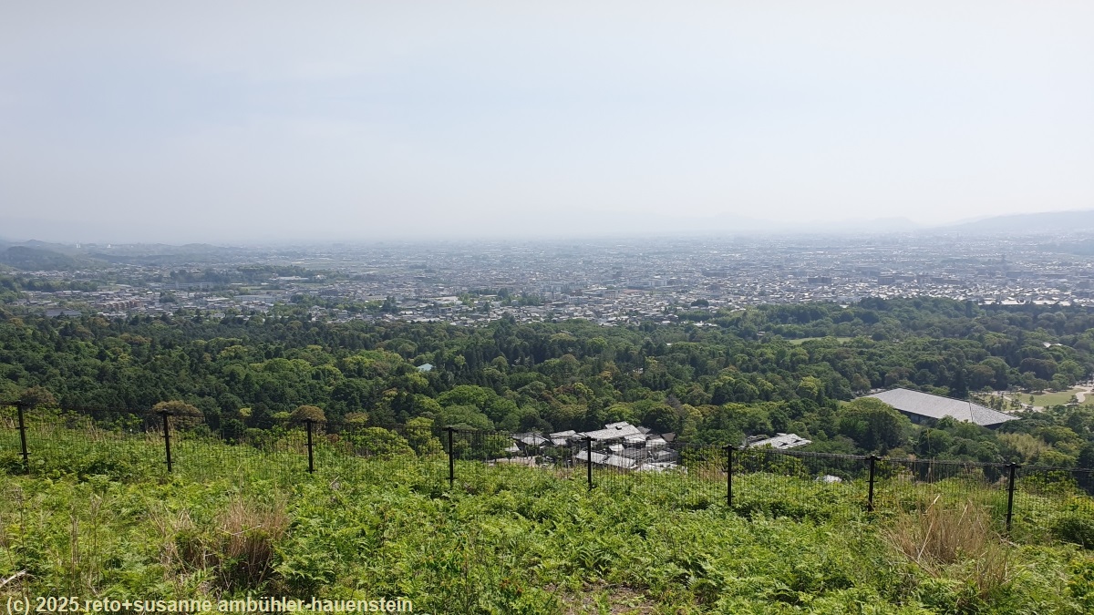 erst durch einen angenehm kühlen wald und dann über eine strasse ohne schatten geht es südwärts. wir erreichen den nara park. hier führt eine lange treppe auf einen hügel hinauf. wir wollen uns diesen kleinen umweg nicht entgehen lassen und erklimmen die steile treppe. diese folgt glücklicherweise dem waldrand und ist daher im schatten. auf kurzer distanz erklimmen wir 130 höhenmeter. vom aussichtspunkt knapp unter dem höchsten punkt haben wir eine fantastische rundsicht über die stadt. auch heute ist die fernsicht getrübt. wir sind uns nicht sicher, ob es wirklich so viel feuchtigkeit in der luft hat, oder ob das nicht eher smog ist. vom aussichtspunkt geht es wieder über eine lange treppe abwärts.
