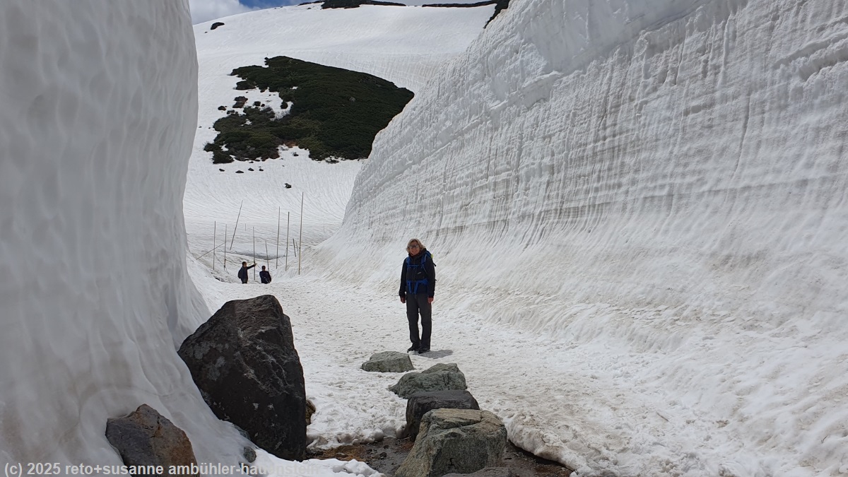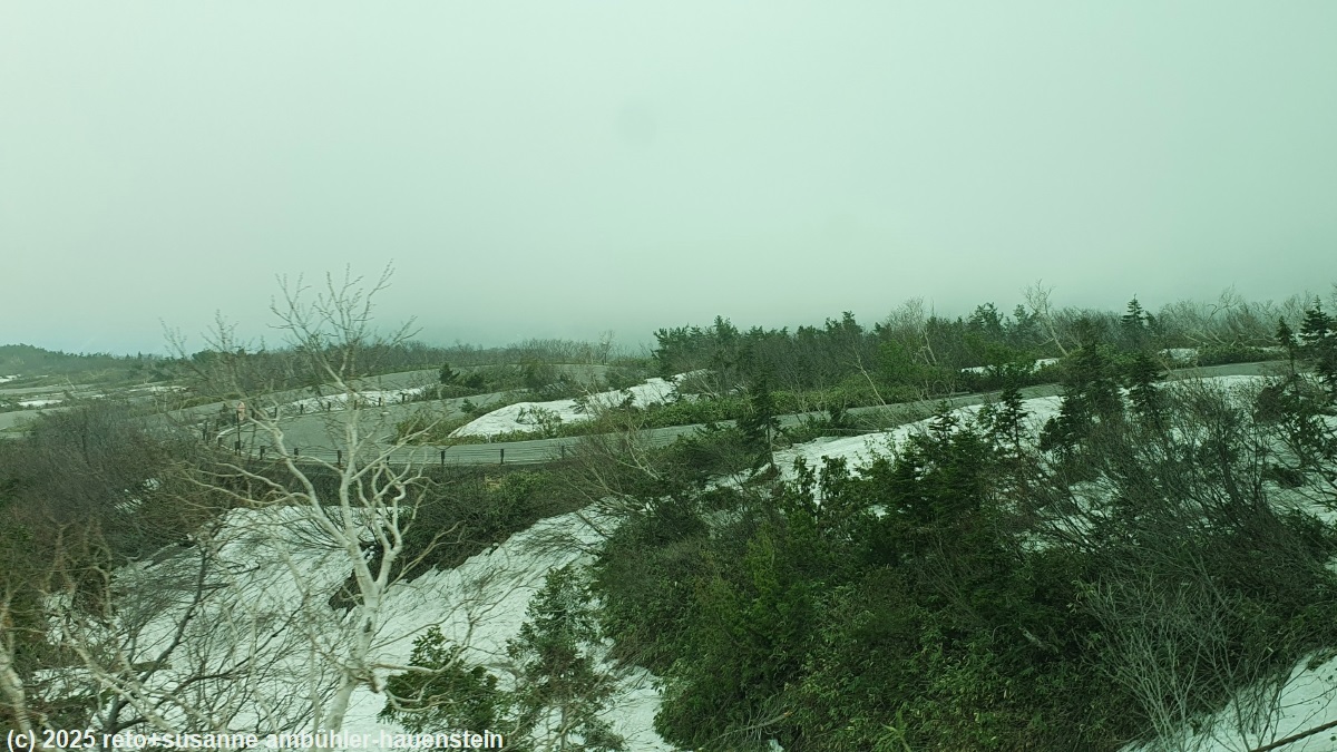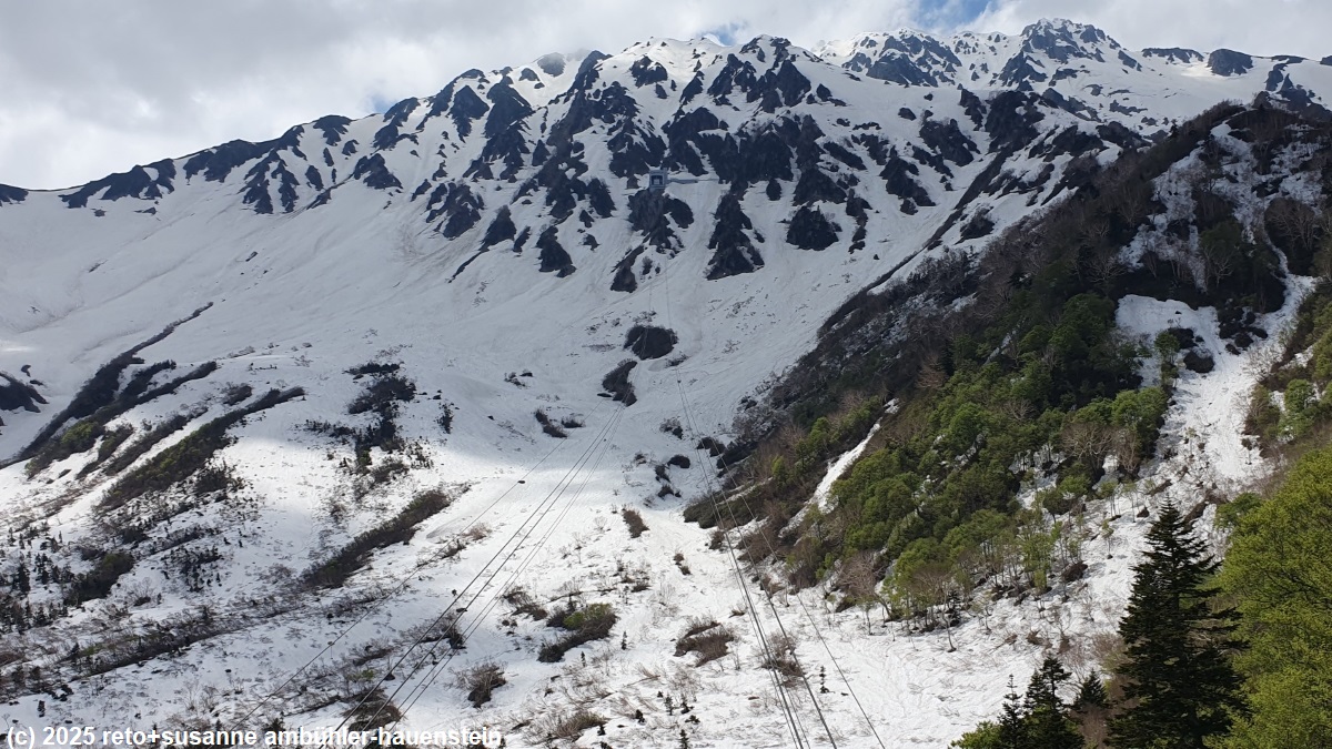 die standseilbahn ist zwar gut besetzt, aber nicht ganz voll. der bähnler am eingang meint zwar, wir hätten die 9-uhr-bahn verpasst, lässt uns aber einsteigen. die fahrt zur bergstation bijodaira dauert 10 minuten. die ganze strecke bis auf die letzten paar meter vor der bergstation verläuft in einem tunnel. in bijodaira steigen wir in den tateyama highland bus um. dieser bringt uns in 50 minuten nach murodo, dem mit 2450 m.ü.m. höchsten punkt der alpine route. die fahrt über die schmale und kurvenreiche strasse ist fantastisch. für privatwagen ist die strasse gesperrt, es sind nur busse unterwegs. auf etwa 1500 m.ü.m erreichen wir die ersten schneefelder. manche bäume sehen etwas mitgenommen aus vom vielen schnee. wir fahren durch einen wunderschönen wald, der sich mit zunehmender höhe laufend verändert. besonders fallen mir die japanischen birken auf, die deutlich grösser sind, als die birken auf dem schwedischen fjäll. kurz vor ankunft in murodo fahren wir zwischen bis zu 15 m hohen schneemauern hindurch, das ist sehr beeindruckend.