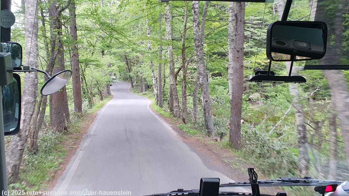 um 16:45 uhr sind wir wieder bei der bushaltestelle. eine viertelstunde später fährt der bus, der uns zum parkplatz zurück bringt. auf dem weg zu unserem tagesziel fahren wir auf der E67 durch den selben tunnel, durch den auch der bus gefahren ist. vor dem zweiten tunnel biegen wir aber rechts ab und bleiben so auf der strasse 158. diese führt uns kurvenreich und durch zahlreiche tunnels richtung matsumoto. nach 20 km sollten wir in die strasse 84 abbiegen. weil die abzweigung zwischen zwei tunnels liegt und rechtsabbiegen verboten ist, müssen wir auch durch das zweite tunnel fahren, dann bei einer schlaufe wenden und nochmals durchs zweite tunnel fahren. nun dürfen wir nach links in die strasse 84 abbiegen (zur erinnerung: in japan wird links gefahren). diese ist nicht weniger kurvenreich und führt in mehreren haarnadelkurven bergwärts.