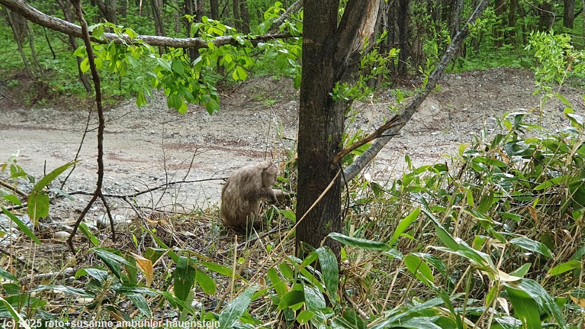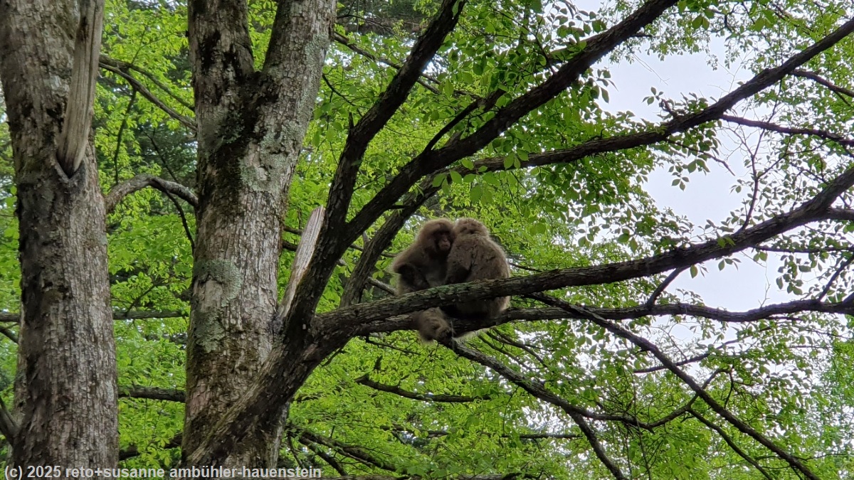 diese strasse ist für den privatverkehr gesperrt, deshalb müssen alle besucher mit dem bus nach kamikochi fahren. alternativ kann man auch ein taxi nehmen oder die strecke mit dem fahrrad bewältigen. am ende der stichstrasse starten wir zu einer kurzen rundwanderung. wir überqueren den azusa river und folgen einem wanderweg parallel zum fluss. trotz regenwetter sind erstaunlich viele leute unterwegs. wir gehen durch einen wunderschönen wald. manche abschnitte führen über planken, ähnlich wie wir das von schweden kennen. nach 75 minuten erreichen wir die brücke beim myojin teich. wir gehen über die gleichnamige brücke und marschieren auf der anderen flussseite wieder richtung bushaltestelle. plötzlich entdecken wir neben dem weg einen affen, der sich an blätter gütlich tut. erst jetzt bemerken wir, dass es hier einige dieser tiere hat. manche sitzen am boden, andere klettern auf den bäumen umher oder ruhen sich aus. eines dieser tiere kommt uns auf dem wanderweg entgegen, nimmt aber überhaupt keine notiz von uns.