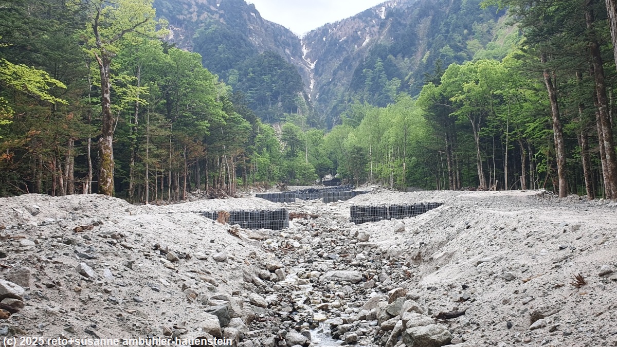 wir stehen kurz vor 8 uhr auf, so dass der wecker unseres handies gar nicht dazu kommt, unseren schlaf zu beenden. wir frühstücken im hotelrestaurant, danach packen wir zusammen und tragen unser gepäck zum wagen. das wetter ist freundlich, der himmel leicht bewölkt. wir fahren auf der strasse 41 südwärts. in der stadt werden wir wie gewohnt von duzenden von ampeln ausgebremst. in einem riesigen supermarkt gehen wir einkaufen. dieses mal benötigen wir nicht bloss zutaten für unser mittagessen, sondern auch um zweimal zu frühstücken und zweimal abendessen zu kochen, denn in unserer unterkunft für die kommenden zwei nächte gibt es keine verpflegung. das einkaufen im supermarkt ist deutlich einfacher, als ein restaurant fürs nachtessen zu finden, denn es gibt alle lebensmittel, die wir schätzen und haben möchten. auf dem weiteren weg richtung matsumoto kommen wir nun flüssiger voran. nachdem wir die letzten ampeln hinter uns haben, geniessen wir weitgehend freie fahrt. es hat sehr wenig verkehr, bloss ab und zu eine baustelle mit einspuriger verkehrsführung. auch bei diesen ampeln hat es immer einen countdown, so dass man stets weiss, wie lange man warten muss. manchmal hat es keine ampel, sondern männer, welche mit flaggen den verkehr regeln. wir fahren auf der strasse 41 durch das wunderschöne tal des takahara river. leider wird das wetter zusehends trüber. über den bergen hangen graue wolken und verdecken die gipfel. kurz vor kamioka wechseln wir auf die strasse 471. im ort tanken wir ein erstes mal unseren nissan auf. wir werden von einem sehr freundlichen mann bedient. als er mir die kreditkarten-abrechnung in die hand drückt, frage ich mich, ob er den tank wirklich voll gemacht hat. unser wagen hat für 454 km genau 20.00 liter benzin verbraucht, das entspricht 4.4 l auf 100 km - unglaublich. die fahrt nach hirayu verläuft weiterhin sehr entspannt. wir erreichen den ort gegen 12:45 uhr. von hier kann man mit einem bus nach kamikochi fahren, dem ausgangspunkt für kleinere und grössere wanderungen. der bus fährt immer zur halben und zur vollen stunde. wir wollen erst zu mittag essen und dann den 13:30 uhr bus nehmen. wir ziehen uns zuerst um und essen dann auf einer bank vor dem besucherzentrum unsere sandwiches. während wir unsere brote verzehren fällt man blick auf ein schild am eingang zum parkplatz. da steht, dass man hier nur 90 minuten parkieren darf. wenn man mit dem bus nach kamikochi fahren will, muss man seinen wagen auf einem ein kilometer entfernten parkplatz stehen lassen. das passt jetzt gar nicht in unseren zeitplan. eine dame beim schalter der information bestätigt uns, dass die parkplätze hier nur für besucher der läden gedacht sind, dass aber der bus nach kamikochi auch beim parkplatz hält. daher parkieren wir unseren wagen so wie es gedacht ist und warten an der haltestelle auf den bus. "unser" bus ist aber gerade weg, denn er fährt beim parkplatz einige minuten früher als oben beim besucherzentrum. wir müssen deshalb auf den 14 uhr bus warten. inzwischen hat regen eingesetzt, das wird ein trüber nachmittag. die fahrt nach kamikochi ist ziemlich spektakulär. erst geht es durch zwei lange tunnel, dann über eine äusserst schmale und kurvenreiche strasse zum ort.