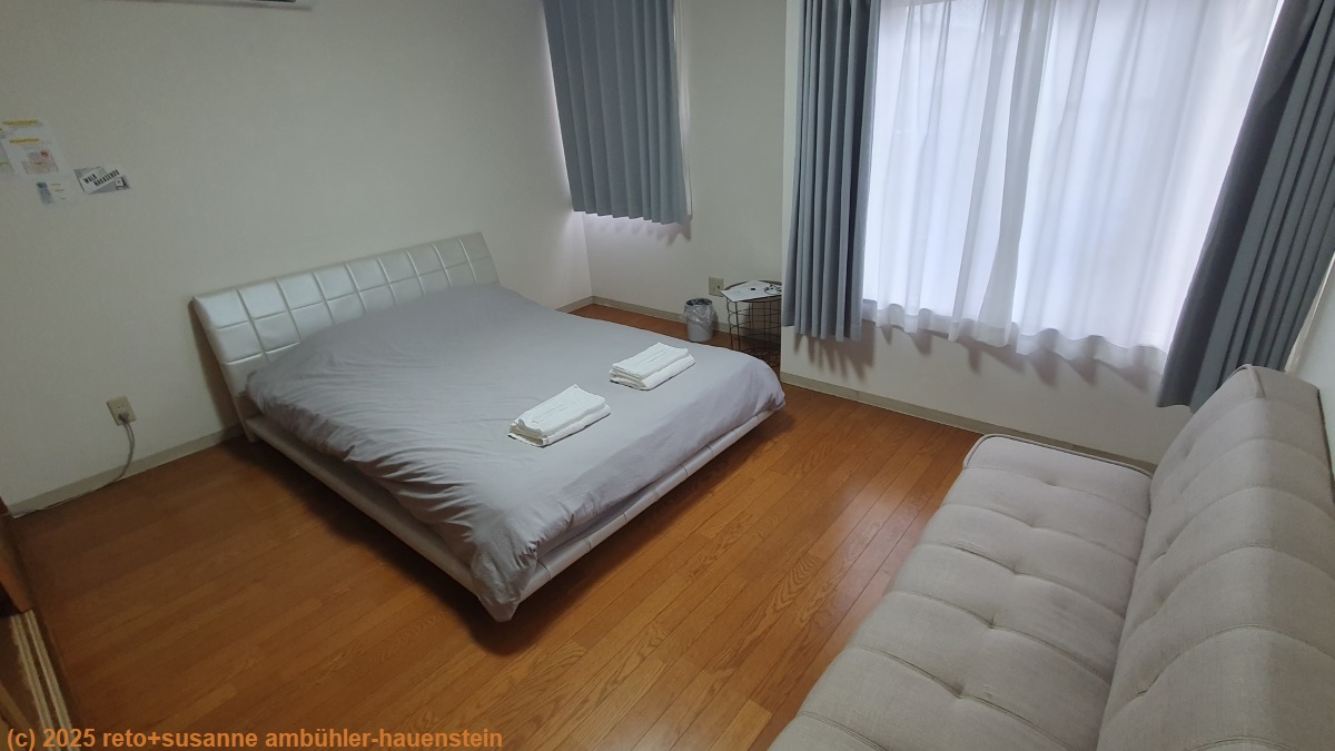gegen 15:30 uhr erreichen wir unser tagesziel nakatsugawa. da unsere unterkunft keine parkplätze anbietet, parkieren wir unseren wagen beim einkaufszentrum valor ganz in der nähe. von da marschieren wir erst zur unterkunft. wir haben etwas mühe, diese zu finden, denn wir haben bloss einen namen in japanischer schrift. in der email mit der reservationsbestätigung gibt es zwar einen link zur wegbeschreibung, aber der eingang ist so unscheinbar, dass wir erst daran vorbeigehen. schliesslich haben wir das haus gefunden. an der tür steht, dies sei ein unbedientes gasthaus, die zugangcodes für den haupteingang und die zimmertüre würden einem per email zugestellt. tatsächlich finde ich im posteingang eine nachricht von dieser unterkunft mit den zahlenkombinationen. das zimmer ist schlicht aber schön und zweckdienlich.