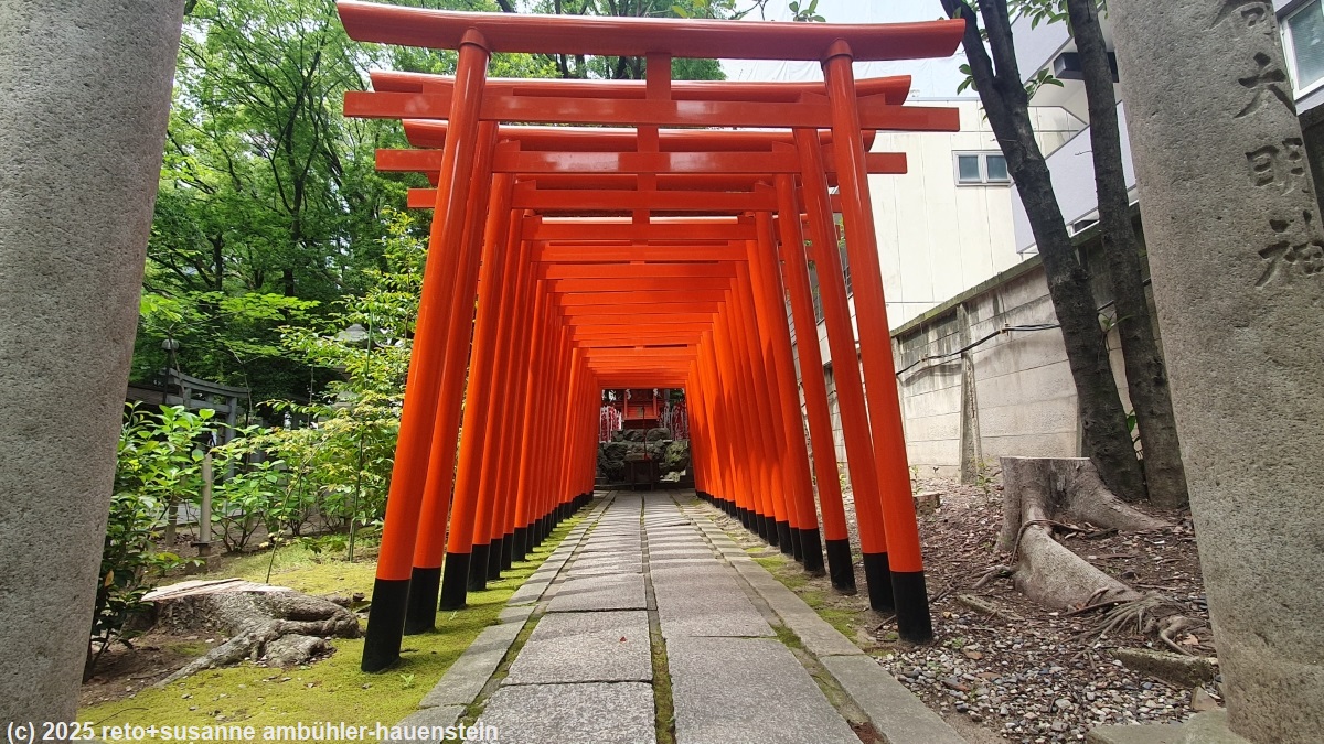 rund um den park hat es schattenspendende bäume, aber die parkbänke stehen alle in der sonne, wie ungeschickt. wir setzen uns auf einen betonklotz im schatten und geniessen unser mittagessen. anschliessend setzen wir unseren stadtrundgang fort. auf dem weg zum hisaya odori park kommen wir am wakamiya hachimansha schrein vorbei.