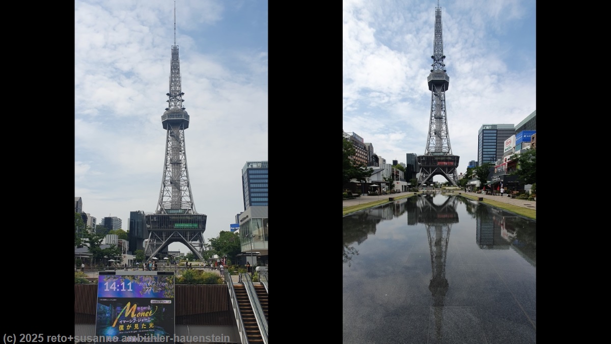 obwohl es früh am morgen plötzlich ziemlich unruhig wurde im haus, sind wir beim frühstück vermutlich die einzigen in der unterkunft. wir verlassen nakatsugawa kurz nach 09:15 uhr. in der stadt hat es ziemlich viel verkehr, aber die fahrt über die autobahn ist sehr entspannt. in nagoya kommen wir trotz der vielen autos gut zum autoverleih mitten im stadtzentrum. die rückgabe des nissans ist rasch erledigt. wir deponieren unser gepäck im hotel und beziehen danach im bahnhof die fahrkarten für die morgige weiterreise. vom JR tower haben wir ein erstes mal eine schöne aussicht auf die stadt. danach marschieren wir zum science museum und picknicken im schatten der bäume. durch den hisaya odori park gelangen wir zum TV turm. hier hat es 90 m über dem boden eine aussichtsplattform, von der wir wiederum eine tolle aussicht über die riesige stadt haben. nach einer kurzen erfrischung besuchen wir den honmaru palast und bewundern die zahlreichen kunstvollen malereien. nach einem spaziergang rund ums schloss fahren wir mit der metro zurück zum bahnhof. im hotel erfrischen wir uns unter der dusche und ich ruhe mich etwas aus. um 18 uhr machen wir uns auf den weg zum towers plaza, wo wir das nachtessen geniessen. danach besuchen wir das starbucks cafe und haben zum dritten mal heute eine wundervolle aussicht auf nagoya, diesmal bei nacht. zurück im hotelzimmer kaufen wir die fahrkarten für die reise von hakodate nach sapporo. gegen 23 uhr sind wir im bett.