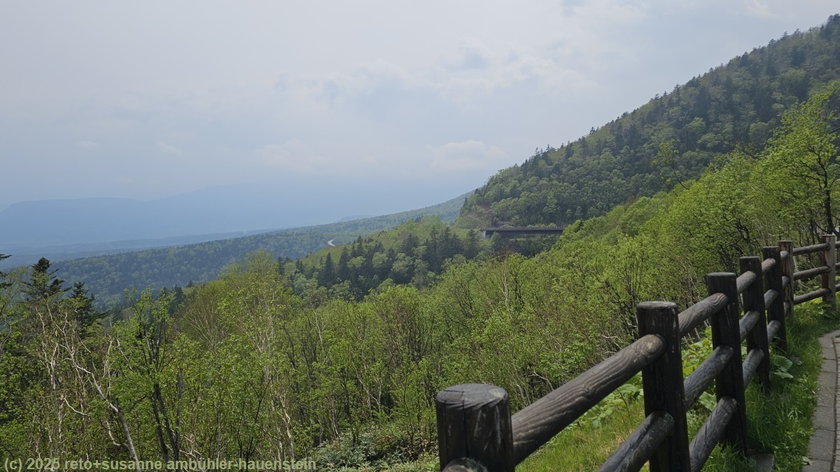 wir schlafen bis kurz nach 08:30 uhr. die nacht war äusserst ruhig und das bett im alkoven sehr angenehm. als wir aufstehen ist es trocken, aber der himmel ist, wie schon seit tagen, mit grauen wolken verhangen. wir frühstücken im camper, fast so wie zuhause. nur das brot kann halt nicht mithalten. gegen 10:20 uhr machen wir uns auf den weg richtung daisetsuzan national park, siehe auch karte. in kamikawa stoppen wir kurz, um noch einige lebensmittel einzukaufen. danach folgen wir der national highway route 39. diese strasse führt durch das tal des ishikarigawa river. in der gegenrichtung sind einige fahrzeuge unterwegs, aber in unsere fahrtrichtung sind wir meistens ziemlich alleine unterwegs. gegen 11:25 uhr erreichen wir den lake daisetsu. über die national highway route 273 geht es dem westlichen ufer des sees entlang. wir wollten eigentlich zum daisetsu kogen onsen fahren, ein ort, der gemäss reiseführer ein hervorragender ausgangspunkt für wanderungen sein soll, aber die strasse ist gesperrt. offenbar wird sie erst mitte monat geöffnet. das ist zwar schade, aber bei dem heutigen wetter hätten wir wohl höchstens eine kurze wanderung gemacht. so bleiben wir auf der strasse 273, welche nun kurvenreich und durch zahlreiche tunnels richtung passhöhe führt. leider hat wieder regen eingesetzt. dieser wird immer heftiger, verbunden mit stürmischem wind. bei einem winzigen cafe auf dem 1130 meter hohen mikuni pass machen wir halt. wir trinken einen kaffee und essen dazu einen leckeren käsetoast. als wir gegen 12:45 uhr wieder aus dem kleinen häuschen treten, hat der regen aufgehört und wir sehen einige sonnenstrahlen.
