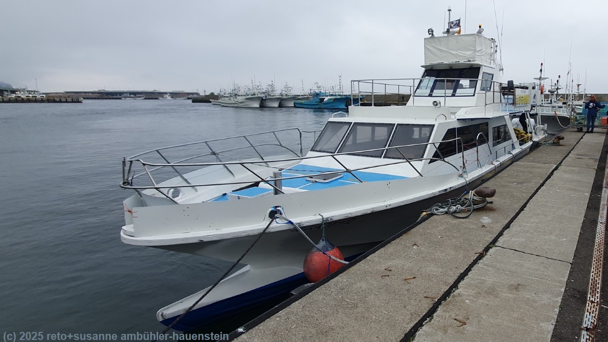 unser handy weckt uns um 06:45 uhr. der himmel ist verhangen, die wolkenschicht liegt so tief, dass wir den nahen turm nicht sehen können. wir fragen uns, ob die whale watching tour bei diesem wetter wohl durchgeführt wird ? da wir keine email mit einer absage erhalten haben, stehen wir auf und frühstücken. um 08:15 uhr machen wir uns auf den weg zum büro der whale watching firma gojiraiwa kanko in rausu. als wir dort ankommen, stehen schon mehrere autos vor dem geschäft. wir bezahlen für die tour und fahren dann mit unserem camper zum nahen hafen. dort werden wir bereits erwartet. beim einsteigen wird uns eine schwimmweste ausgehändigt, dann nehmen wir im kleinen oberdeck platz. die vier bänke sind rasch voll. das boot verlässt den hafen zusammen mit schiffen anderer firmen. unser kapitän steuert erst etwa 6 km geradewegs ins offene meer hinaus, dann folgt er der küste nordwärts. die insel kunashiri ist keine 20 km entfernt. sie gehört eigentlich zu japan, wurde aber von russland besetzt. je länger wir unterwegs sind, umso dichter wird der nebel. ausser zwei albatrossen und hunderten von möven gibt es nichts zu sehen. schliesslich wendet der kapitän das boot und fährt wieder südwärts. zumindest die sicht wird besser, selten sehen wir die sonne durch die wolkenschicht. mehr als die hälfte der tour ist bereits vorbei, als zum ersten mal leben in die passagiere kommt. jemand hat zwei oder drei delfine entdeckt. der kapitän verfolgt die tiere für mein empfinden etwas gar aggressiv, manchmal tauchen die delfine knapp neben dem boot auf. wir können sie eine weile beobachten, fotografieren ist mit dem handy kaum möglich. auch mit einer richtigen kamera muss man enorm schnell reagieren, denn die tiere sind immer nur für einen kurzen augenblick zu sehen. schliesslich setzen wir unsere fahrt fort. die meisten passagiere auf dem oberdeck und auch zwei besatzungsmitglieder suchen weiterhin krampfhaft die wasseroberfläche ab. da taucht plötzlich ein kleiner zwergwal auf. dieses mal hält der bootsführer mehr abstand. irgendwann entdecke ich den wal auf der anderen bootsseite. ich versuche erst gar nicht, fotos zu machen, aber susanne gelingen einige schnappschüsse, auf denen der wal deutlich zu sehen ist. ein zweites boot gesellt sich zu uns. wir halten weiterhin angestrengt ausschau und sehen den wal noch zwei drei mal auftauchen, dann ist er verschwunden. es ist zeit, die rückfahrt anzutreten. auf dem weg zum hafen sehen wir noch eine ganze schule delfine, aber die besatzung nimmt keine notiz mehr. um 11:30 uhr sind wir wieder an land.