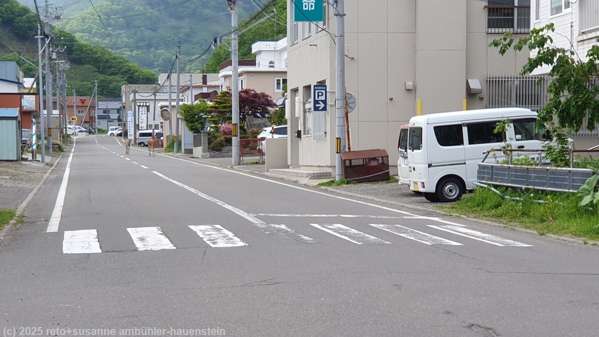 die rückfahrt nach rausu ist sehr entspannt. die strasse ist allerdings in einem üblen zustand mit zahlreichen schlaglöchern und belagsschäden. wir parkieren wieder in der road side station und marschieren zum kleinen supermarkt, wo wir neben einigen lebensmitteln tatsächlich auch zwei neue gasflaschen für unseren camper erhalten. wir spazieren durch den ort und trinken in einem hübschen kleinen cafe einen kaffee, ich esse dazu ein stück kuchen. als wir bezahlen, fragt uns die dame, die das cafe führt, woher wir kämen. als wir antworten, wir seien aus der schweiz, meint sie, wir seien ihre ersten gäste aus diesem land. sie ist so begeistert, dass sie ein selfie mit uns machen möchte. wir verlassen das cafe und folgen weiter der dorfstrasse. da sehen wir vielleicht 100 meter von uns entfernt zwei rehe mitten auf der strasse. wir beobachten sie interessiert. sie kommen erst auf uns zu, dann sind sie plötzlich verschwunden. neugierig gehen wir näher und entdecken die beiden zwischen den wohnhäusern, wo sie sich in einem garten an den pflanzen gütlich tun. kein wunder, gibt es japaner, die den wolf wieder einführen möchten, damit sie die rehe dezimieren.