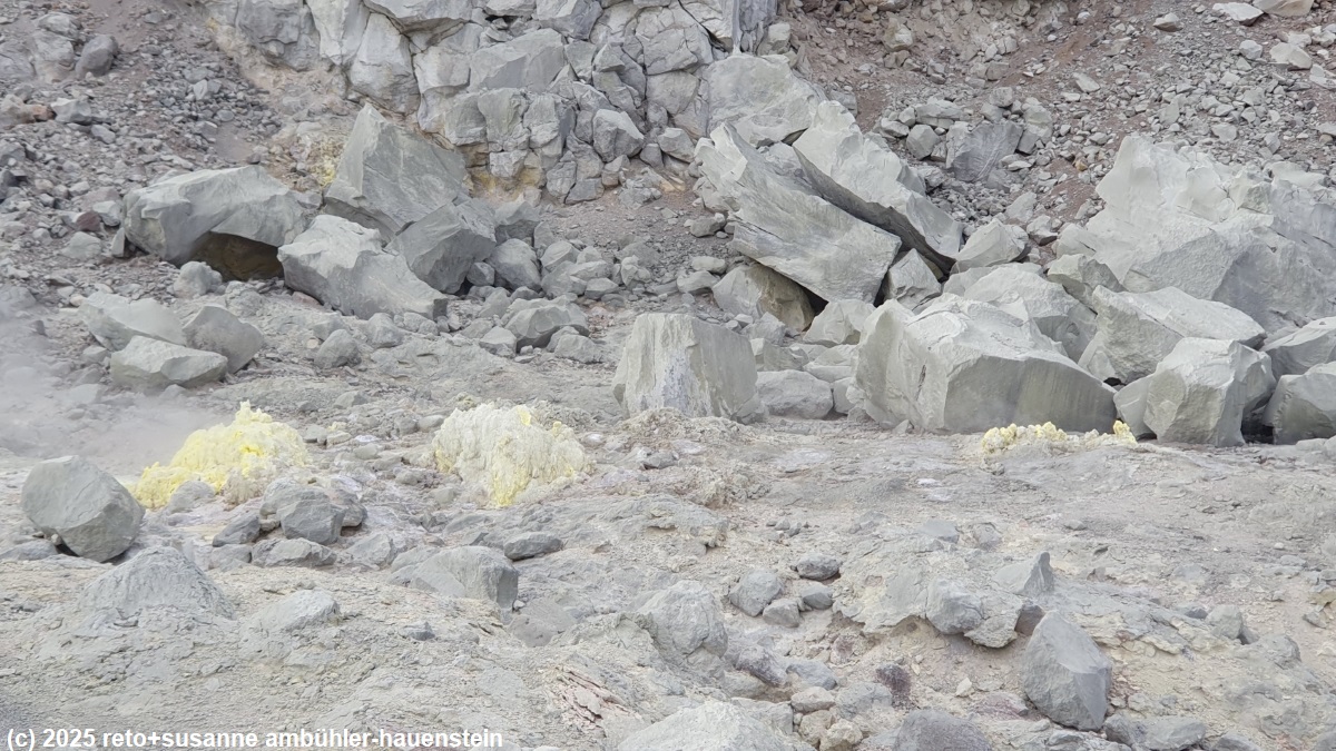 in der nähe des rest houses hat es mehrere stellen, an welchen dampf aus dem boden steigt. das gestein zeigt die typische gelbe farbe von schwefel. wir spazieren ein kurzes stück über den tsutsujigahara nature trail richtung kawayu visitor center, dann bewundern wir noch die dampfenden fumarolen.