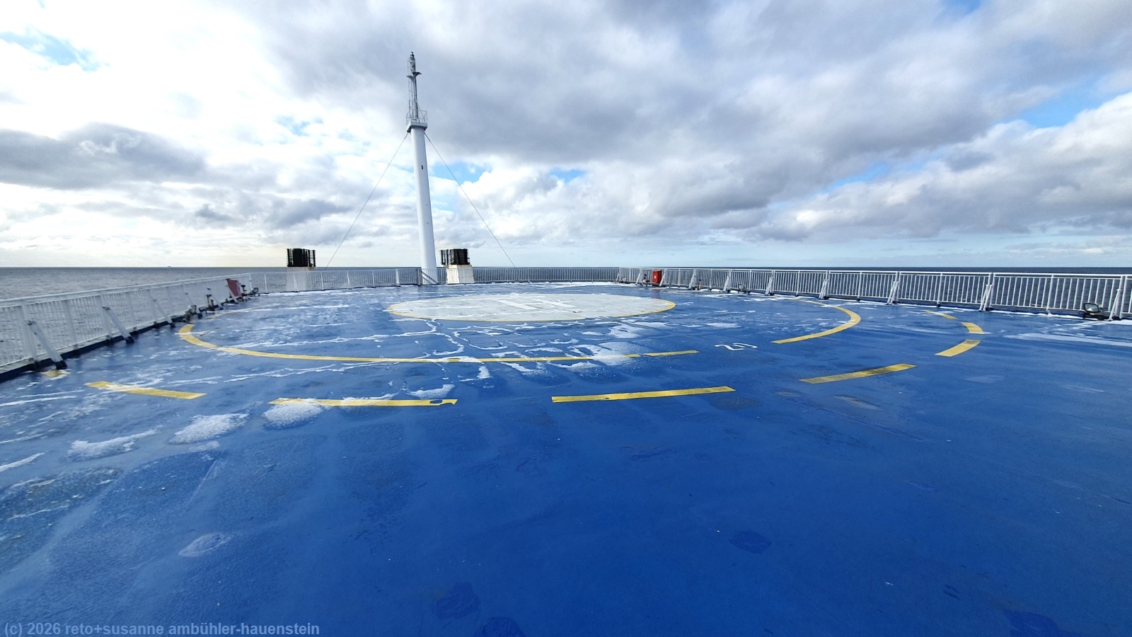obwohl sich unsere kabine gerade neben den hundezwinger befindet, war die nacht sehr ruhig. wir haben gut geschlafen. unser handy weckt uns um 9 uhr finnische zeit. eine halbe stunde später sind wir im restaurant. das frühstücksbuffet präsentiert sich wie gewohnt. wir haben einen tisch am fenster zugewiesen erhalten, das ist angenehm. der himmel ist bewölkt und vorwiegend grau. das meer wirkt ziemlich ruhig, die fähre schaukelt kaum spürbar. nach dem essen setzen wir uns an einen tisch in der cafeteria und arbeiten an unseren computern. gegen 12:30 uhr besuchen wir nochmals das restaurant und essen eine kleinigkeit. es ist sehr angenehm, dass das essenspaket nun auch das mittagessen einschliesst, das war früher nicht so. nachdem wir gespiesen haben, ziehen wir warme kleider über und gehen auf das oberdeck. es bläst ein kühler, steifer wind. der boden des aussendecks ist mit gefrorenem wasser und schnee bedeckt und enorm rutschig. der kräftige wind macht es uns schwer, über das deck zu gehen. im windschatten der brücke lässt es sich aushalten. der wind treibt mehrere wolkenschichten über den himmel, dazwischen hat es kleine blaue löcher. einen kurzen moment scheint die sonne, wir versuchen, einige bilder zu machen. das thermometer im windschatten zeigt genau null grad.
