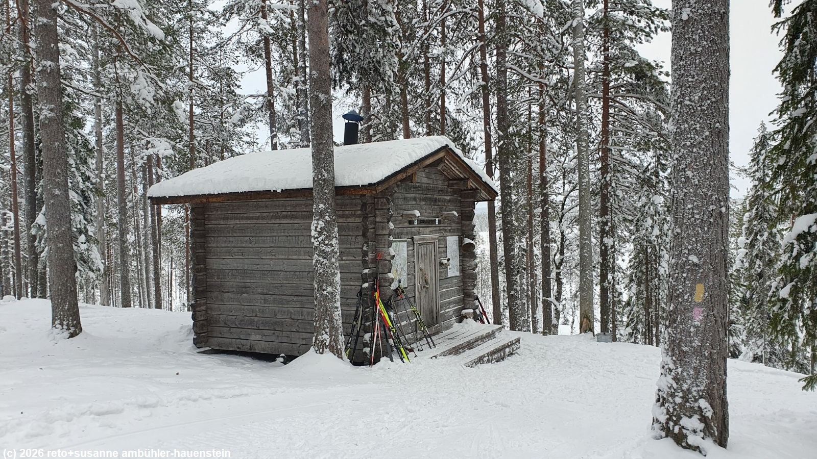 unser handy weckt uns um 07:45 uhr. wir haben beide sehr gut geschlafen. obwohl das appartement neben uns bewohnt ist, war die nacht absolut still. entsprechend der wettervorhersage erwartet uns eine kompakte wolkenschicht. wir sehen zwar im laufe des tages einige blaue flecken am himmel und die wolkenschicht ist so dünn, dass wir immer wieder den eindruck haben, jetzt wird es bald sonnig, aber es wird nichts mit sonne heute. als wir uns um 09:45 uhr auf den weg zum skizentrum iso-syöte machen, liegt die temperatur bei -6°C. beim ski- und bikeverleih ist mehr los, als ich erwartet habe. die kundschaft vor uns scheint ein schwieriger fall zu sein, so dass wir uns lange gedulden müssen. dafür geht es dann bei uns sehr speditiv. die schuhe durften wir schon selber auswählen, der mann vom verleih braucht uns bloss noch skis und stöcke auszuhändigen. kurz nach 10:30 uhr sind wir startbereit. eine freundliche finnin hilft uns, den einstieg zur loipe zu finden, siehe auch interaktive loipenkarte region iso-syöte. die ausrüstung fühlt sich gut an. am luppovesi vorbei laufen wir erst nord- und dann westwärts. nach einer halben stunde sind wir beim besucherzentrum des syöte nationalpark. auf der website der pytky ranch hatten wir gelesen, dass dieses geschlossen sei und so ist es auch. daher setzen wir unsere runde nach einem kurzen halt fort. wir laufen durch einen herrlich verschneiten winterwald. die spur ist in sehr gutem zustand. der erste abschnitt unserer heutigen runde führt uns um den berg iso-syöte. nachdem wir dreiviertel des berges umrundet haben, befinden wir uns südlich des iso-syöte. hier beginnt eine 10 km lange zusatzschleife richtung salmentakanen. kurz vor 12:15 uhr erreichen wir die kleine schutzhütte riihitupa.