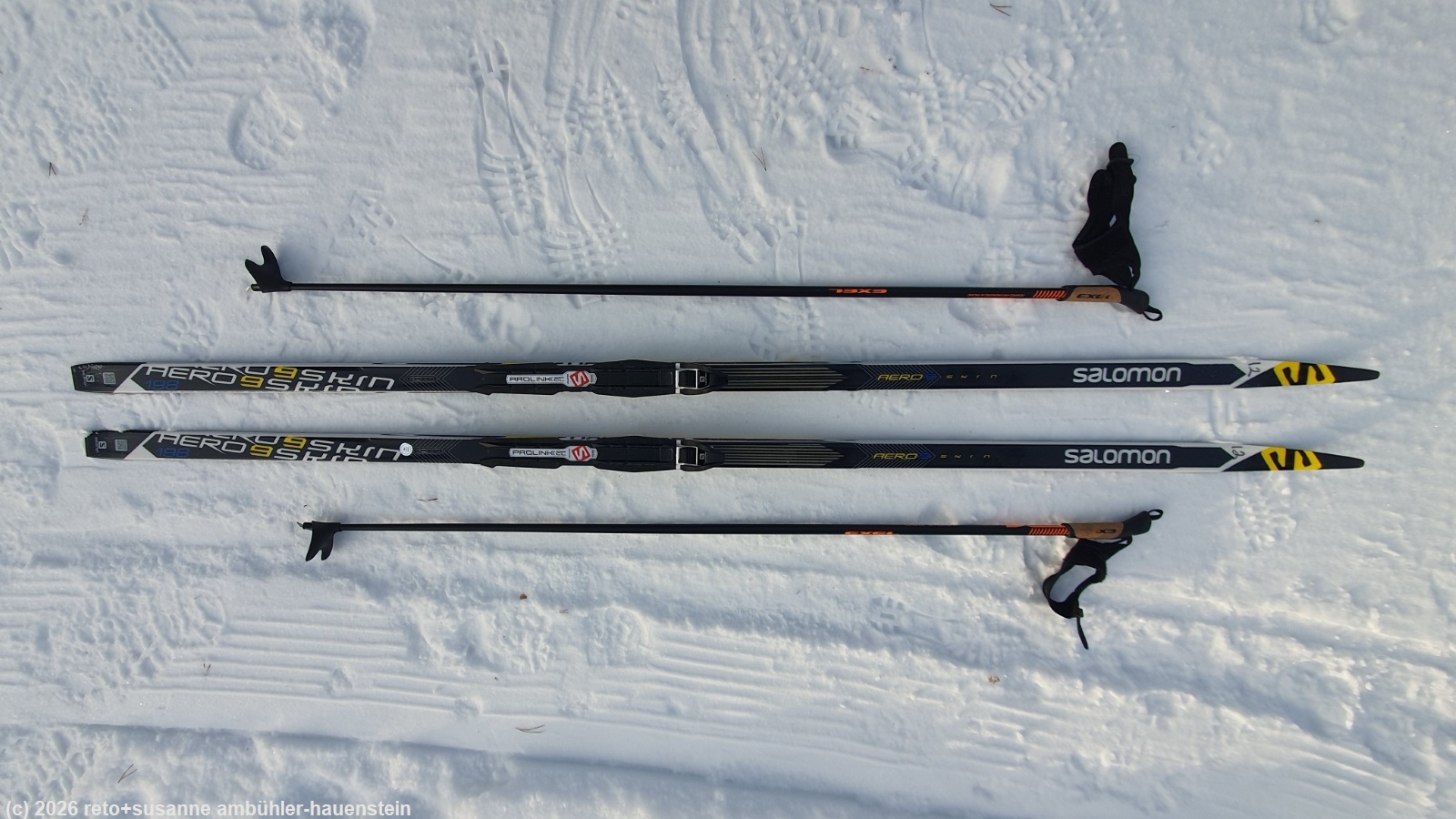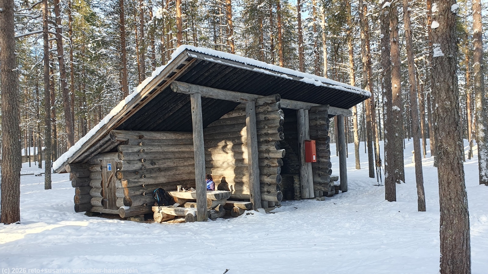 wir stehen um 8 uhr auf und frühstücken in unserem haus. es kündigt sich ein sonniger tag an. um 10 uhr sind wir beim empfang des campingplatzes und übernehmen die langlaufausrüstungen. eine halbe stunde später starten wir zu unserer heutigen runde. wir laufen erst über den hossanjärvi und dann über eine halbinsel. auf dem see ist die loipe in sehr gutem zustand, hier im wald wird es etwas holprig. wir kommen aber gut zurecht. über das nördliche ende des öllöri gelangen wir zum besucherzentrum des hossa nationalpark. dieses ist zwar offiziell geschlossen, hat aber offen, so dass wir etwas warmes essen bzw. trinken können. der weitere verlauf der loipe ist für uns unklar. wir sehen keine wegweiser und finden den einstieg zur puukkojärven lenkki erst nach einigem hin und her. diese loipe bringt uns zum iikoski. jenseits des flusses sind wir im hossa nationalpark. unmittelbar nach der brücke über den nicht zugefrorenen wasserlauf befindet sich die iikoski keittokatos, ein offener unterstand. es dringen einige sonnenstrahlen durch die bäume und machen das picknicken im freien gerade erträglich. nach dem mittagessen nehmen wir den rückweg in angriff. bis zum südlichen ufer des öllöri müssen wir den gleichen weg laufen, den wir gekommen sind. danach folgen wir ein stück weit der loipe seipiniemi latu. bei deren südlichstem punkt rutschen wir über eine motorschlittenspur zum hossanjärvi hinunter und laufen über den see richtung campingplatz. kurz bevor wir diesen erreichen, machen wir einen abstecher zum restaurant hossan lomakeskus und trinken einen kaffee. als wir bei unserem haus ankommen, geht gerade die sonne unter, das sieht fantastisch aus. wir geniessen erst zwei erholsame sitzungen in unserer sauna und danach ein köstliches abendessen. während ich die bücher nachführe, hält meine frau ausschau nach polarlichter, aber diese zeigen sich heute leider nicht.