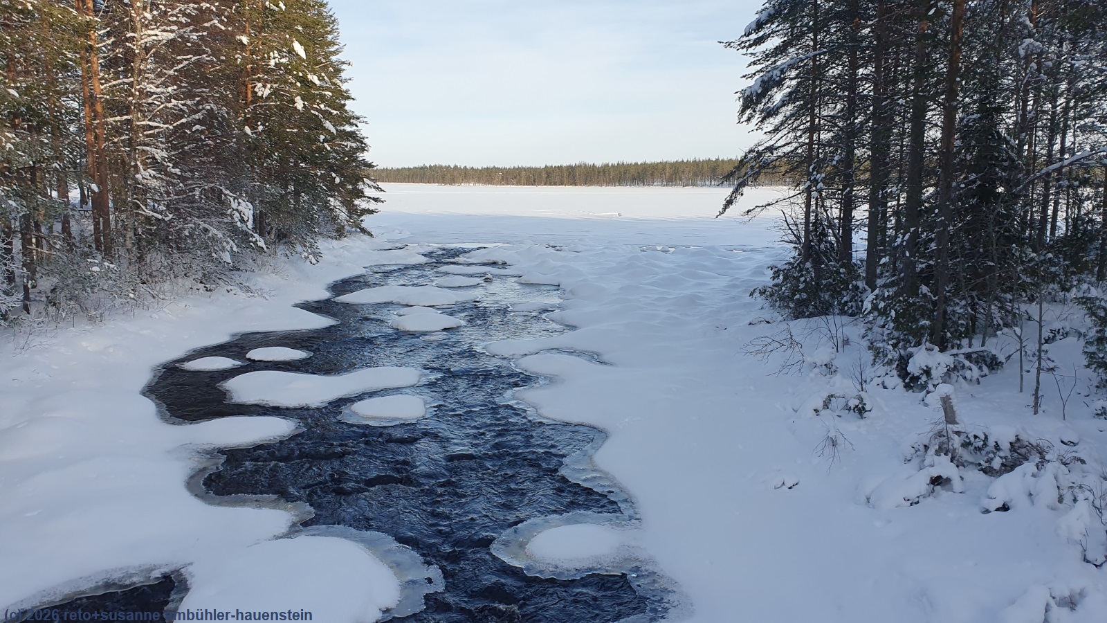 das restaurant ist tatsächlich geöffnet. eine grössere gruppe verpflegt sich gerade. ich esse eine suppe, dazu trinken wir beide einen tee. kurz vor 13 uhr brechen wir wieder auf. wir laufen ein stück über eine strasse, sind uns aber nicht sicher, ob die richtung stimmt. wir gehen nochmals zum besucherzentrum zurück und laufen dann zum ufer des öllöri hinunter. auf dem navi erkennen wir, dass wir nun in die falsche richtung gelaufen sind, der erste versuch war eigentlich richtig. also drehen wir wieder um und folgen der strasse bis zur loipe. auf dieser laufen wir durch einen schönen wald. wir überqueren den iikoski über eine brücke, der fluss ist nicht zugefroren. bei der gleichnamigen hütte picknicken wir.