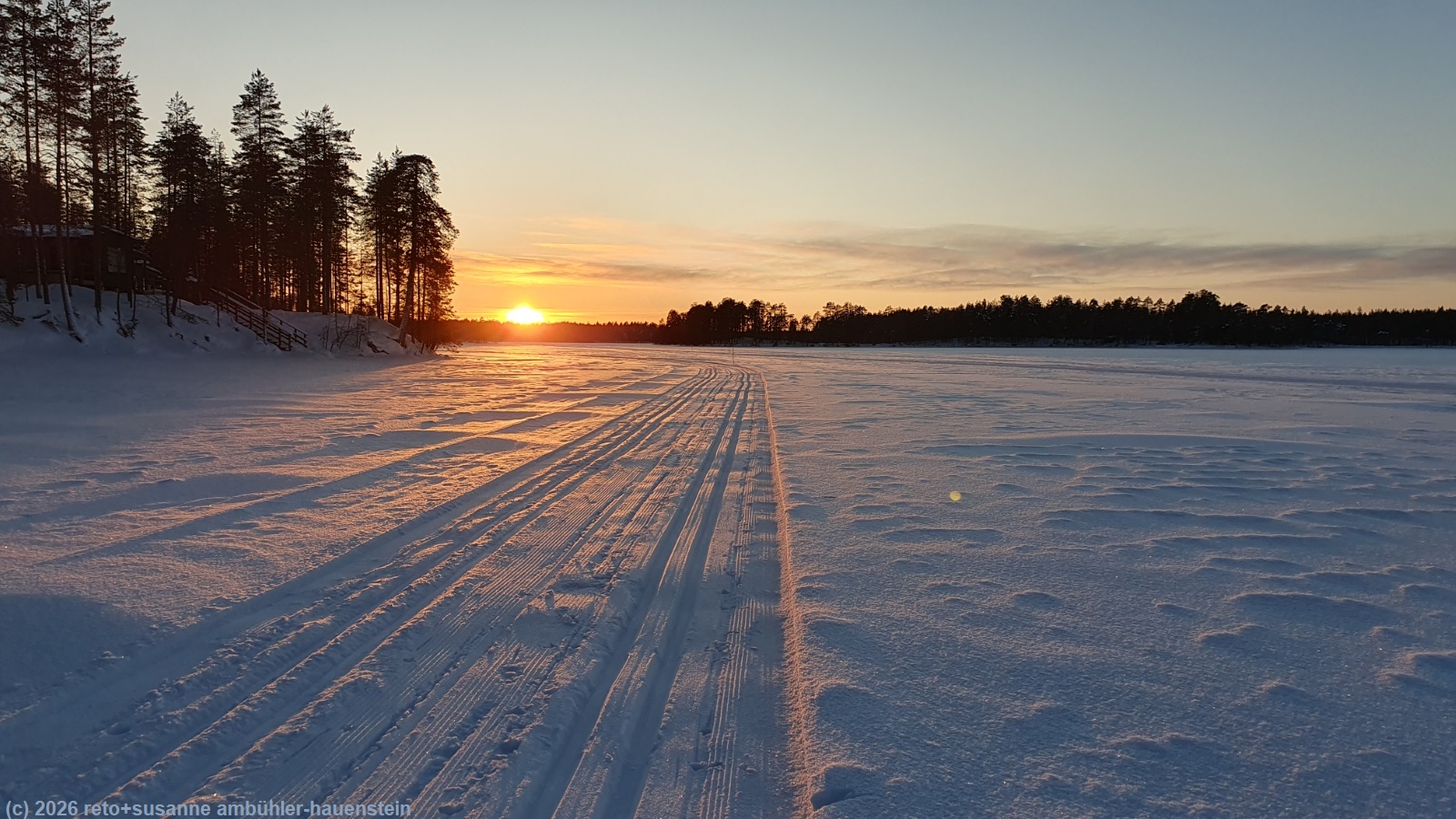 allerdings müssen wir draussen sitzen, es gibt keinen raum, in den man sich setzen könnte. gut haben wir uns warm angezogen. kurz nach 14:20 uhr brechen wir wieder auf. bis zum besucherzentrum laufen wir auf der selben loipe, auf der wir gekommen sind. jenseits des öllöri wählen wir den etwas direkteren "multi purpose trail". diesen weg teilen sich schneeschuhläufer, radfahrer und langläufer. allerdings gibt es keine spur, wir müssen über platten schnee laufen. das geht zwar ganz gut, aber wir kommen doch deutlich weniger schnell vorwärts. als wir uns einer bucht des hossanjärvi nähern, rutschen wir über einen motorschlittenpfad zum see hinunter. bald erreichen wir die langlaufloipe, nun geht es wieder flotter vorwärts. kurz vor dem campingplatz besuchen wir das restaurant hossan lomakeskus. es herrscht gerade ein bisschen ein chaos, weil offenbar die person, welche jetzt dienst hätte, nicht erschienen ist. man bemüht sich aber sehr und da wir nur einen kaffee haben möchten, geht es problemlos. um 16:20 uhr brechen wir wieder auf, zehn minuten später sind wir bei unserem haus. im westen senkt sich die sonne gerade richtung horizont und zaubert ein wunderschönes orange in die verscheinte landschaft.