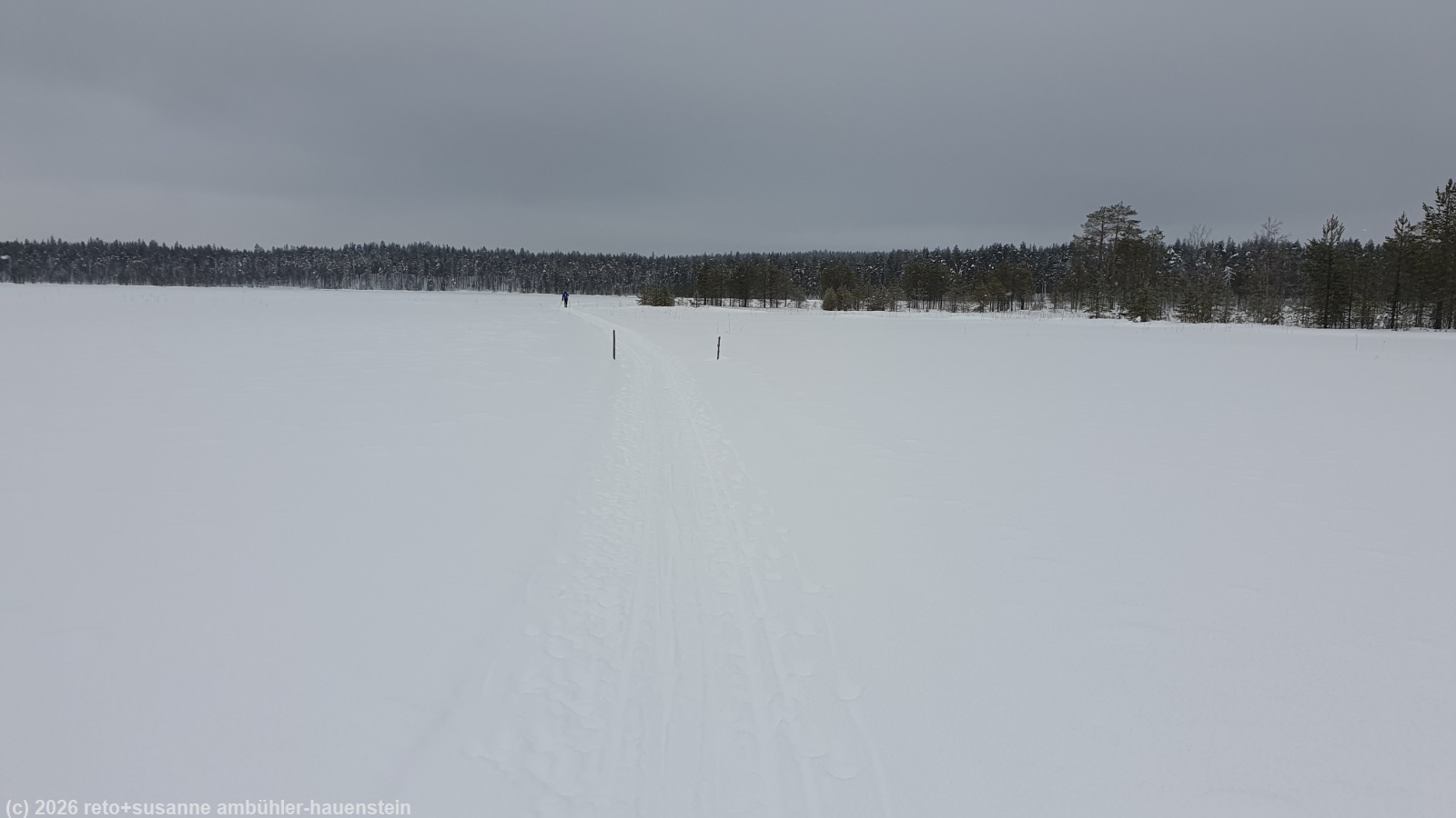 wir stehen um 8 uhr auf und frühstücken. eher überraschend zeigt sich die sonne und wir ändern unser tagesprogramm. das stellt sich allerdings bald als etwas voreilig heraus, denn noch bevor wir losfahren, verzieht sich die sonne hinter wolken und zeigt sich den ganzen tag nicht mehr. wir bleiben aber dabei, dass wir zum parkplatz bei der hirvastupa im hossa nationalpark fahren und dort den abschnitt des talvipyöräilyreitti laufen, welcher eine runde über diverse seen bildet. auf der ganzen strecke gibt es aber keine gespurte loipe, da es sich um "multi purpose trails" handelt, die auch von schneeschuhläufern und fahrräder genutzt werden dürfen. wir laufen erst über den iso-valkeainen südwärts und dann durch ein längeres waldstück. über den kokalmus gelangen wir zum südlichsten punkt unseres heutigen laufs. über den pitkä-hoilua geht es in nordöstlicher richtung. nachdem wir einen kleinen natürlichen damm überwunden haben, gelangen wir über den ala-valkeinen zur gleichnamigen schutzhütte, wo wir den holzofen einfeuern und an diesem picknicken. nach dem mittagessen erwischen wir die falsche spur und laufen daher über einen pfad, der im sommer als bike trail dient. trotzdem kommen wir ohne schwierigkeiten wieder zum ausgangspunkt unserer runde. wir fahren zurück zu unserem haus. nach zwei sitzungen in der sauna und einem video-anruf bei unserer tochter geniessen wir das abendessen und verbringen danach einen gemütlichen abend.