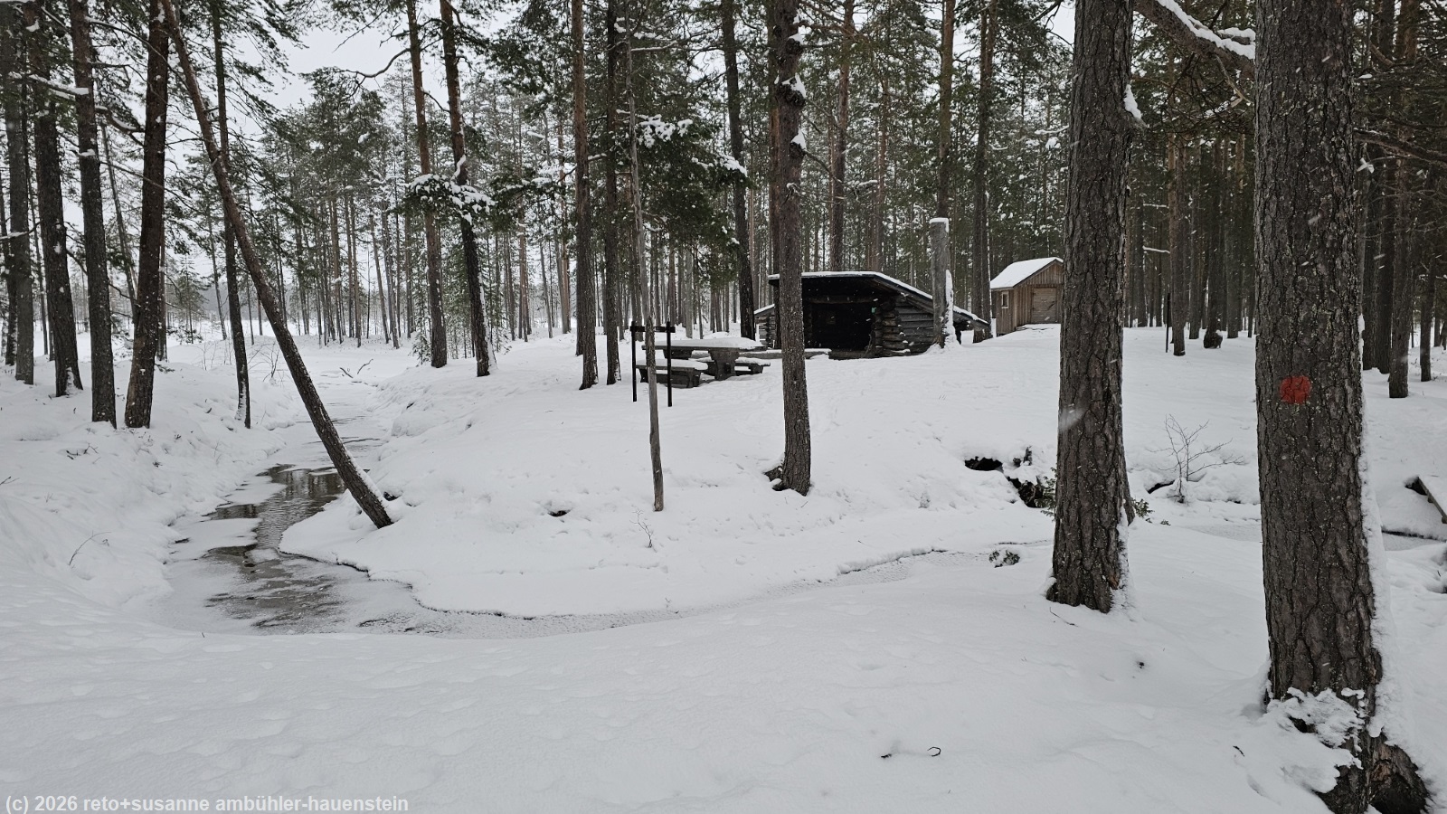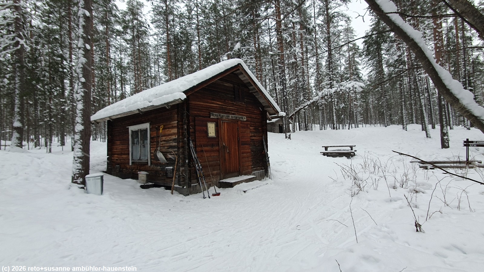 unser handy weckt uns um 8 uhr. der himmel ist bewölkt, aber während wir frühstücken zeigt sich eher überraschend die sonne. wir ändern daher unser tagesprogramm. allerdings zieht schon bevor wir losfahren eine dickere wolkenschicht auf und wir sehen die sonne heute nicht mehr. gelegentlich fällt etwas schnee, es wird ein eher trüber tag. trotzdem fahren wir um 10:30 uhr richtung besucherzentrum des hossa nationalparks. wir folgen der jatkonsalmentie und fahren dem nördlichen ufer des kenttäjärvi folgend westwärts. über die pistonlehdontie erreichen wir den parkplatz in der nähe der hirvastupa. selbst die kleinen strassen im nationalpark sind geräumt - natürlich nicht schneefrei, aber gut zu befahren. wir montieren die langlaufskis und brechen kurz nach 11 uhr zu unserer runde auf, die uns über einen teil des talvipyöräilyreitti führen wird, siehe auch interaktive loipenkarte region hossa. heute laufen wir ausschliesslich über "multi purpose trails", das heisst, keine gespurte loipe. das geht grundsätzlich sehr gut, wir kommen einfach etwas langsamer voran und müssen stets aufpassen, das gleichgewicht zu halten, denn ohne spur haben die schmalen skis die tendenz, seitlich wegzurutschen. ich denke, dies ist ein hervorragendes training für unsere muskulatur und unseren gleichgewichtssinn. wir überqueren den iso-valkeinen, danach laufen wir durch einen wunderschönen wald des hossa nationalparks. am ende das waldstücks gelangen wir auf den kokalmus. seinem ufer sind wir im sommer 2024 während einer tageswanderung schon einmal gefolgt, siehe tagebuch vom 02-aug-2024. am südwestlichen ende des sees befindet sich der unterstand kokalmus laavu, da hatten wir im sommer 24 zu mittag gegessen. dafür ist es heute definitiv zu kalt für uns. wir setzen unsere runde fort und laufen über den pitkä-hoilua nordostwärts. nach 1.2 km wendet sich die spur südwärts. wir folgen dieser, aber als wir den unterstand lipposensalmi laavu erreichen wird uns klar, dass dies ein fehler war. wir drehen um und kehren zum nördlichen ufer des pitkä-hoilua zurück. diesem folgen wir wieder nordostwärts, bis die spur in den wald hinein führt. wir steigen über den kleinen, natürlichen damm hoiluansärkkä und gelangen so auf den ala-valkeinen. wir überqueren den see und erreichen die kleine schutzhütte ala-valkeinen autiotupa. es hat zwar einige fussspuren, aber es ist niemand da.