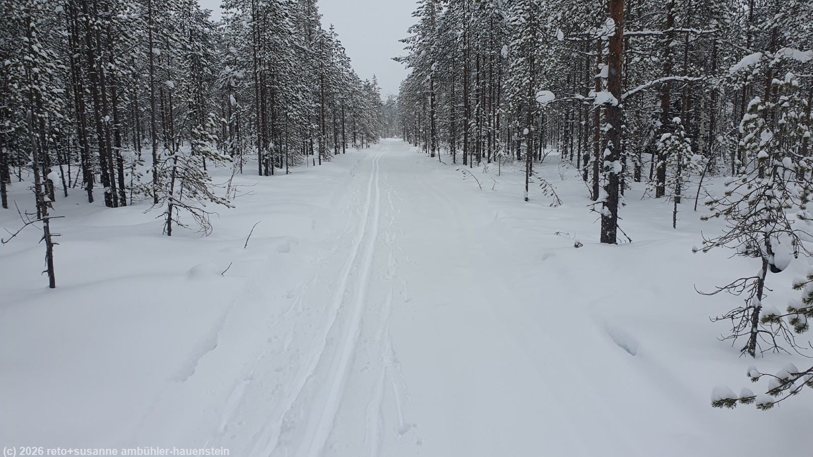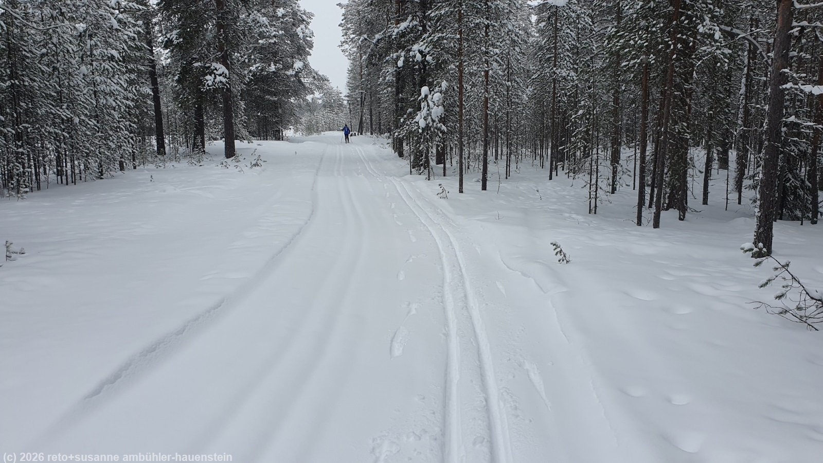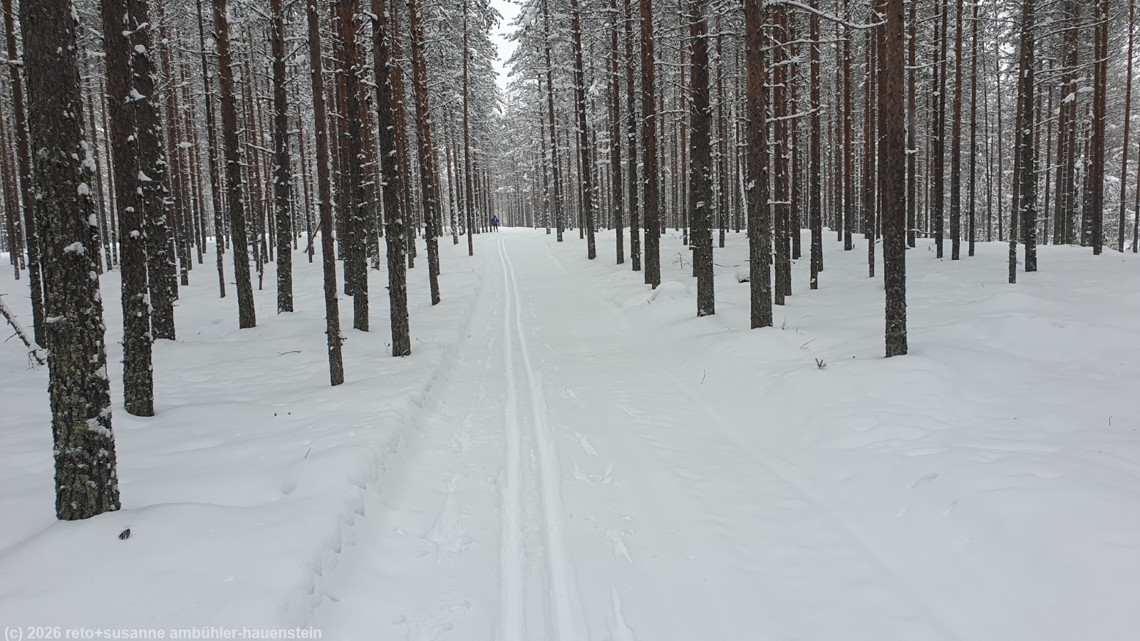 wir lassen uns auch heute um 8 uhr von unserem handy wecken. es hat die ganze nacht geschneit und als wir aufstehen, fallen immer noch schneeflocken vom himmel. der besitzer des campingplatzes ist mit seinem mächtigen traktor unterwegs und entfernt den neuschnee. wie schön, dass in finnland nicht schneefrei geräumt wird. nach dem frühstück starten wir zu einer langlaufrunde direkt von unserem haus. die route besteht aus einer kombination der loipen "hossan yrittäjien latu" und "kukkaron kierros", siehe auch interaktive loipenkarte region hossa. wir laufen über die bucht des hossanjärvi richtung hotel hossan lomakeskus. dort überqueren wir die strasse 843 und folgen dieser gut 400 meter nordwärts. dann wenden wir uns ostwärts und überqueren den kotilampi. nun folgen wir der loipe südwestwärts entlang des kotijoki. eigentlich sollte dies eine gespurte loipe sein, aber seit der schneefall eingesetzt hat, ist hier kein fahrzeug vorbeigekommen um die spur zu pflegen. wir sehen die zwei alten spuren als leicht dunkelgraue streifen im etwas weniger grauen schnee. dieser ist glücklicherweise sehr leicht, so dass wir ohne grosse mühe vorwärts kommen. wir laufen durch eine schneise, welche zum einen für eine stromleitung geschlagen wurde und zum anderen eben auch als langlaufloipe dient. der weg nähert sich kontinuierlich der strasse 843 und führt schliesslich über diese zu einer weiteren bucht des hossanjärvi. im wald war uns schon fast ein wenig warm, aber auf dem see wird es sofort frostig. wir verlassen diesen schon bald wieder und erreichen die ferienhaus-siedlung alpo paasovaara. sie sieht ziemlich verlassen aus. das einzige auto, das hier steht, hat schon ziemlich viel schnee auf dem dach. wir folgen nun erneut der strasse 843 südwärts. auch hier ist die loipe völlig zugeschneit. susanne entpuppt sich als hervorragende spurlegerin, ich gleite entspannt hinter ihr her. da wo der hossanjärvi in den hossanjoki über geht, sind wir am südlichsten punkt unserer heutigen runde. gerade als wir die strasse überqueren wollen, hören wir, dass ein lautes fahrzeug näher kommt. neugierig bleiben wir am strassenrand stehen. es ist ein grosser traktor. als der fahrer uns sieht, hupt er und winkt uns zu sich. es stellt sich heraus, dass es der mann von unserem campingplatz ist. er entschuldigt sich, dass die loipen nicht gespurt sind, das wäre seine aufgabe, meint er. wir versichern ihm, dass es uns auch so gefällt. er meint: "finnish people dont like it" wenn die loipen nicht gespurt sind. er erklärt uns, dass er erst mit spuren beginnt, wenn der schneefall aufgehört hat. zuerst würde er die multi purpose wege räumen und erst dann die loipen spuren. er müsse zwei bis drei mal über den weg fahren, bis die spur gut sei. zudem sei an manchen stellen die fahrtrichtung entscheidend, sonst würde das fahrzeug sich eingraben und die spur zerstören. nach dem kurzen schwatz macht er sich wieder auf den weg. wir müssen einmal mehr erkennen, dass wir die finnen all die jahre ziemlich falsch eingeschätzt haben. sie sind weder verschlossen noch eigenbrötlerisch sondern einfach sehr, sehr freundlich und liebenswert. so hat sich unsere sympathie von norwegen über schweden ganz klar nach finnland verschoben. nicht dass die schweden nicht auch sehr nett sind, aber irgendwie sind uns die finnen in den letzten jahren ganz besonders ans herz gewachsen. die loipe führt nun für 1.5 km im rechten winkel von der strasse weg, dann dreht sie gegen nordwesten. mitten im wald stossen wir auf ein wunderschönes blockhaus. während wir das anwesen bewundern, tauchen hinter uns zwei junge langläufer auf. es ist der junge herr, der uns vorgestern im restaurant des hossan lomakeskus bei den etwas chaotischen zuständen mit kaffee versorgt hat, in begleitung einer jungen frau. sie sind offensichtlich unserer spur gefolgt und bedanken sich artig fürs spuren. nun laufen sie voraus und wir profitieren von ihrer vorarbeit. es ist erstaunlich, was es ausmacht, wenn nur zwei läufer vor einen durch die verschneite spur gelaufen sind. so kommen wir locker wieder zur ferienhaus-siedlung alpo paasovaara zurück. damit schliesst sich die schleife. wir machen einen kurzen halt, trinken einen schluck tee und essen einen stengel. es hat zwar eine art kota, die offen ist, aber sie sieht nicht aus, als ob sie für die öffentlichkeit gedacht ist. deshalb setzen wir uns auf die kiste vor der kota. nach einer viertelstunde brechen wir wieder auf. wir laufen knapp einen kilometer über den hossanjärvi. auf dem see geht ein kalter wind. zwar nur ganz sanft, aber empfindlich kalt. schliesslich schlagen wir uns quer über die halbinsel hossanniemi, auf welcher unser campingplatz liegt. kurz vor 13:30 uhr sind wir wieder bei unserem haus.