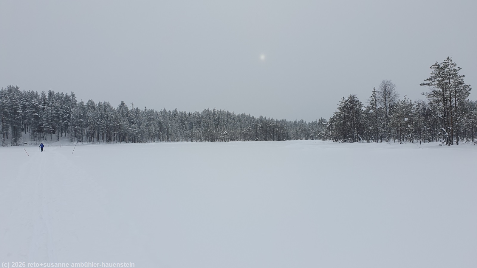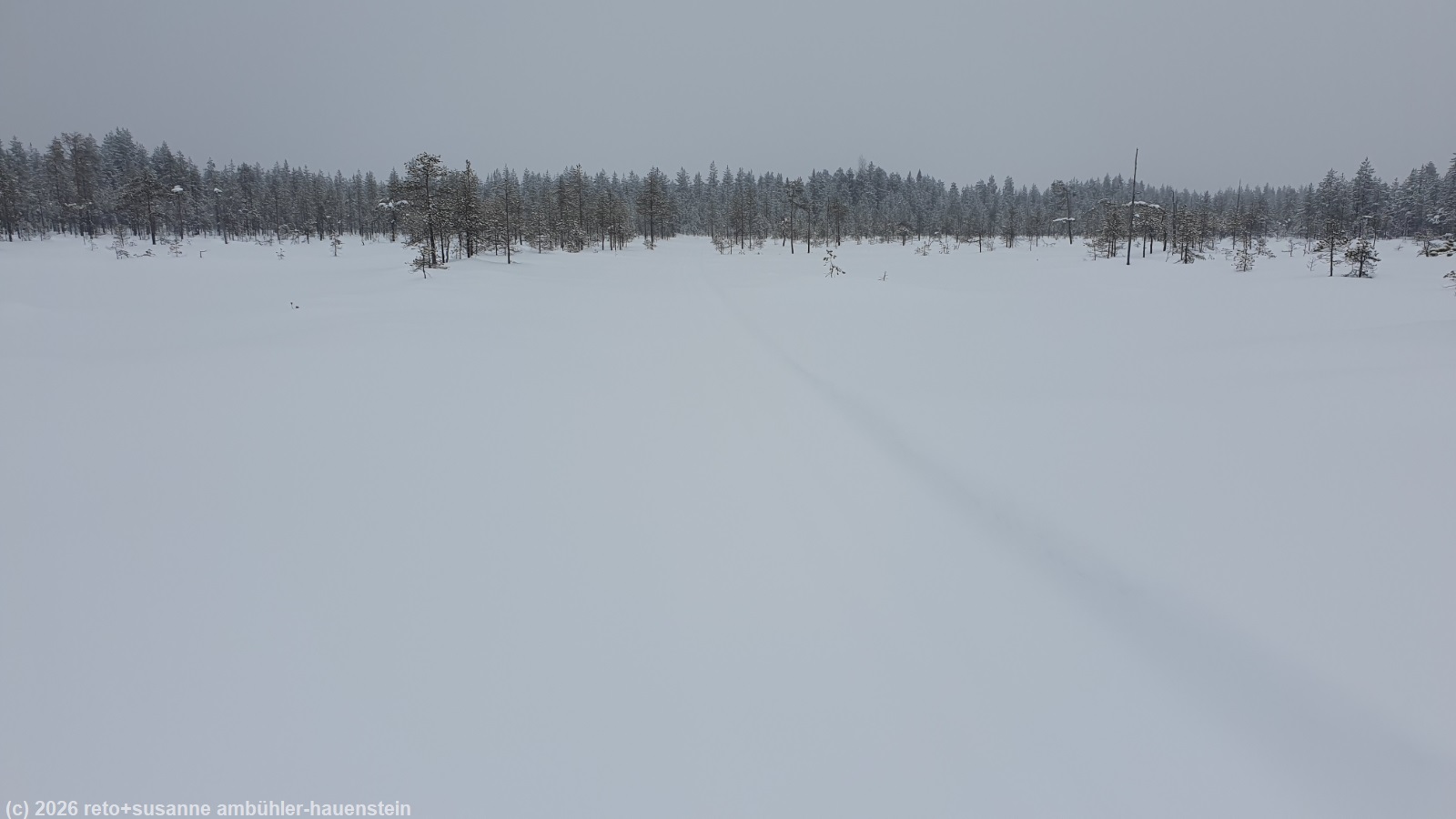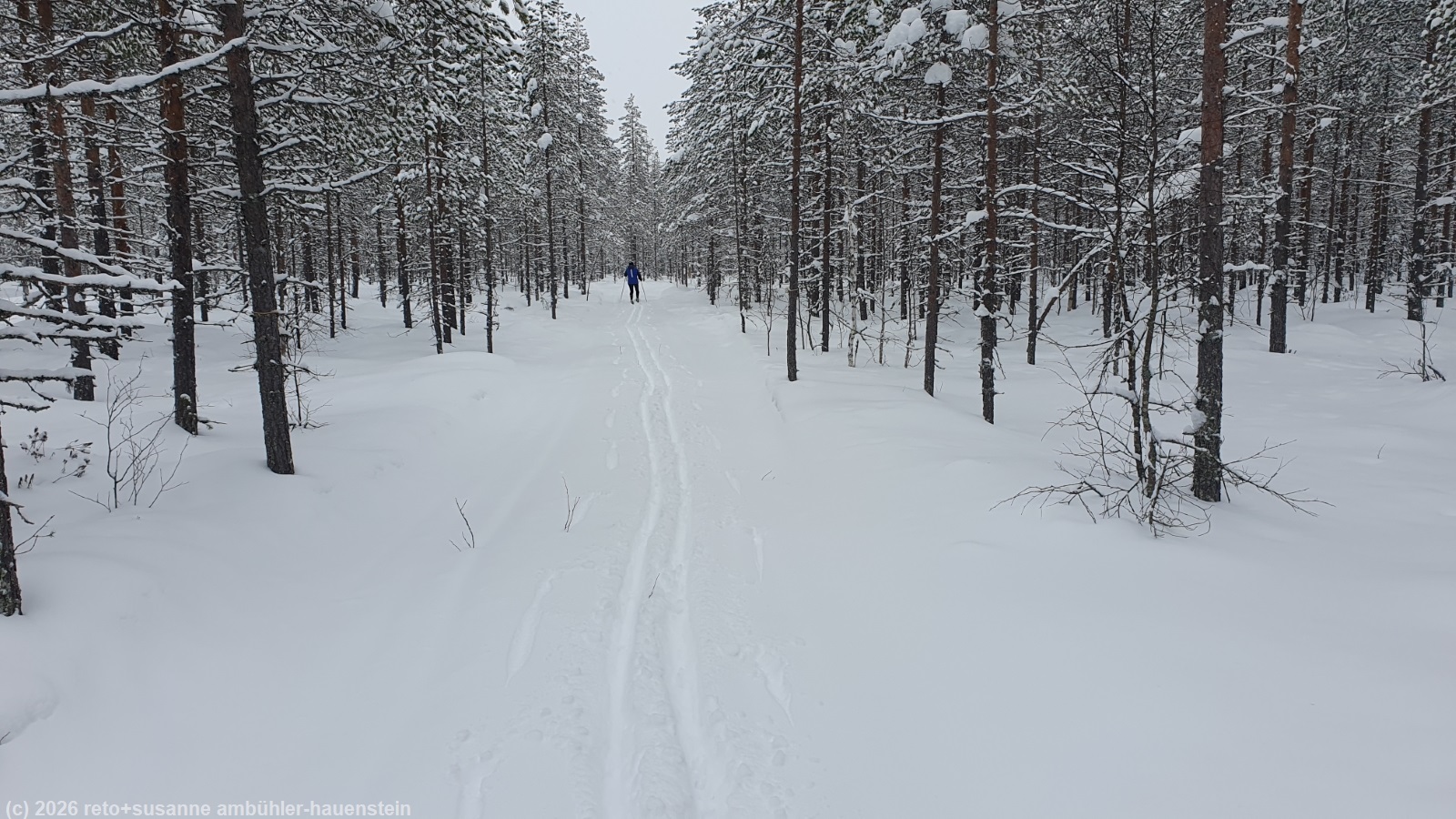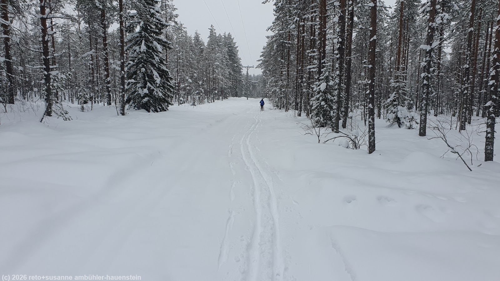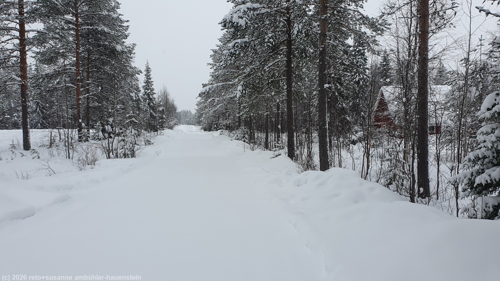 wir stehen um 8 uhr auf. es hat die ganze nacht geschneit, der platzbesitzer ist mit seinem mächtigen traktor unterwegs und räumt den neuschnee weg. nach dem frühstück laufen wir über den hossanjärvi zum start der loipe "hossan yrittäjien latu". diese folgt gut 400 meter der strasse 843 richtung norden und führt dann zum kotilampi hinunter. wir überqueren den see. am gegenüberliegenden ufer wendet sich die loipe südwärts. sie wurde allerdings nicht mehr gespurt, seit es zu schneien angefangen hat und ist daher kaum mehr zu erkennen. der schnee ist allerdings sehr leicht, so kommen wir trotzdem gut voran. bei der ferienhaus-siedlung alpo paasovaara beginnt die rundstrecke "kukkaron kierros". als wir im verlauf der loipe die strasse 843 überqueren, treffen wir den besitzer unseres campingplatzes und unterhalten uns mit ihm. jenseits der strasse laufen wir für 1.5 km über flaches gelände. am ende dieser strecke wendet sich die loipe nordwärts. während wir ein wunderschönes anwesen mitten im wald bewundern, überholen uns zwei langläufer. sie sind offenbar unserer spur gefolgt, nun sind sie dran, den schnee auf der loipe platt zu machen. um 12:45 uhr sind wir wieder bei alpo paasovaara. nach einer kurzen pause laufen wir über den hossanjärvi zur halbinsel hossanniemi, auf welcher sich unsere unterkunft befindet. wir essen zu mittag, danach verbringen wir einen ruhigen nachmittag in unserem haus. gegen 17:30 uhr geniessen wir zwei sitzungen in der sauna und anschliessend ein köstliches abendessen. während ich die bücher nachführe, hält meine frau ausschau nach polarlichter.