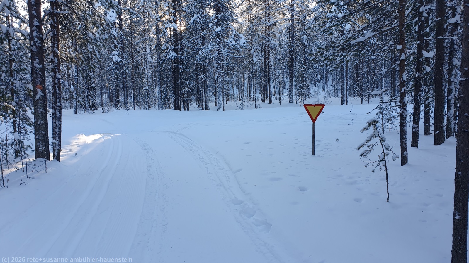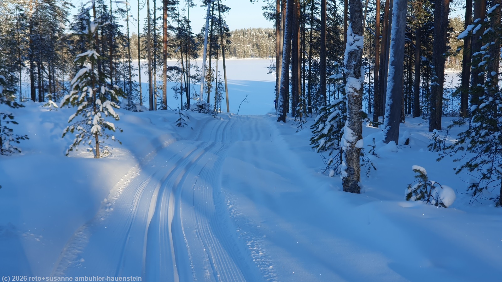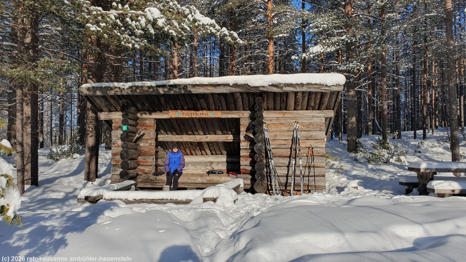 als wir um 8 uhr aufstehen zeichnet sich ein bilderbuchtag ab. nach dem frühstück fahren wir zum besucherzentrum des hossa nationalparks. heute laufen wir über den puukkojärven lenkki, eine loipe mit einigen "multi purpose" abschnitten. den einstieg kennen wir schon vom vergangenen freitag. bei strahlend blauem himmel laufen wir durch eine fantastische winterlandschaft. am hypäs vorbei geht es richtung kangaslammit. da der pistenmacher in der entgegengesetzten richtung unterwegs ist, ist die loipe in diesem bereich noch nicht frisch gespurt. um 12:30 uhr erreichen wir den unterstand puukkojärvi laavu. wir hatten eigentlich eine schutzhütte erwartet, aber bei dem fantastischen wetter können wir wunderbar im freien picknicken. während wir in der sonne unsere brote verzehren, fährt der pistenmacher vorbei, das heisst, auf dem rückweg werden wir eine frisch präparierte loipe vorfinden. als wir unsere runde fortsetzen, kommen wir an der schutzhütte vorbei, wir hätten noch hundert meter weiter laufen müssen. über verschiedene gefrorenen seen, manche getrennt durch kleine, aber steile dämme, geht es zurück zum ausgangspunkt. kurz nach 16 uhr sind wir wieder beim campingplatz. wir retournieren die langlaufausrüstung, danach machen wir zwei sitzungen in der sauna und geniessen anschliessend das abendessen. gegen 22 uhr erhalten wir die information, dass polarlichter zu sehen seien. wir beobachten das spektakel, bis uns nach etwa einer stunde so kalt ist, dass wir uns in unser haus zurückziehen und uns mit einem heissen tee aufwärmen. kurz vor mitternacht sind wir im bett.