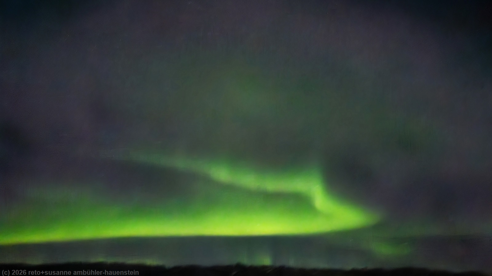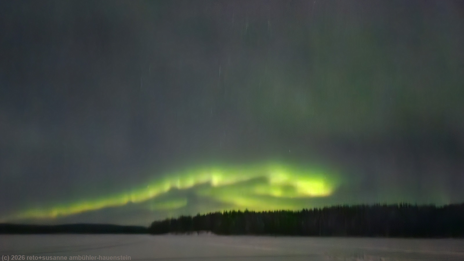wir fahren zum campingplatz zurück und geben die gemietete ausrüstung zurück. dabei unterhalten wir uns nochmals mit dem ehepaar, welches den campingplatz betreibt. zurück in unserer hütte trinken wir einen kaffee und heizen die sauna ein. bis diese warm ist, führe ich die bücher nach. als die sauna betriebstemperatur erreicht hat, geniessen wir zwei sitzungen, danach gibt es abendessen. nach dem abwasch packen wir unsere rucksäcke soweit als möglich. anschliessend verbringen wir einen gemütlichen abend, bis susanne gegen 22 uhr eine polarlicht-warnung erhält. fast gleichzeitig schreibt uns die platzwartin eine SMS, dass es "auroras" zu sehen gäbe. wir ziehen uns warm an und marschieren auf den see hinaus, wo wir bei weitem nicht die einzigen sind, aber ausser uns sprechen alle französisch. die polarlichter sehen toll aus, susanne macht viele schöne bilder.