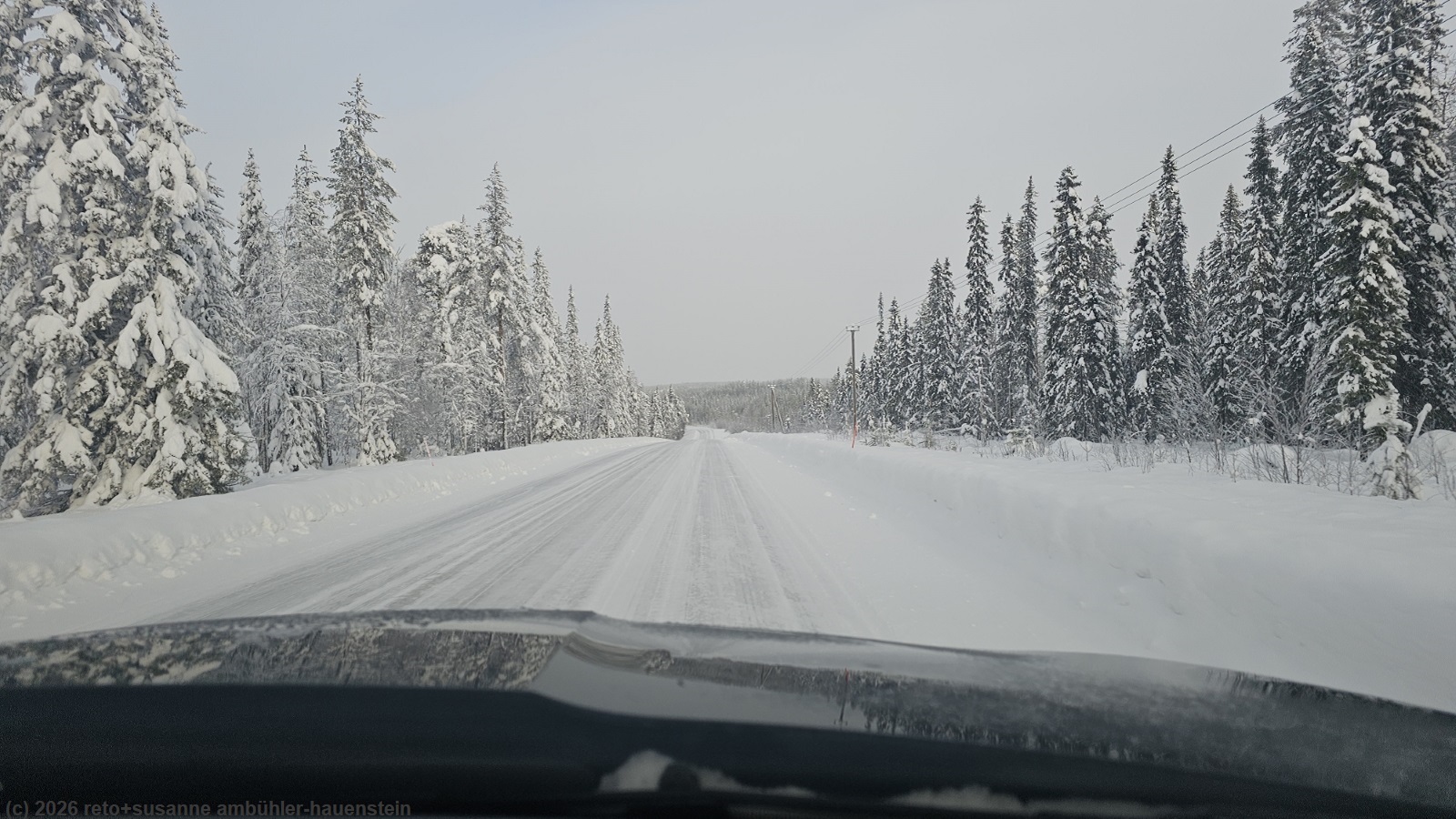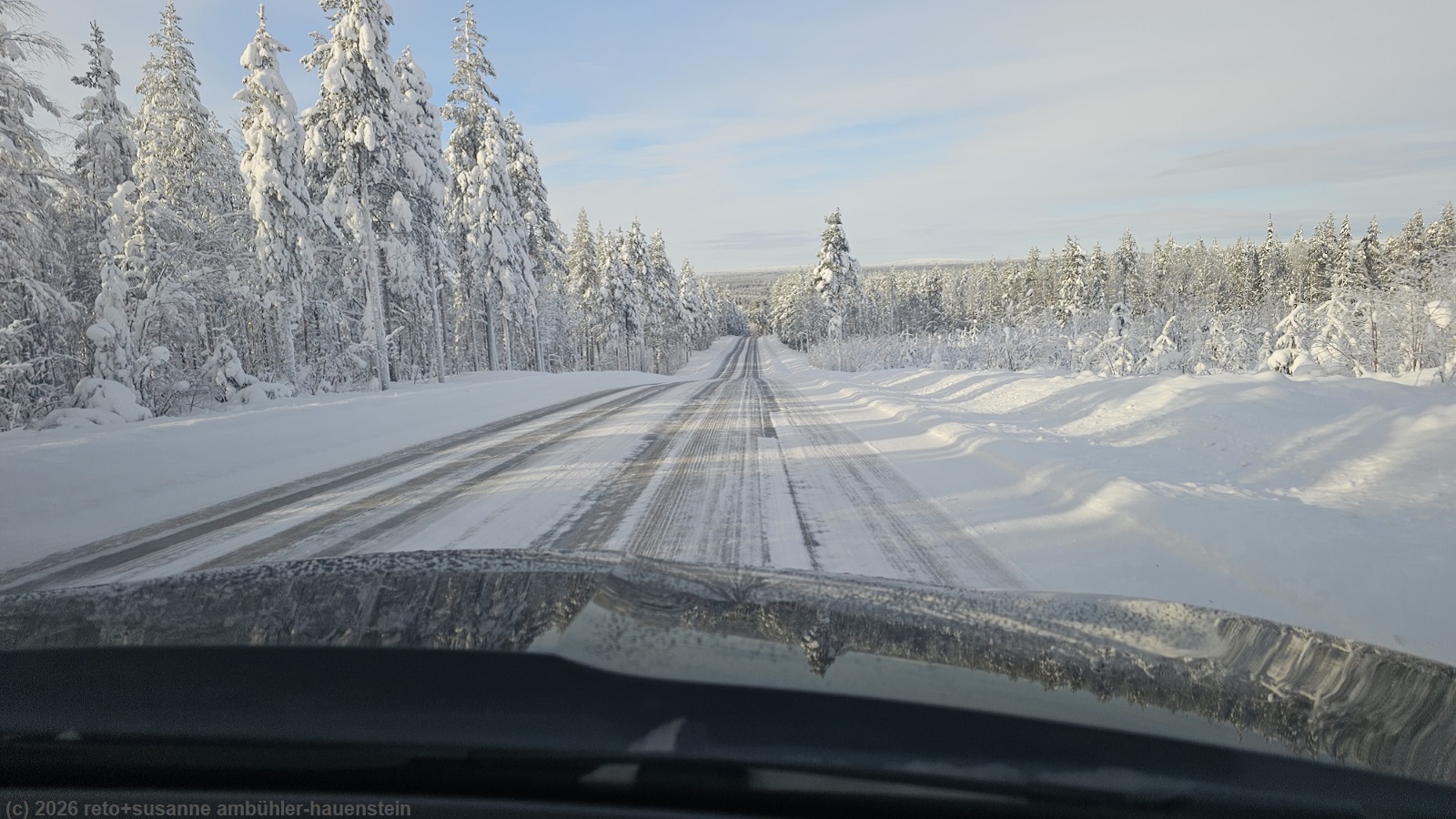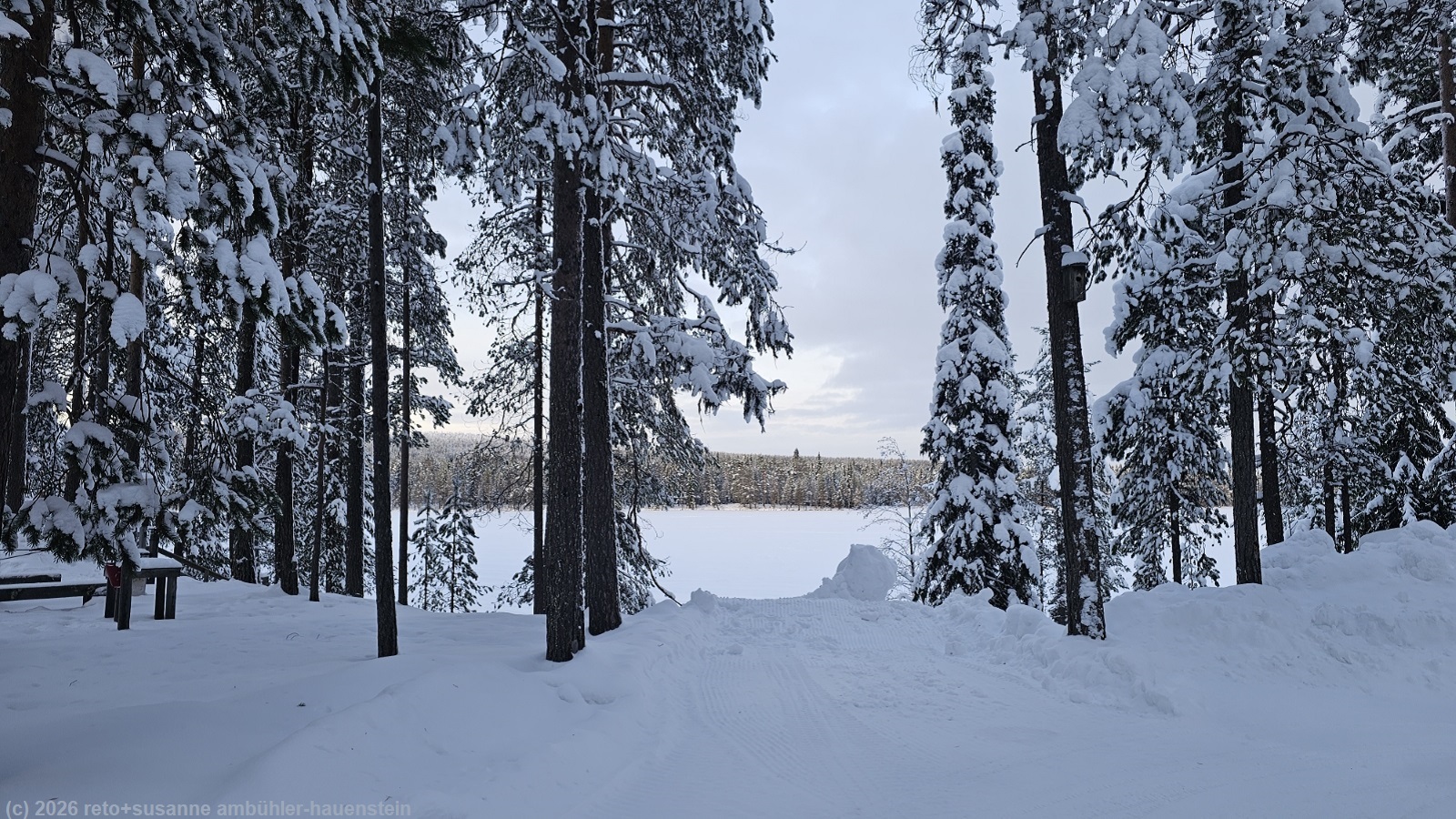 wie inzwischen üblich stehen wir um 8 uhr auf. das wetter wirkt freundlich, auch wenn eine dünne wolkenschicht die sicht auf die sonne etwas trübt. nach dem frühstück packen wir unsere rucksäcke und lebensmittel ins auto. kurz nach 10 uhr machen wir uns auf den weg. auf der strasse 843 fahren wir nordwärts am besucherzentrum des hossa nationalparks vorbei und weiter richtung ahola. kurz nach dem ort treffen wir auf die strasse 5, die uns nach kuusamo bringt. auch heute dürfen wir die ganze fahrt im eigenem tempo geniessen. es kommen uns zwar einige wenige autos entgegen, aber wir treffen auf kein fahrzeug, welches in unsere richtung fährt. kurz nach 11 uhr erreichen wir die uns ganz gut vertraute stadt. im riesigen prisma stocken wir unseren lebensmittelvorrat auf. mittag ist gerade vorbei, als wir unseren vollen warenkorb an der self-scanning kasse bezahlt haben. das geht inzwischen ganz gut und erfordert keine mitgliedschaft bei der entsprechenden lebensmittel-ladenkette. aber um einen hand-scanner auszulösen, muss man nach unserem verständnis immer noch mitglied sein. wir verstauen die lebensmittel im auto und essen im kleinen cafe im einkaufszentrum zu mittag. nachdem wir uns kaffee und kuchen gegönnt haben, besuchen wir noch die apotheke um etwas gegen den lästigen husten zu kaufen, der uns nun schon seit tagen begleitet. es ist zwar nicht wirklich schlimm, aber halt unangenehm. kurz nach 13 uhr setzen wir unsere fahrt fort. in der stadt sind nun einige autos vor uns unterwegs, aber kaum haben wir kuusamo hinter uns, geht es wieder im eigenen tempo weiter. etwa auf halbem weg zwischen kuusamo und ruka biegen wir westwärts auf die strasse 81 ab. völlig entspannt fahren wir durch die herrliche winterlandschaft. in kuusamo fiel zeitweise etwas schnee, nun hellt sich der himmel wieder auf und wir sehen öfters die sonne. als wir über eine kleine anhöhe fahren, haben wir eine wunderbare weitsicht über das winterliche lappland. kurz vor 14 uhr erreichen wir unser tagesziel holiday village himmerki etwa 5 km östlich von posio. über eine schmale und kurvenreiche strasse gelangen wir zum yli-kitka, an dessen ufer sich der campingplatz und die ferienhäuser befinden.