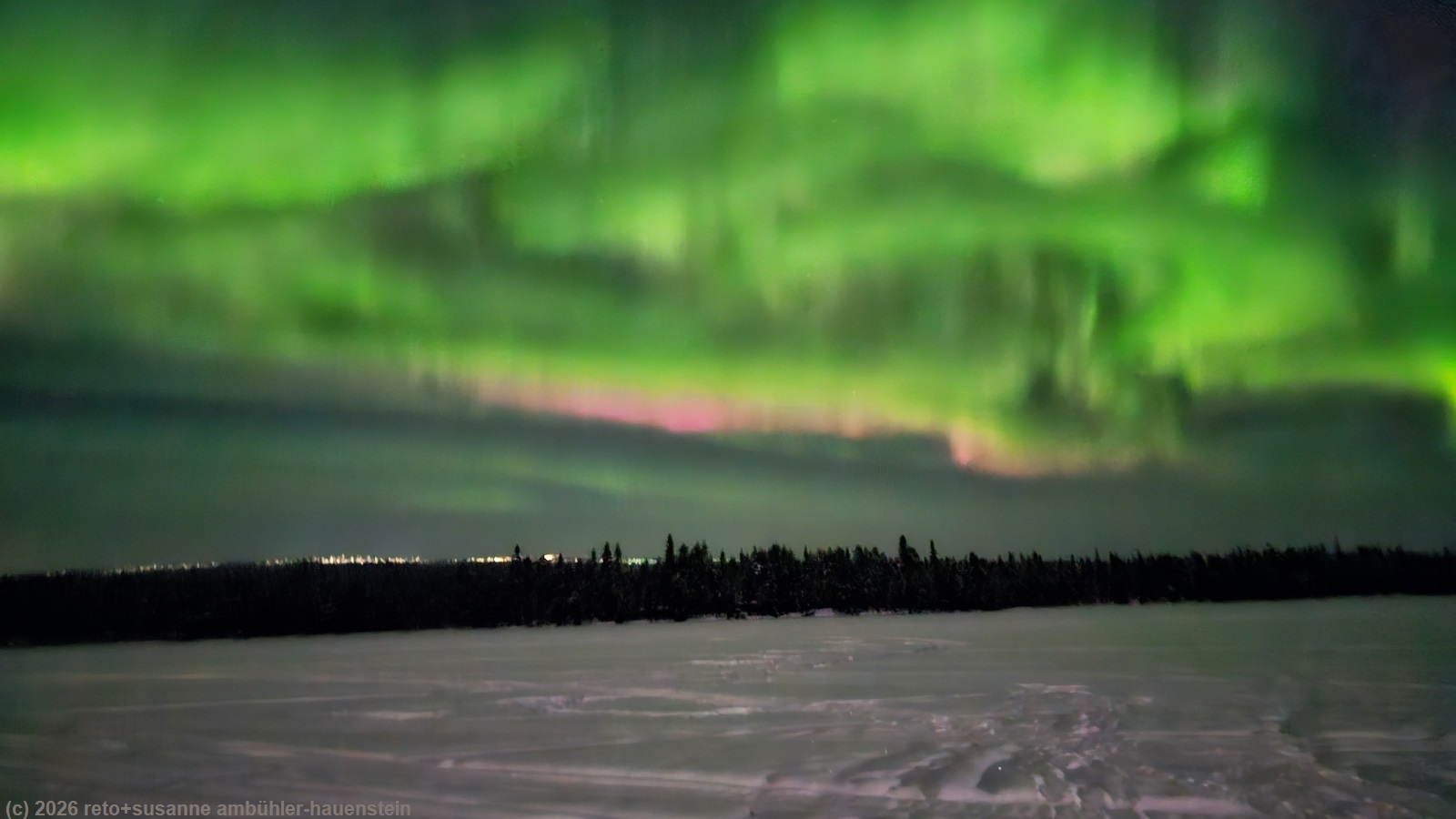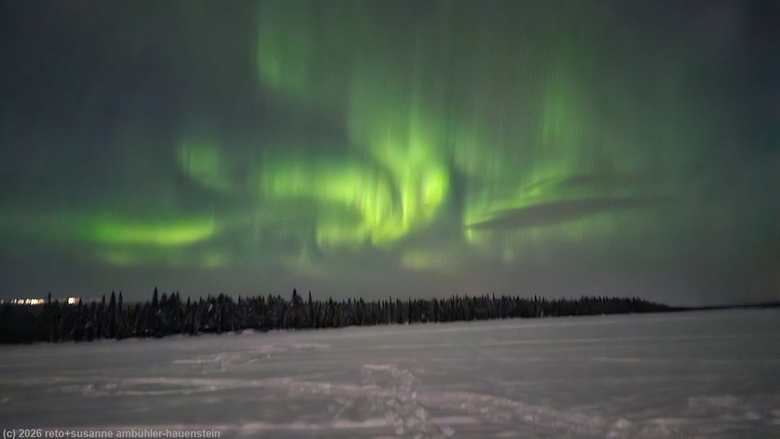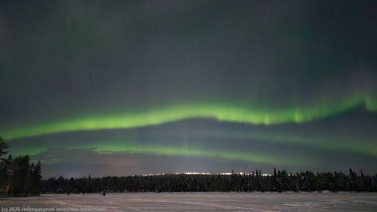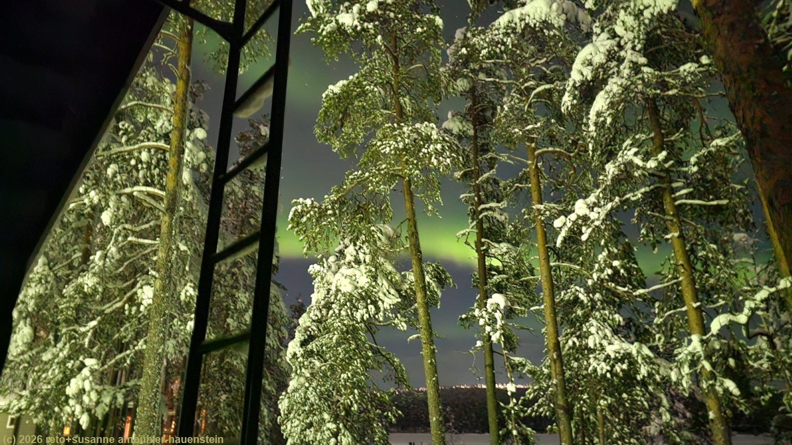 da wir auf dieser reise noch nie wäsche gewaschen haben, ist es höchste zeit. wir starten nacheinander zwei maschinen und hängen die kleider entweder in den trockenschrank oder stecken sie in den trockner. während die maschine die zweite ladung kleider sauber macht, geniessen wir das nachtessen. gegen 20 uhr setzen wir uns in die sauna und machen zwei sitzungen. als wir zwischen den sitzungen zum abkühlen auf den balkon treten, sehen wir zwischen den bäumen wunderschöne polarlichter. daher ziehen wir uns nach der zweiten sitzung warm an und stapfen zum see hinunter. das himmlische spektakel ist in vollem gang. susanne macht zahlreiche bilder.
