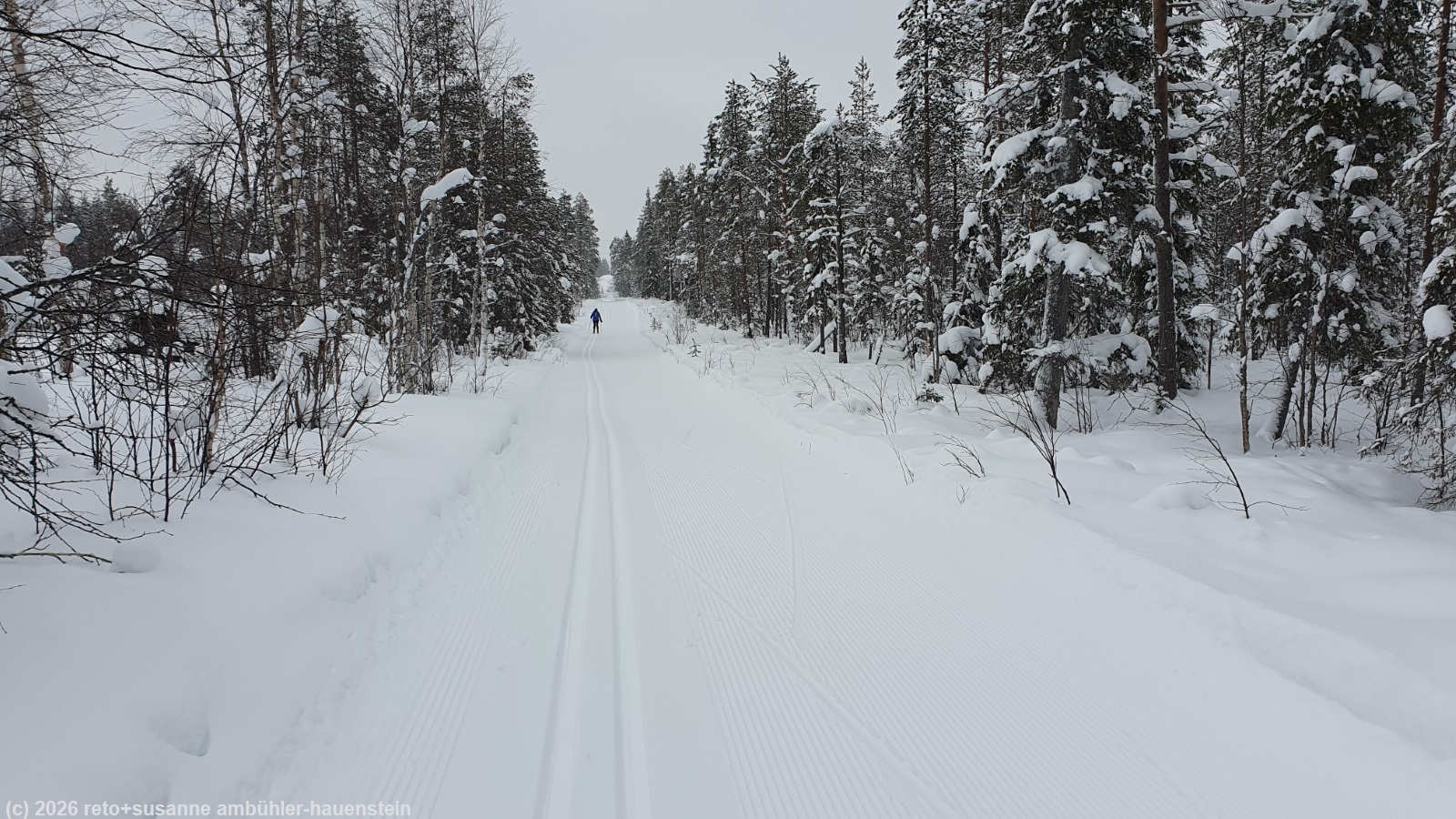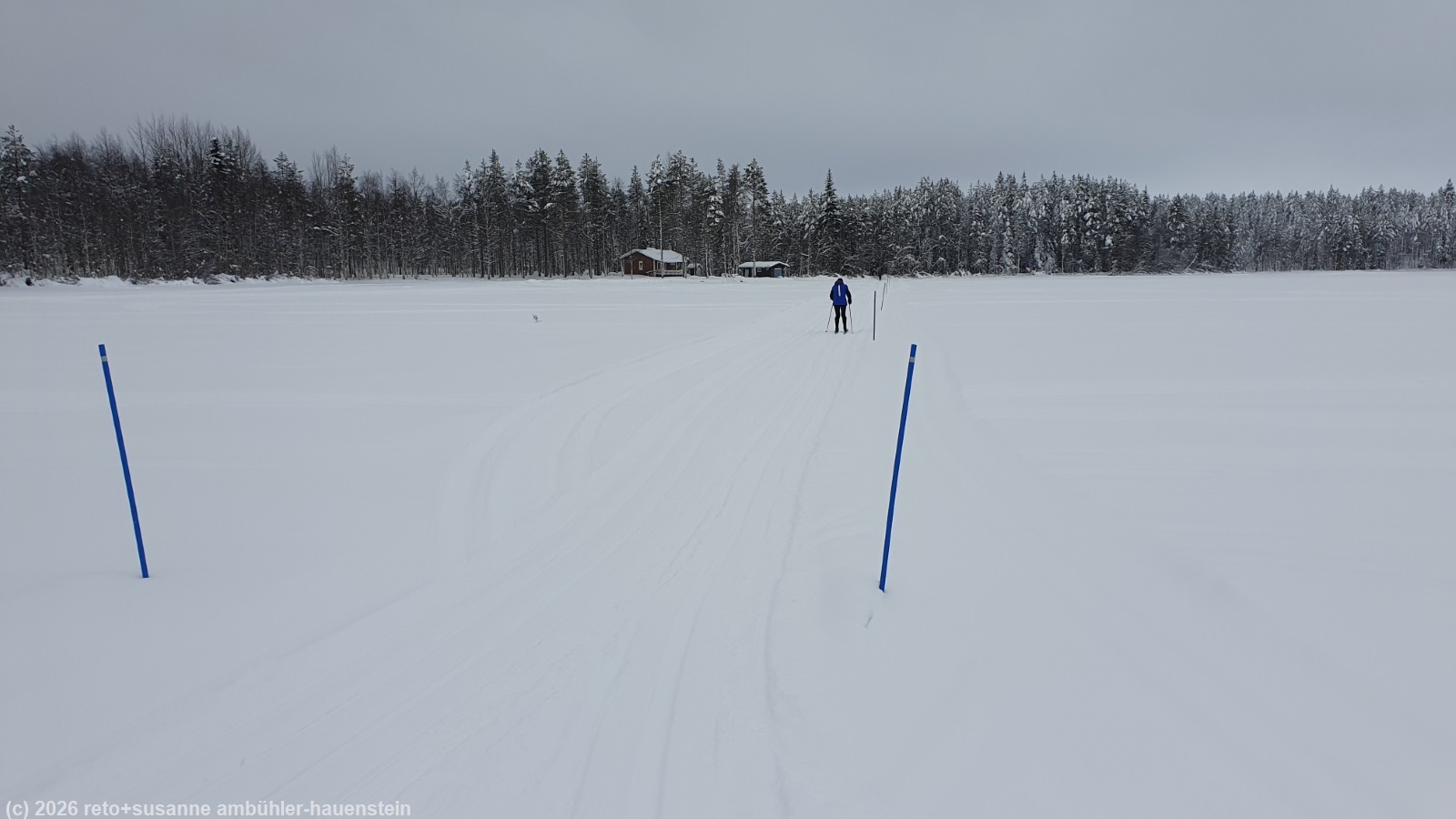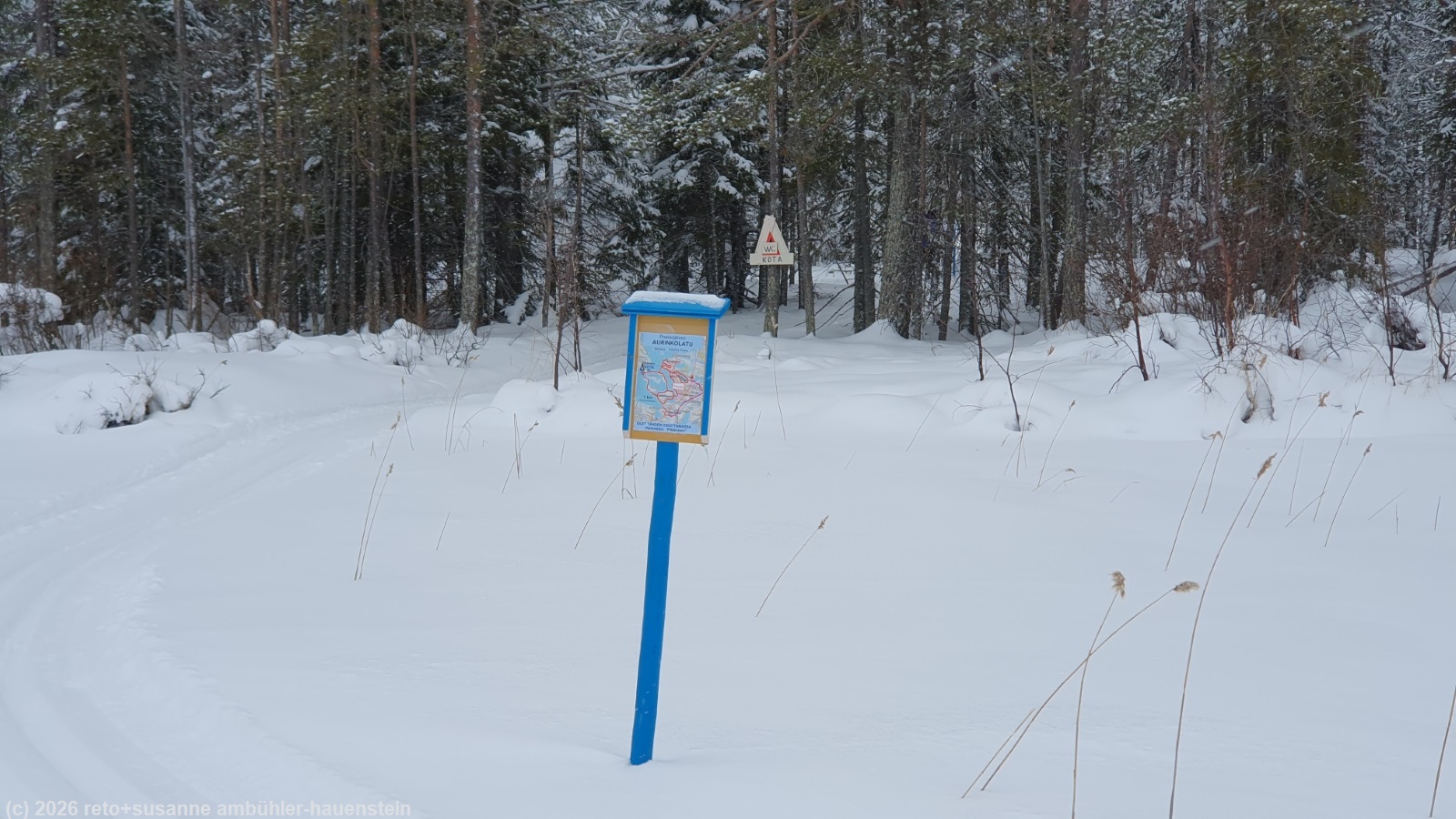 um nu hat susanne ein feuer entfacht. dieses wärmt den raum erstaunlich rasch, obwohl wir die türe nicht schliessen können. wir geniessen unser mittagessen. nach 45 minuten ist uns aber trotz des feuers kalt. beim sitzen kann man einfach die wärme nicht halten - es sei denn, die sonne scheint. wir brechen daher wieder auf. erneut geht es ein längeres stück über den posionjärvi, wobei die frisch gespurte loipe wo möglich dem ufer der kleinen inseln folgt. gegen 14:20 uhr erreichen wir das seeufer. durch den wald gelangen wir in ein wohnquartier. hier treffen wir auf den loipenmacher und seine frau. er erkennt susanne wieder und spricht sie an. seine frau ist deutsche, hat aber auch die finnische staatsbürgerschaft. wir unterhalten uns mit den beiden. die dame meint, sie würden versuchen, den tourismus in der gegend etwas anzukurbeln. die einzige andere einnahmequelle der region sei der wald und sie möchten nicht, dass dieser einfach überall abgeholzt wird. schliesslich verabschieden wir uns von den beiden und laufen zum nahen hotel lapin satu. gemäss schild an der eingangstür sollte das cafe bis 15 uhr offen haben, aber die tür zum restaurant ist geschlossen, obwohl es erst 14:35 uhr ist. bei diesem hotel sind wir schon im sommer 2023 angebrannt - irgendwie scheint man hier kein interesse an uns zu haben. wir setzen daher unsere runde fort. wir überqueren die strasse 863 und laufen wieder durch das wohnquartier, durch welches wir schon gestern in die entgegengesetzte richtung gekommen sind. am ende des wohnquartiers folgen wir der loipe in nordöstlicher richtung. eine leichte steigung bringt uns wieder zur strasse 81 hinauf. von der loipe müssen wir - wie schon zu beginn - gut 100 meter auf der strasse laufen, dann sind wir beim auto.