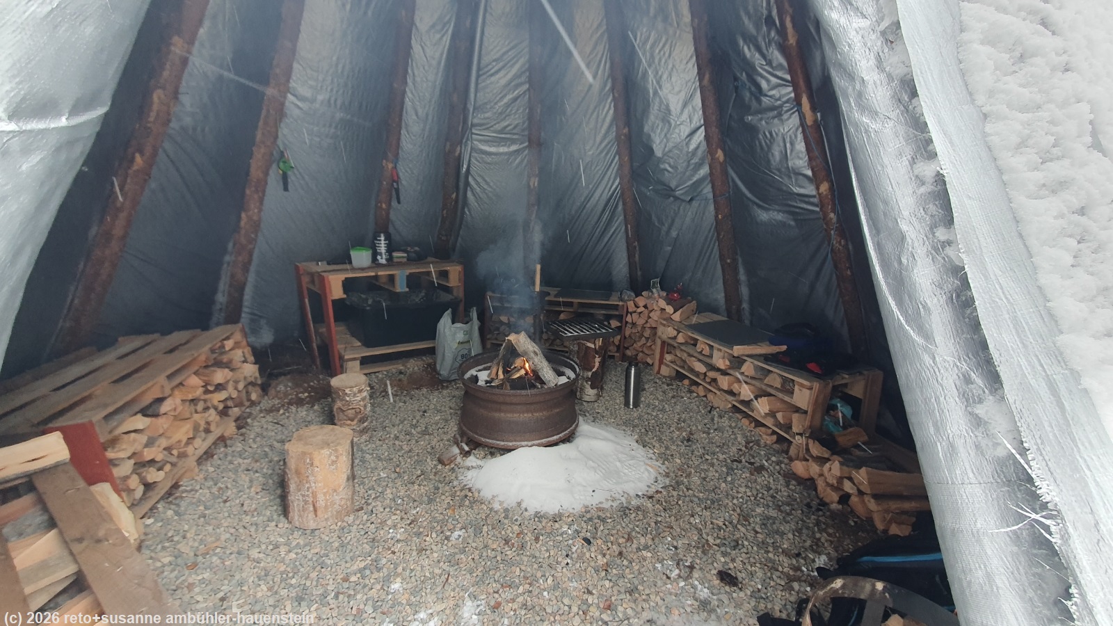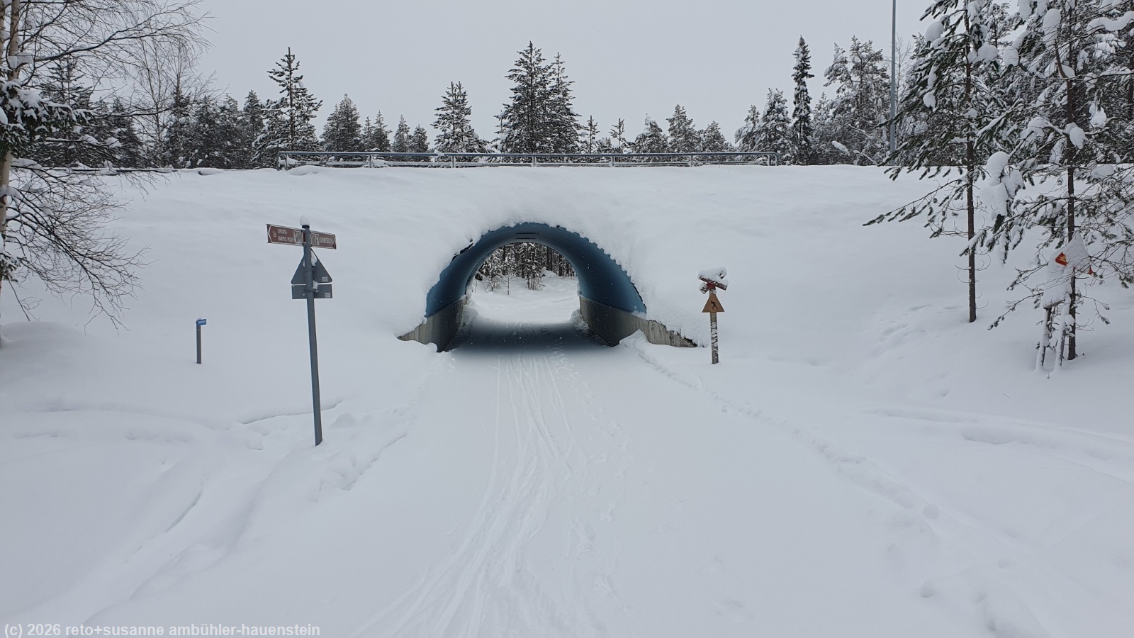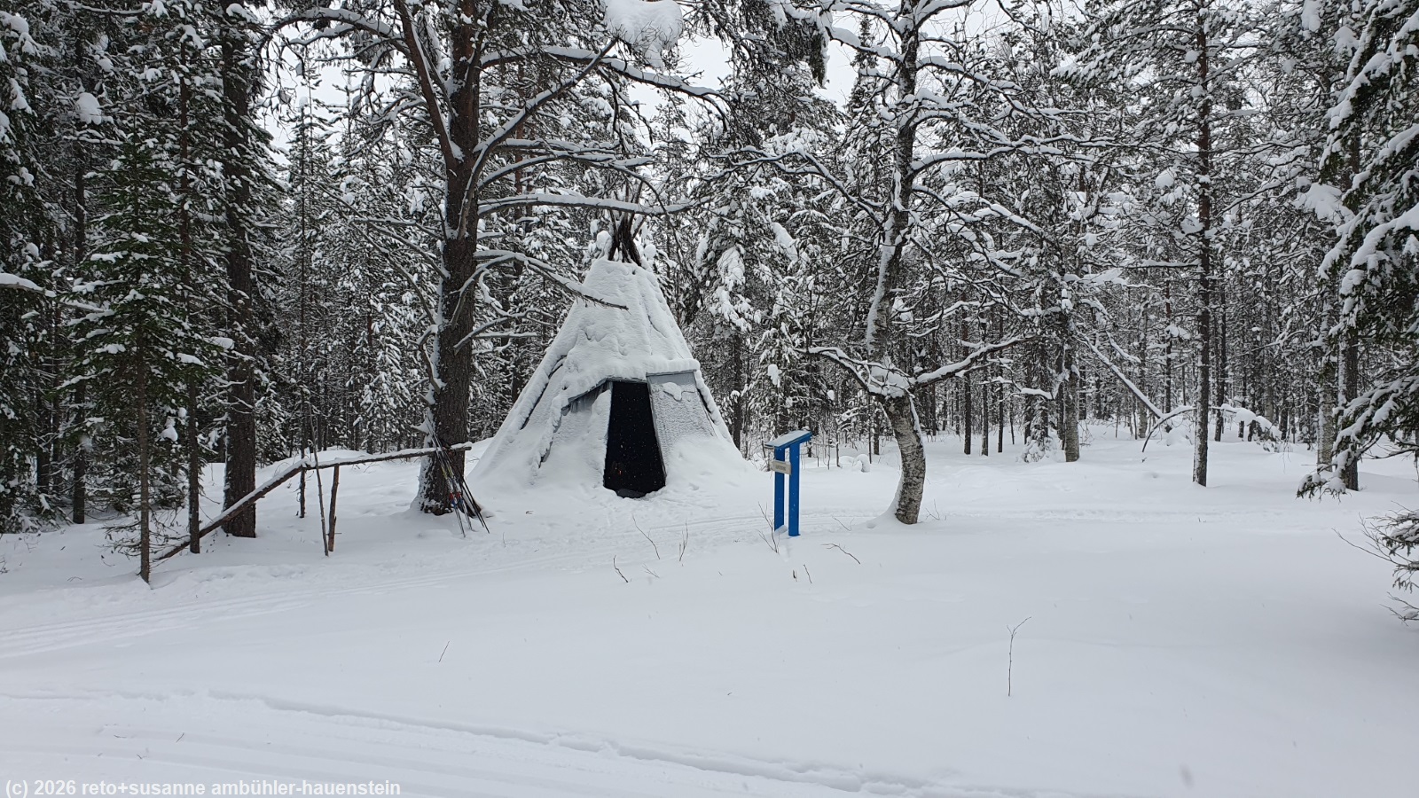 um nu hat susanne ein feuer entfacht. dieses wärmt den raum erstaunlich rasch, obwohl wir die türe nicht schliessen können. wir geniessen unser mittagessen. nach 45 minuten ist uns aber trotz des feuers kalt. beim sitzen kann man einfach die wärme nicht halten - es sei denn, die sonne scheint. wir brechen daher wieder auf. erneut geht es ein längeres stück über den posionjärvi, wobei die frisch gespurte loipe wo möglich dem ufer der kleinen inseln folgt. gegen 14:20 uhr erreichen wir das seeufer. durch den wald gelangen wir in ein wohnquartier. hier treffen wir auf den loipenmacher und seine frau. er erkennt susanne wieder und spricht sie an. seine frau ist deutsche, hat aber auch die finnische staatsbürgerschaft. wir unterhalten uns mit den beiden. die dame meint, sie würden versuchen, den tourismus in der gegend etwas anzukurbeln. die einzige andere einnahmequelle der region sei der wald und sie möchten nicht, dass dieser einfach überall abgeholzt wird. schliesslich verabschieden wir uns von den beiden und laufen zum nahen hotel lapin satu. gemäss schild an der eingangstür sollte das cafe bis 15 uhr offen haben, aber die tür zum restaurant ist geschlossen, obwohl es erst 14:35 uhr ist. bei diesem hotel sind wir schon im sommer 2023 angebrannt - irgendwie scheint man hier kein interesse an uns zu haben. wir setzen daher unsere runde fort. wir überqueren die strasse 863 und laufen wieder durch das wohnquartier, durch welches wir schon gestern in die entgegengesetzte richtung gekommen sind. am ende des wohnquartiers folgen wir der loipe in nordöstlicher richtung. eine leichte steigung bringt uns wieder zur strasse 81 hinauf. von der loipe müssen wir - wie schon zu beginn - gut 100 meter auf der strasse laufen, dann sind wir beim auto.