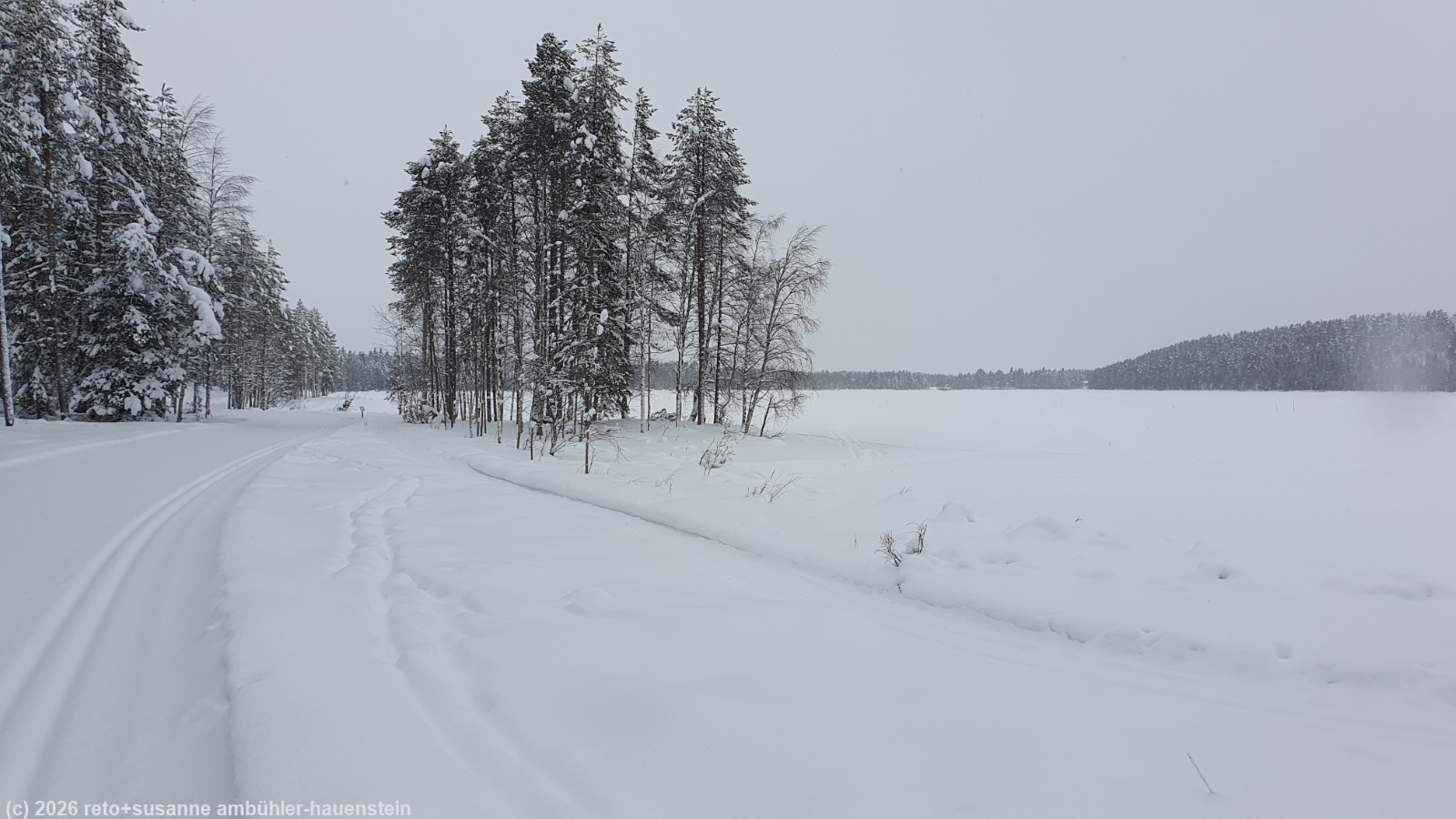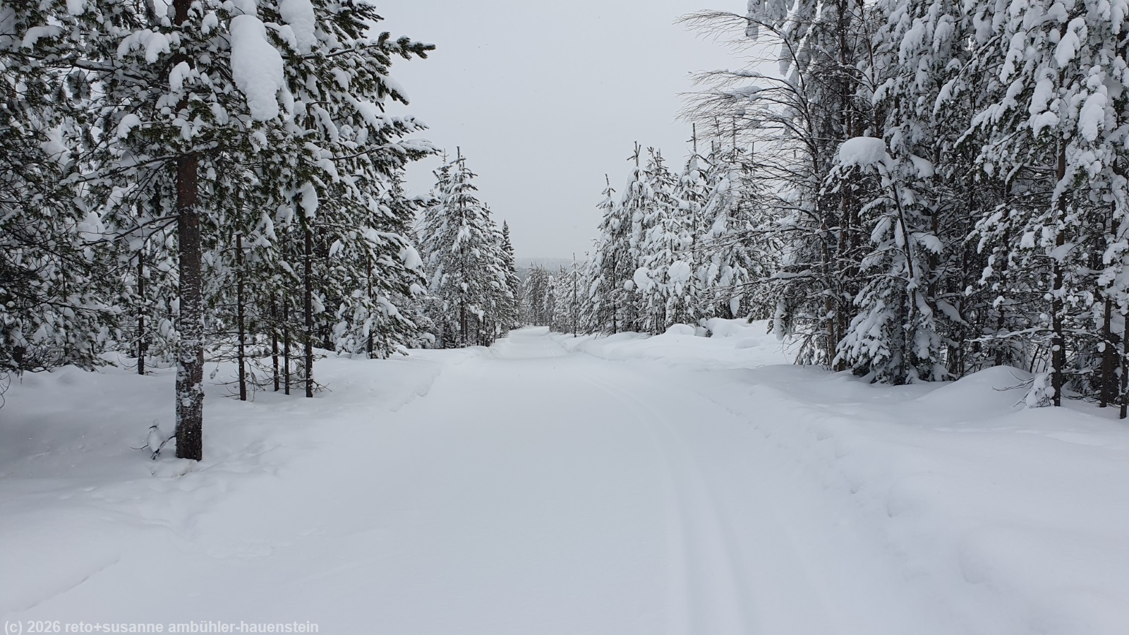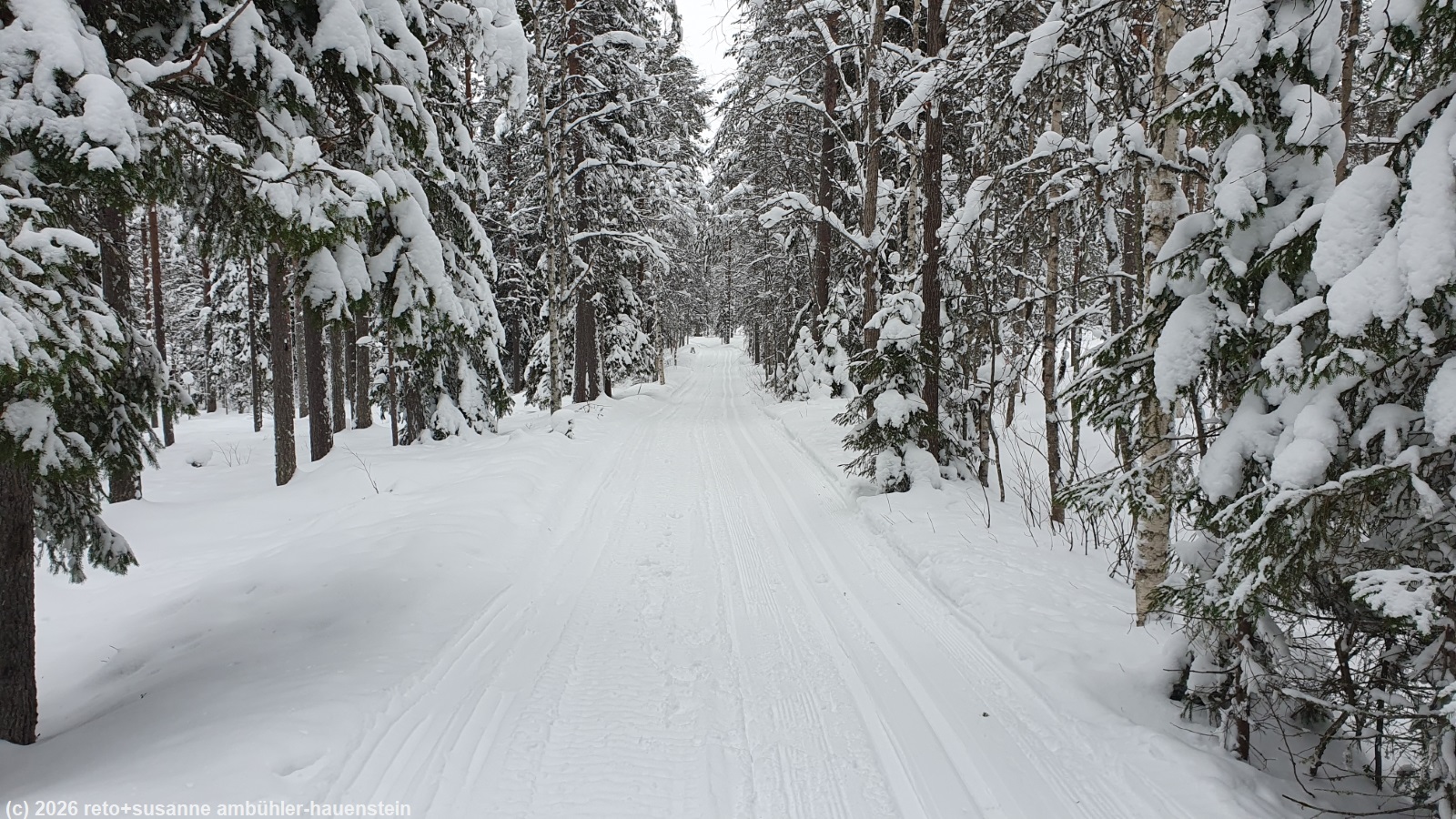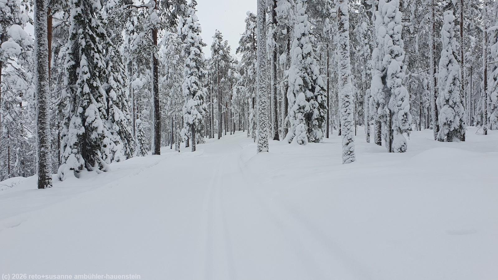 wir stehen auch heute um 8 uhr auf und frühstücken. danach fahren wir richtung posio, finden aber da, wo die loipe turjanvaaran aurinkolatu die strasse 81 kreuzt, keinen parkplatz. nach mehreren wendemanövern stellen wir unseren wagen auf einen geräumten platz nahe der loipe. wir folgen dieser nordostwärts, bis wir auf die loipe pentik-mäki - kirintövaara latu stossen. auf dieser laufen wir westwärts richtung posio. wir unterqueren die strasse 947 und nehmen dann die zusatzschleife kotivaaran latu in angriff. wir laufen durch einen fantastisch winterlichen wald mit wunderbar verschneiten bäumen. über den gefrorenen kotilahti gelangen wir auf den posionjärvi. auf diesem laufen wir erst west-, dann süd- und dann wieder westwärts bis zur kota aurinkolatu. susanne entfacht ein feuer im grill, an diesem essen wir unsere brote. 45 minuten später brechen wir wieder auf. nun laufen wir auf dem posionjärvi südwärts. nachdem wir den see verlassen haben, führt die loipe durch ein wohnquartier. wir machen einen abstecher zum hotel lapin satu, aber wie schon im sommer 2023 ist das restaurant geschlossen. durch das wohnquartier, durch das wir schon gestern gelaufen sind, gelangen wir wieder auf die loipe turjanvaaran aurinkolatu und folgen dieser zurück zu unserem wagen. beim holiday village himmerki trinken wir im restaurant einen kaffee, ich geniesse ein stück schokoladenkuchen dazu. in unserem haus machen wir zwei sitzungen in der sauna und essen anschliessend. um 19:30 uhr gehen wir wieder ins restaurant, damit susanne an ihrem online schwedischkurs teilnehmen kann, denn in unserer unterkunft gibt es kein Wi-Fi. um 21:15 uhr kehren wir wieder in unser haus zurück. susanne liest, ich beschäftige mich mit den fotos. gegen 23:15 uhr schlüpfen wir unter die bettdecke.