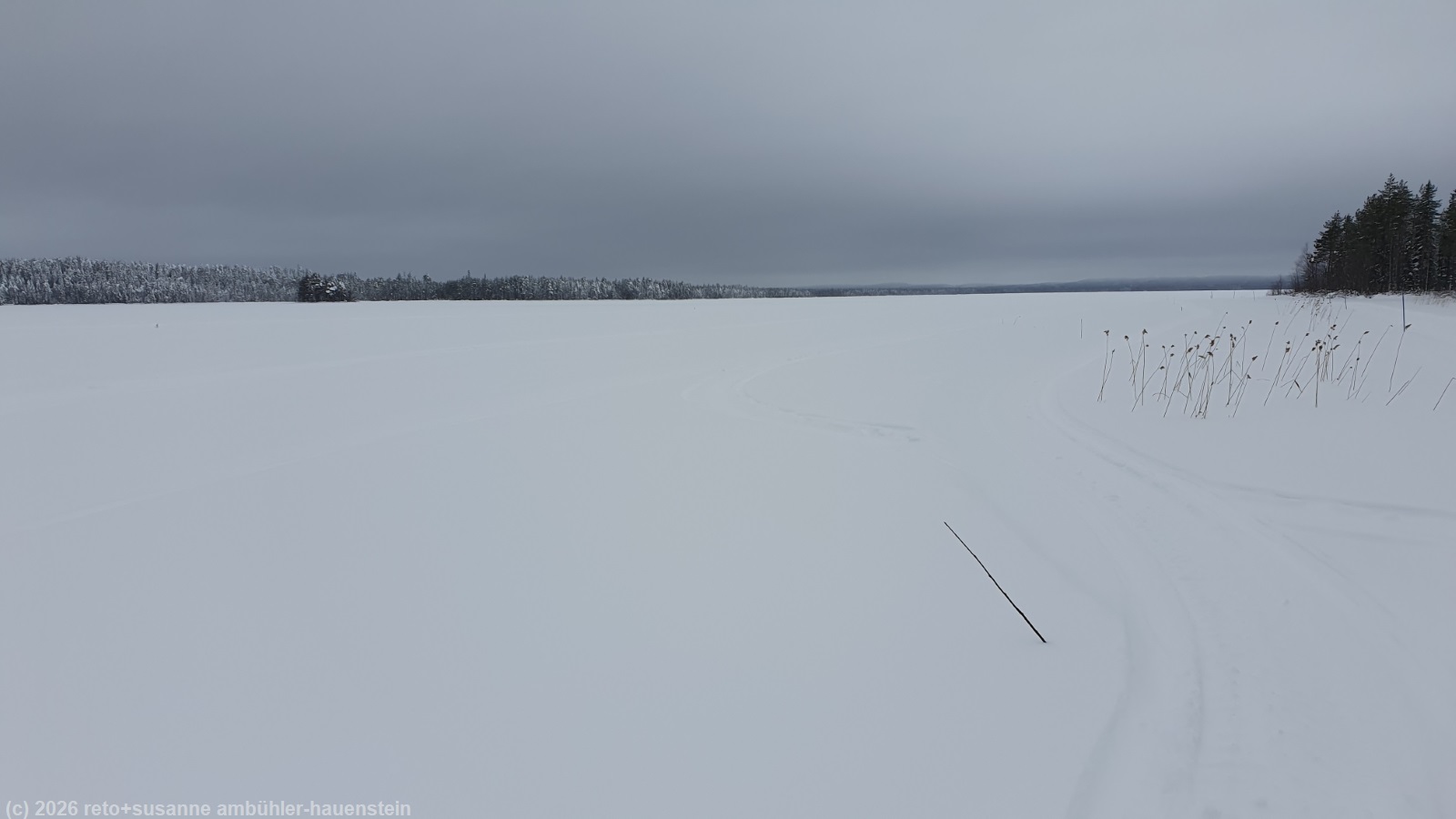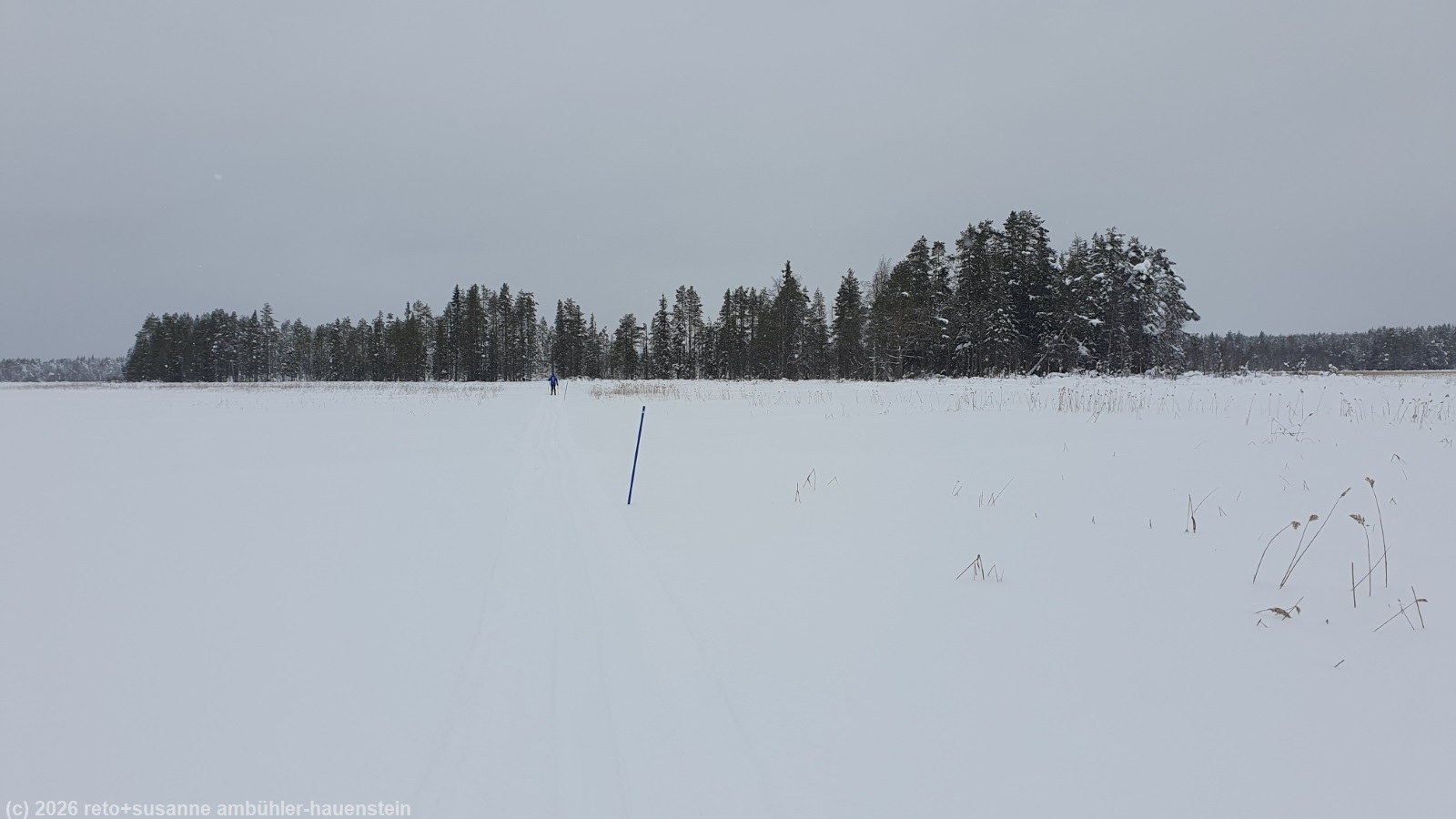 wir stehen um 8 uhr auf und frühstücken in unserer gemütlichen essküche. der himmel ist noch etwas dunkelgrauer als gestern und es fallen leichte schneeflocken. das auto vom schnee zu befreien ist einfach, ein handwischer genügt. die temperatur liegt nun immer im bereich von etwa -8°C. wir haben uns gut daran gewöhnt und empfinden es nicht mehr als so kalt. wir fahren auf der strasse 81 richtung posio und möchten da mit unserer runde beginnen, wo die loipe die strasse überquert. wir sehen zwar die loipe, aber leider hat es an dieser stelle keine parkmöglichkeit. nachdem wir dreimal gewendet haben, finden wir einen geräumten platz in einem gewerbebereich im wald. der platz ist weder als parkplatz ausgeschildert, noch steht irgendwo, dass es sich um privatgelände handelt oder dass man hier nicht parkieren dürfe. so nehmen wir uns die freiheit, unseren wagen hier stehen zu lassen. als wir um 10:30 uhr loslaufen sehen wir, dass es bei der zufahrt eine schranke hat, hoffentlich bleibt sie offen. sie sieht allerdings so alt und rostig aus, dass ich bezweifle, dass sie sich überhaupt schliessen lässt. der erste kilometer führt über die gleiche loipe, die wir gestern schon gelaufen sind, nachdem wir den bach überquert hatten, siehe auch interaktive loipenkarte region posio. heute biegen wir aber an deren nordöstlichen ende links ab. wir kommen am südwestlichen ende des vaskonjärvi vorbei und unterqueren wenig später die strasse 947. jenseits der unterführung beschliessen wir, nicht direkt südlich am kotilahti weiterzulaufen, sondern erst noch eine zusatzschleife zu machen. diese führt uns südlich am kotilampi vorbei. auf dem hinweg folgen wir mehr oder weniger dem ufer. es geht aber manchmal über kleine anhöhen. wir laufen über eine schöne loipe durch einen fantastischen wald. am westlichen ende der schleife geht es auf einen kleinen kamm hinauf. wir laufen nun etwa 30 meter über dem wasserspiegel ostwärts. der wald ist ein bisschen weniger dicht, dafür noch ein bisschen winterlicher. vom höchsten punkt haben wir für einen kurzen moment eine schöne fernsicht - das wetter ist allerdings nach wie vor ziemlich trüb. über eine einfache abfahrt geht es zum ausgangspunkt der zusatzschleife hinunter. die loipe folgt erst dem ufer des kotilahti und führt dann auf diesen hinaus. auf dem see ist es sofort spürbar kälter. das liegt wohl zum einen an der eisfläche unter den füssen, aber auch am wind, der hier nicht von bäumen aufgehalten wird. allerdings kann man kaum von wind sprechen, es ist mehr ein hauch kalter luft im gesicht. über die strasse 81 gelangen wir auf den posionjärvi. wir folgen dem ufer bis die landzunge endet. es folgt ein längerer abschnitt über den offenen see. kurz vor 13 uhr erreichen wir die halbinsel am westlichen ufer des posionjärvi. da kommt uns der loipenmacher auf seinem motorschlitten entgegen. susanne unterhält sich kurz mit ihm. wenig später sind wir bei der kota, die wir schon gestern vorübergehend als ziel fürs mittagessen im auge hatten, die uns dann aber doch zu weit entfernt war.
