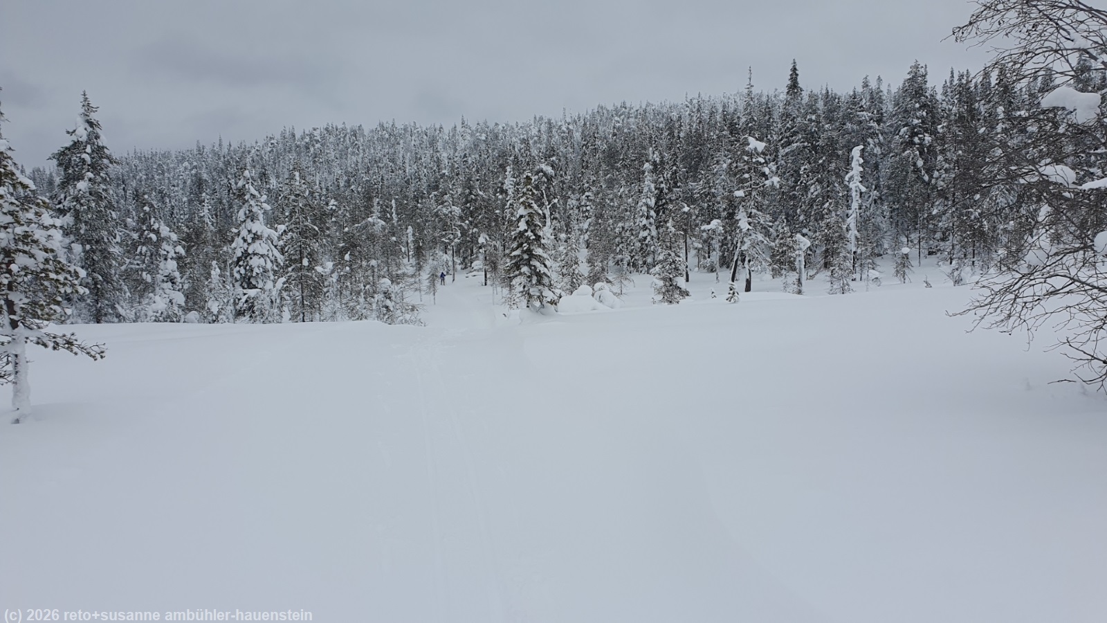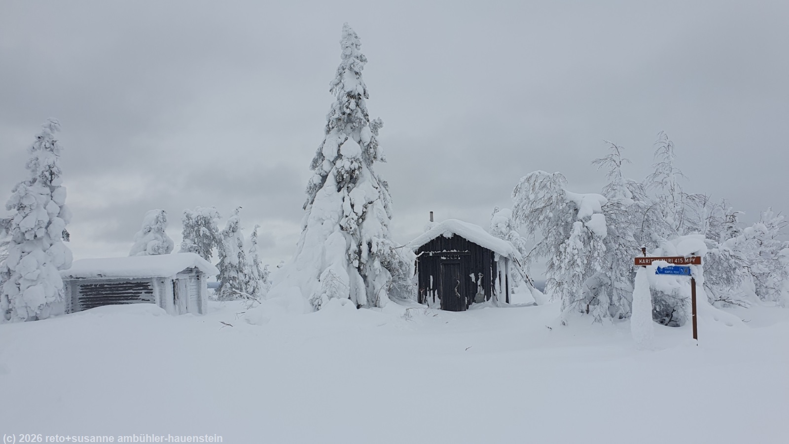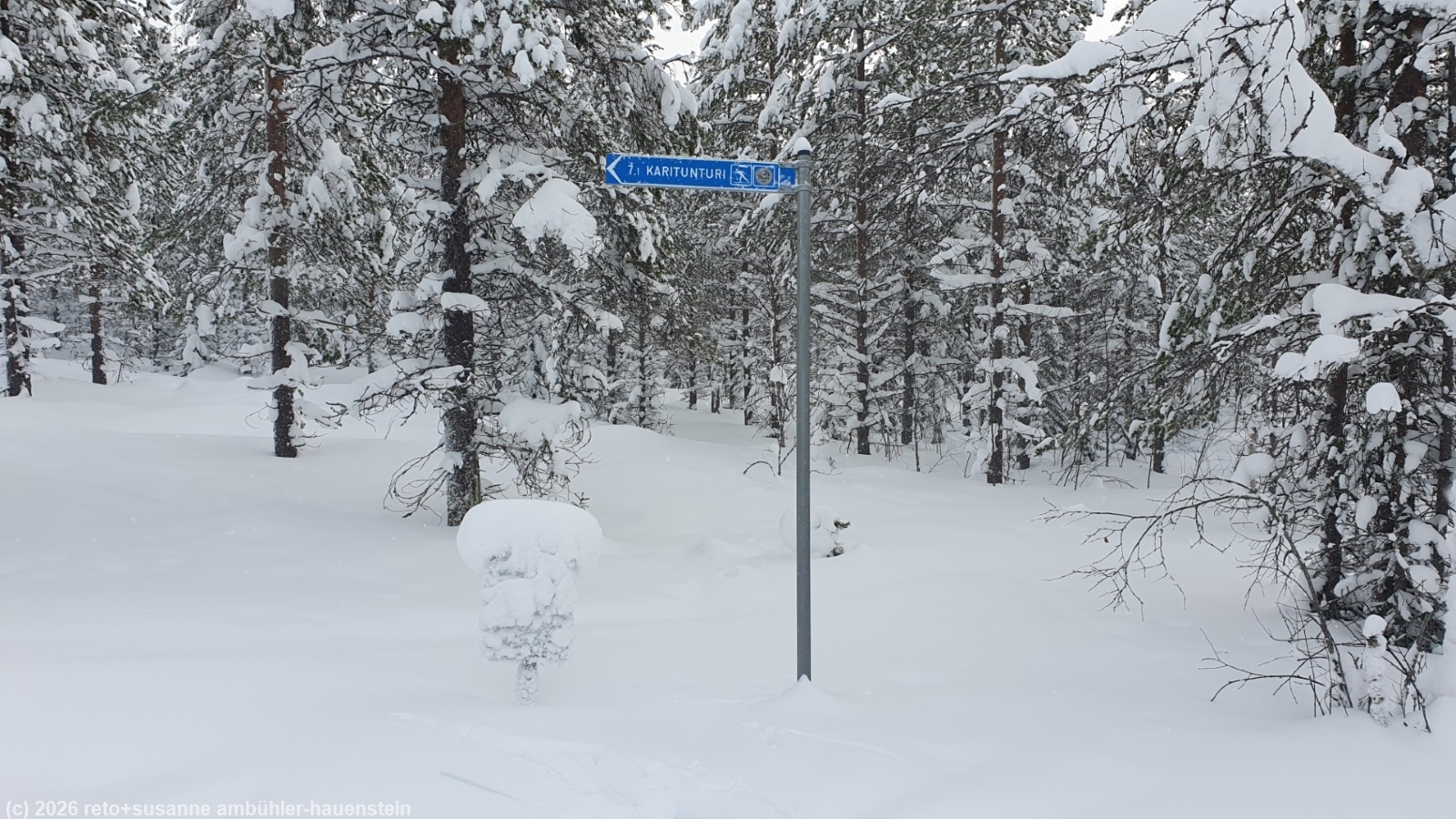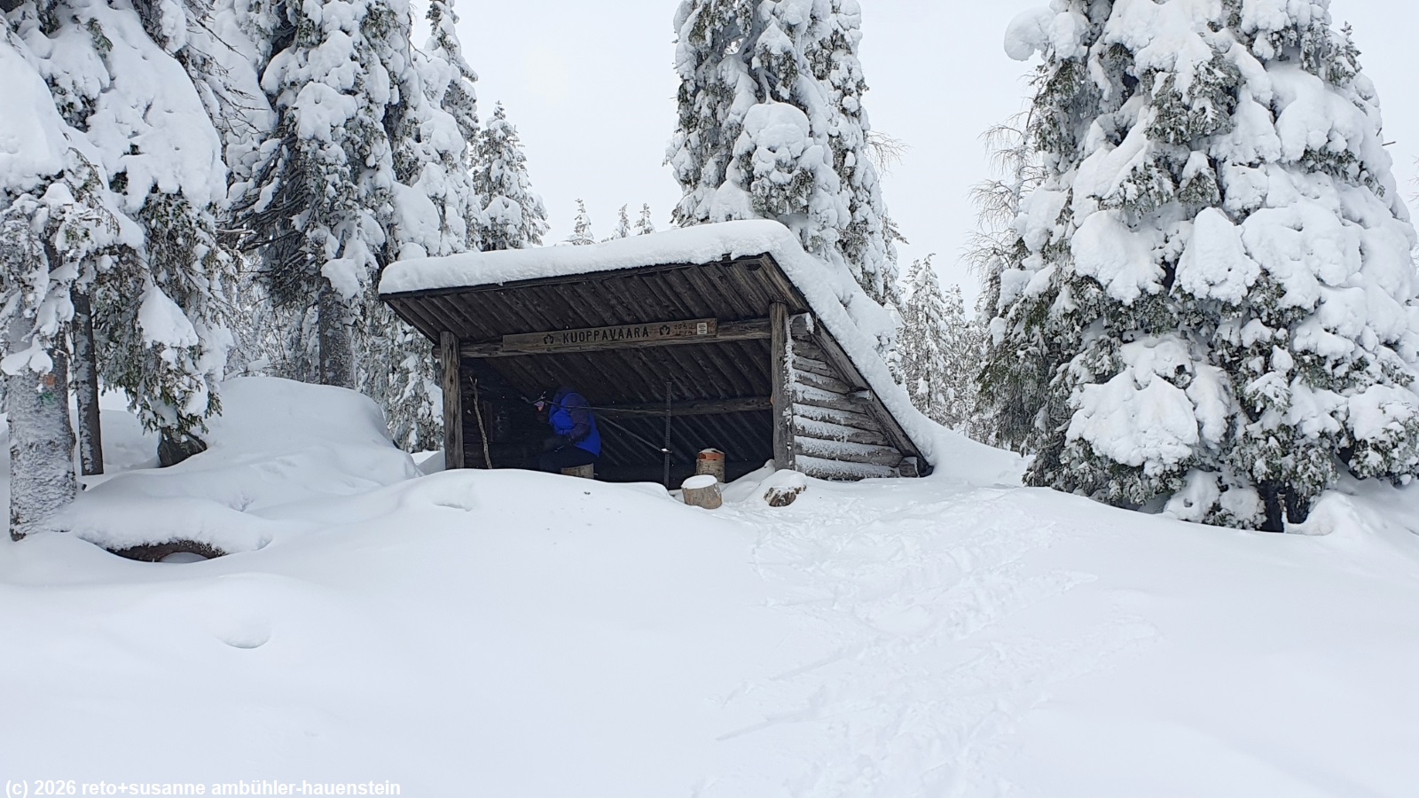 auch heute stehen wir um 8 uhr auf und frühstücken. der himmel präsentiert sich weiterhin in grau. obwohl es kaum sichtbar geschneit hat, ist der riesige radbagger den ganzen tag auf dem gelände unterwegs - das scheint mir etwas übertrieben. gegen 10 uhr befreien wir unseren wagen von dem hauch schnee und fahren zum parkplatz kirikeskus. hier beginnt unser heutiger langlauf. für einmal folgen wir nicht einem rundkurs, sondern wir wollen auf den karitunturi hinauf und müssen dann wieder den gleichen weg zurück, siehe auch interaktive loipenkarte region posio. wir brauchen einen moment, bis wir die loipe gefunden haben. auf den ersten 500 metern laufen wir über eine frisch gespurte loipe. sie führt richtung posio. doch schon bald biegen wir von dieser loipe ab. der karitunturin erämaalatu ist nicht präpariert. wir können gerade noch die spur im neuschnee erkennen. inzwischen sind wir uns diese loipen, die schon etwas länger nicht mehr unterhalten wurden, gewohnt. meistens läuft susanne voraus. manchmal ist die spur nicht mehr zu erkennen, da muss sie ein bisschen improvisieren. auf den ersten 6.5 km ist es weniger ein kontinuierlicher aufstieg, sondern mehr ein bisschen ein auf und ab. im herbst 2023 sind wir im selben gebiet schon gewandert, siehe tagebuch vom 16-sep-2023. um 11:30 uhr erreichen wir den unterstand kuoppavaara laavu, da haben wir auf der wanderung zu mittag gegessen. heute machen wir hier nur kurz rast, denn wir wollen ja auf den karitunturi.