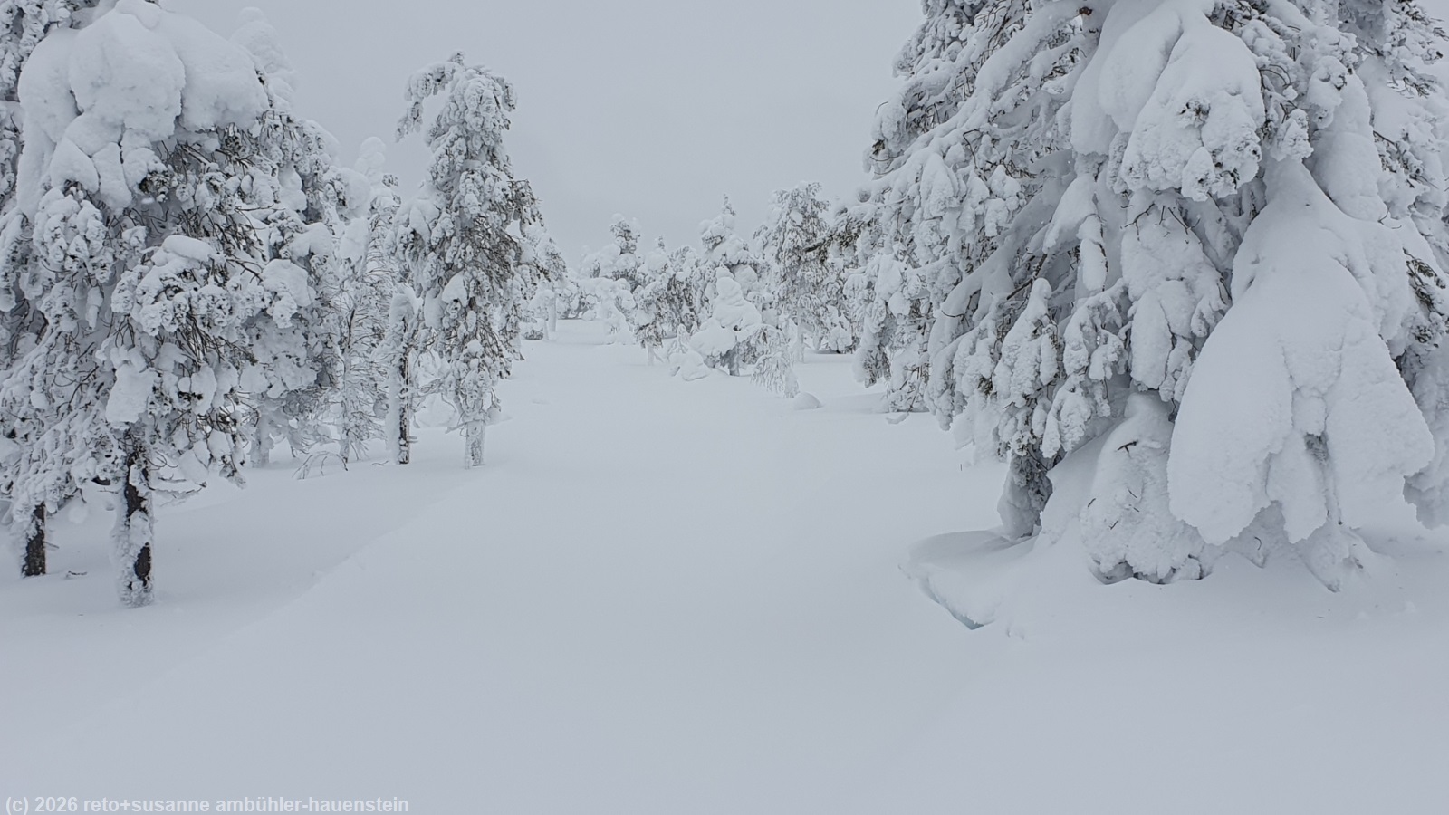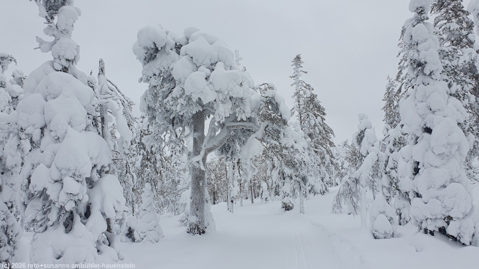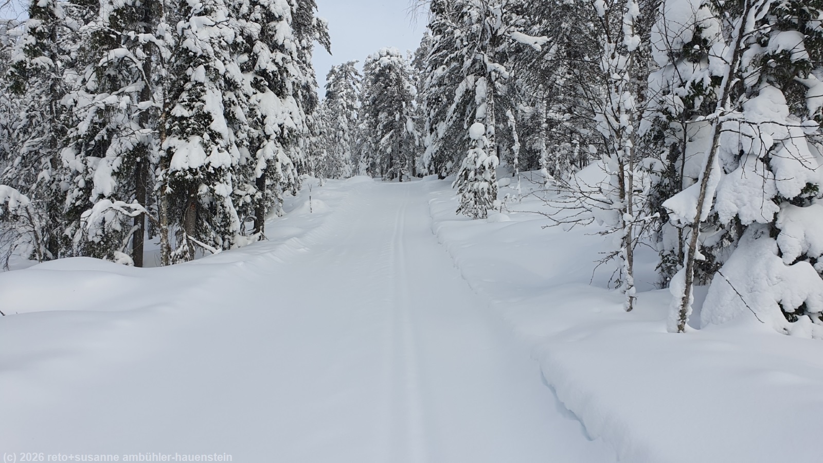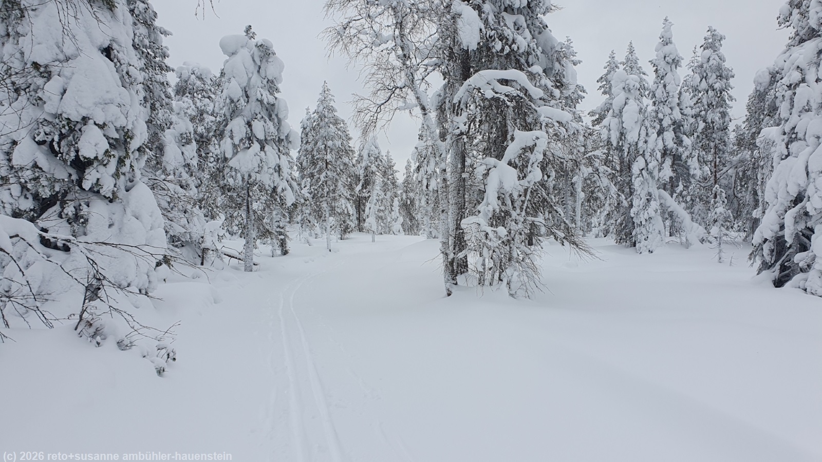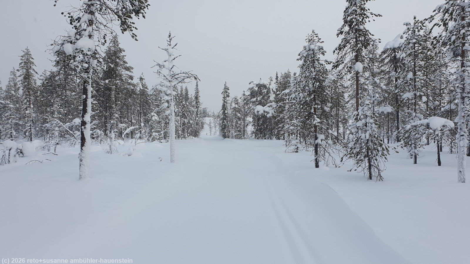auch heute stehen wir um 8 uhr auf und frühstücken. der himmel präsentiert sich weiterhin in grau. obwohl es kaum sichtbar geschneit hat, ist der riesige radbagger den ganzen tag auf dem gelände unterwegs - das scheint mir etwas übertrieben. gegen 10 uhr befreien wir unseren wagen von dem hauch schnee und fahren zum parkplatz kirikeskus. hier beginnt unser heutiger langlauf. für einmal folgen wir nicht einem rundkurs, sondern wir wollen auf den karitunturi hinauf und müssen dann wieder den gleichen weg zurück, siehe auch interaktive loipenkarte region posio. wir brauchen einen moment, bis wir die loipe gefunden haben. auf den ersten 500 metern laufen wir über eine frisch gespurte loipe. sie führt richtung posio. doch schon bald biegen wir von dieser loipe ab. der karitunturin erämaalatu ist nicht präpariert. wir können gerade noch die spur im neuschnee erkennen. inzwischen sind wir uns diese loipen, die schon etwas länger nicht mehr unterhalten wurden, gewohnt. meistens läuft susanne voraus. manchmal ist die spur nicht mehr zu erkennen, da muss sie ein bisschen improvisieren. auf den ersten 6.5 km ist es weniger ein kontinuierlicher aufstieg, sondern mehr ein bisschen ein auf und ab. im herbst 2023 sind wir im selben gebiet schon gewandert, siehe tagebuch vom 16-sep-2023. um 11:30 uhr erreichen wir den unterstand kuoppavaara laavu, da haben wir auf der wanderung zu mittag gegessen. heute machen wir hier nur kurz rast, denn wir wollen ja auf den karitunturi.