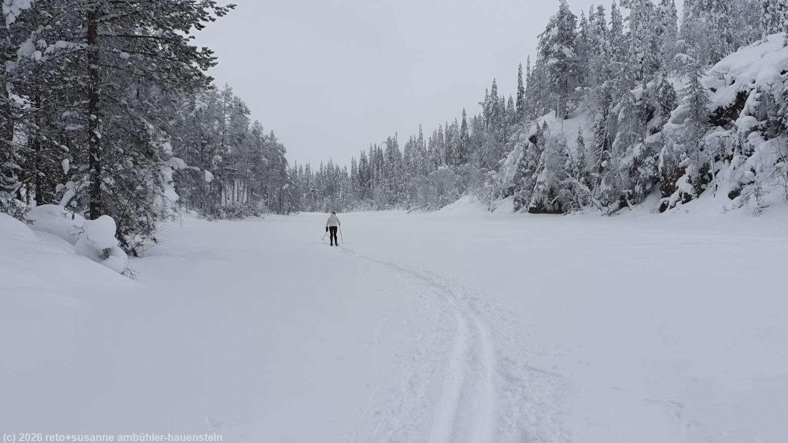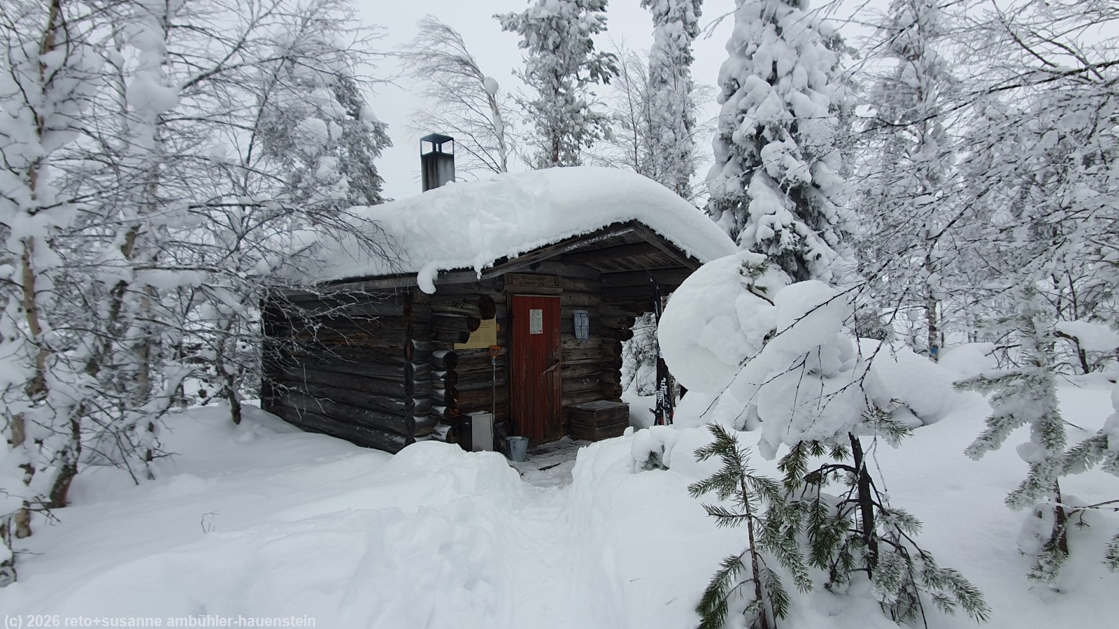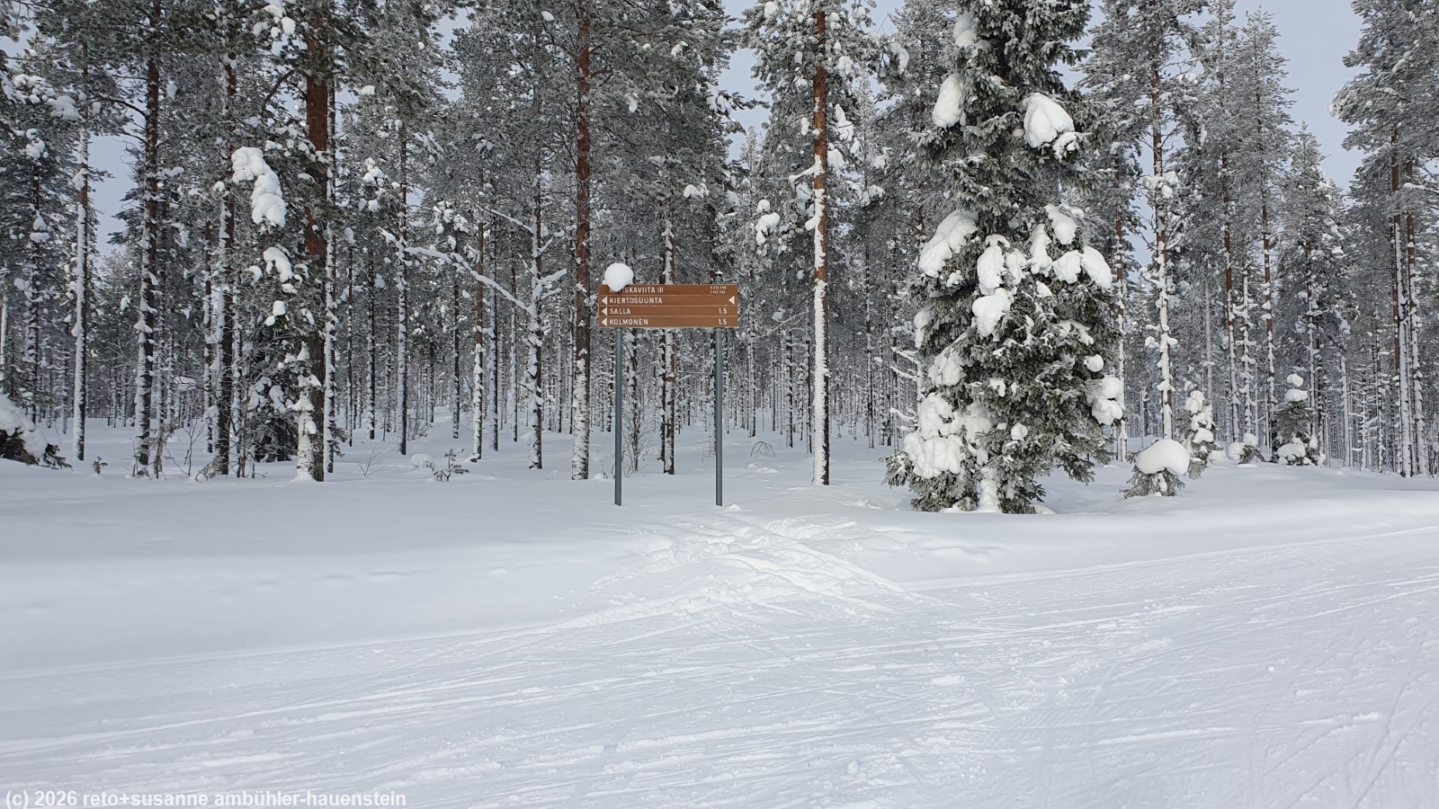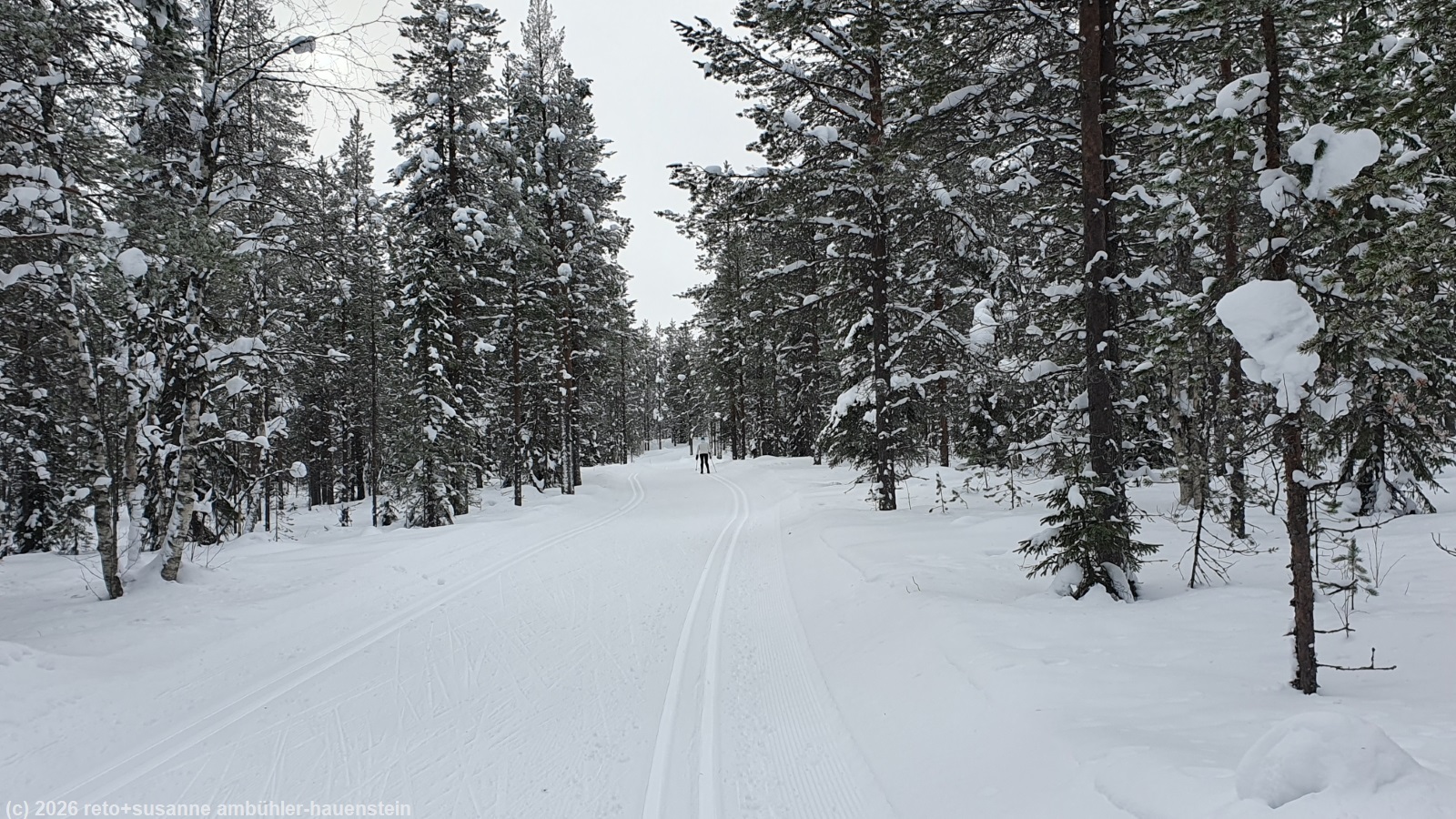 der motorschlitten steht vor der hütte, ein mann in einem overall hantiert an diesem herum. in der schutzhütte ist es angenehm warm. am tisch sitzen zwei männer und zwei frauen und picknicken. der mann im overall erscheint und montiert einen feuerlöscher und einen brandmelder. das mutet angesichts des drama in crans-montana am vergangenen silvester etwas eigenartig an. während wir unsere brote verzehren, macht sich erst der mann mit dem motorschlitten und etwas später auch die vierergruppe wieder auf den weg, so dass wir das häuschen für uns alleine haben. gegen 14:30 uhr brechen auch wir wieder auf. über die spur des motorschlittens stapfen wir zum see hinunter. über diesen laufen wir ostwärts. die spur ist ziemlich holprig. am ende des sees geht es erst ein stück durch wald und dann durch ein schmales tal. am ende des tals beginnt die präparierte loipe genau so unvermittelt wie sie geendet hatte. auf den knapp 6 km bis sallatunturi hat es zwei längere abfahrten, um in den ort zu gelangen müssen wir nochmals einige höhenmeter überwinden. den abschnitt von hier bis zum restaurant sallan maja sind wir schon einmal gelaufen. susanne muss auf den letzten kilometer etwas kämpfen. mit über 33 km ist dies eine sehr lange runde geworden. kurz nach 16:30 uhr sind wir wieder beim wagen.