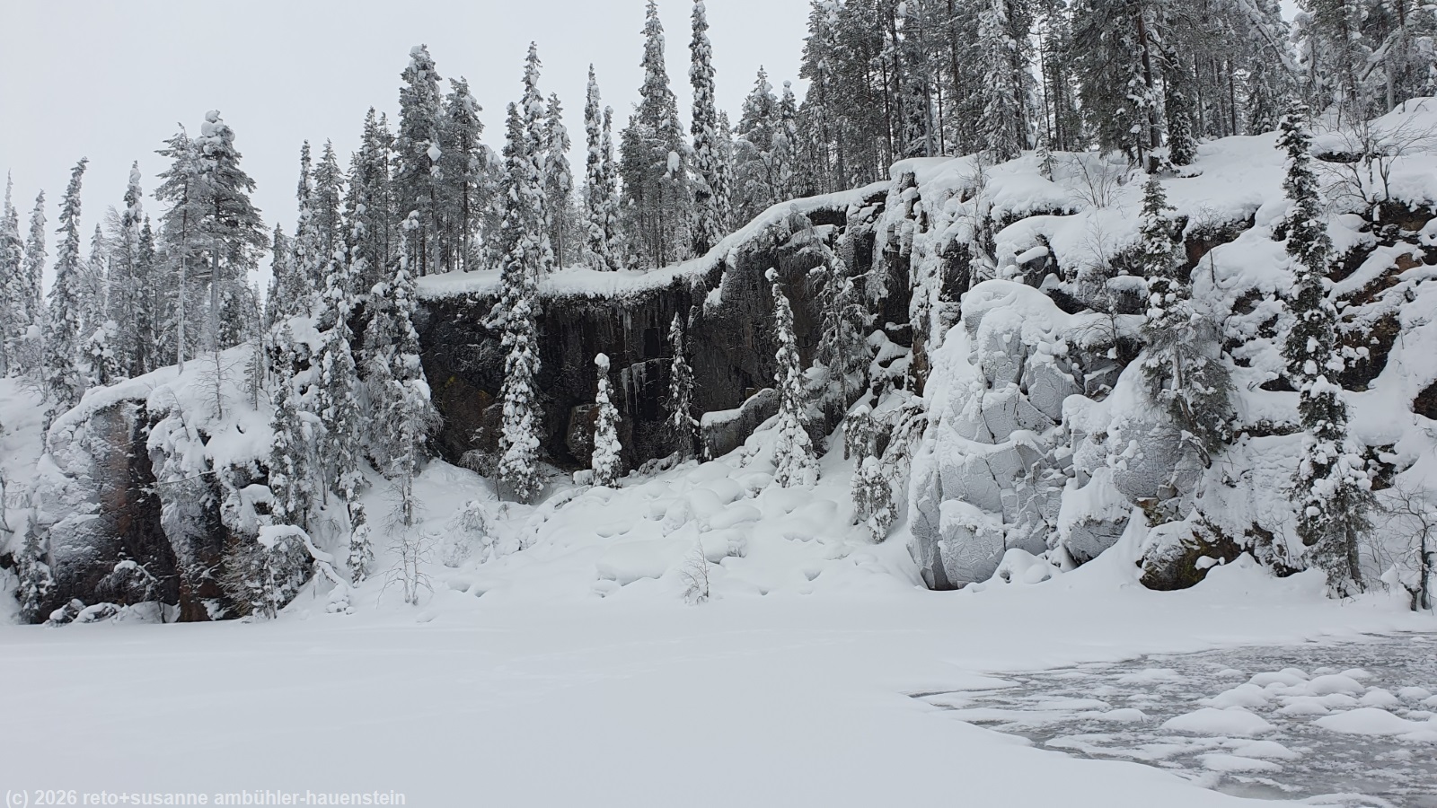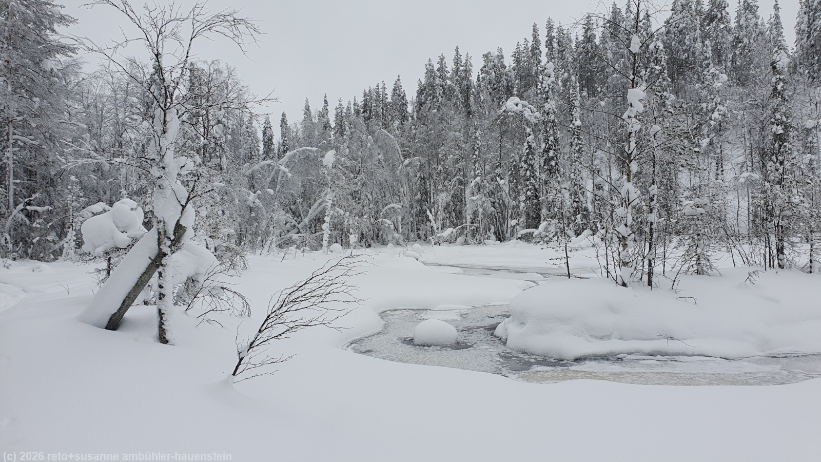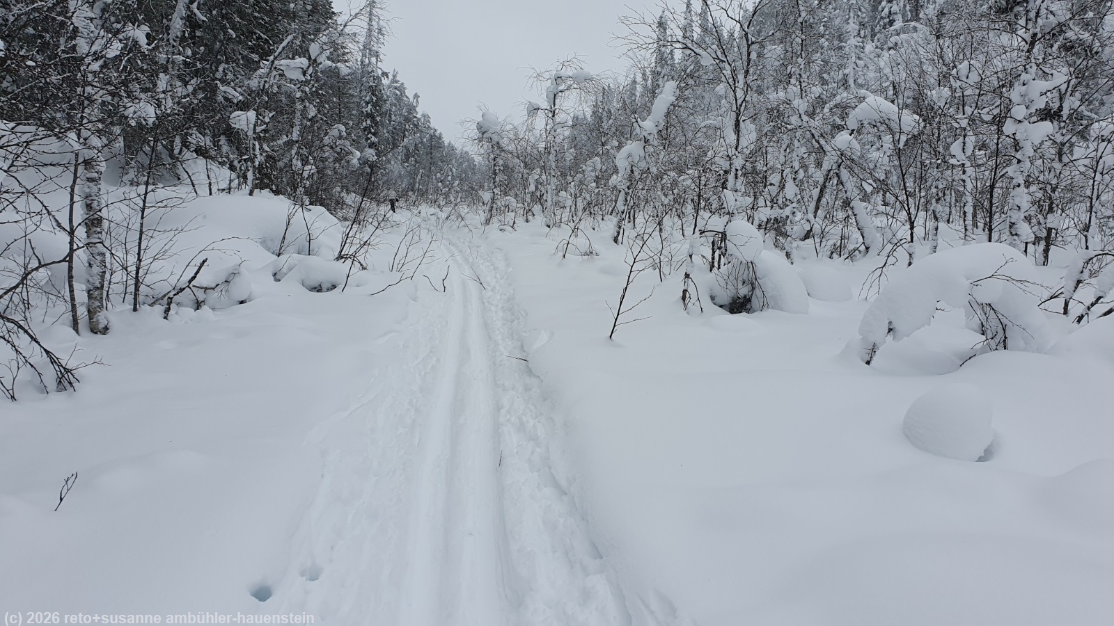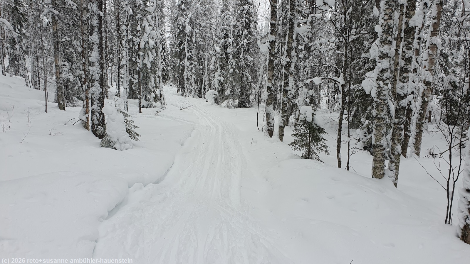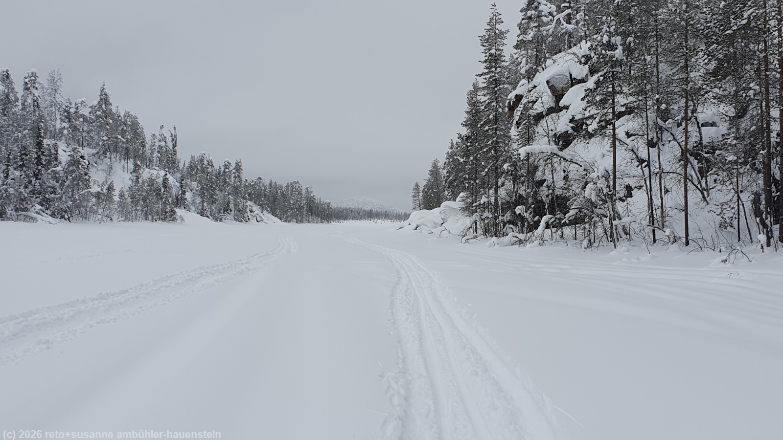 der motorschlitten steht vor der hütte, ein mann in einem overall hantiert an diesem herum. in der schutzhütte ist es angenehm warm. am tisch sitzen zwei männer und zwei frauen und picknicken. der mann im overall erscheint und montiert einen feuerlöscher und einen brandmelder. das mutet angesichts des drama in crans-montana am vergangenen silvester etwas eigenartig an. während wir unsere brote verzehren, macht sich erst der mann mit dem motorschlitten und etwas später auch die vierergruppe wieder auf den weg, so dass wir das häuschen für uns alleine haben. gegen 14:30 uhr brechen auch wir wieder auf. über die spur des motorschlittens stapfen wir zum see hinunter. über diesen laufen wir ostwärts. die spur ist ziemlich holprig. am ende des sees geht es erst ein stück durch wald und dann durch ein schmales tal. am ende des tals beginnt die präparierte loipe genau so unvermittelt wie sie geendet hatte. auf den knapp 6 km bis sallatunturi hat es zwei längere abfahrten, um in den ort zu gelangen müssen wir nochmals einige höhenmeter überwinden. den abschnitt von hier bis zum restaurant sallan maja sind wir schon einmal gelaufen. susanne muss auf den letzten kilometer etwas kämpfen. mit über 33 km ist dies eine sehr lange runde geworden. kurz nach 16:30 uhr sind wir wieder beim wagen.