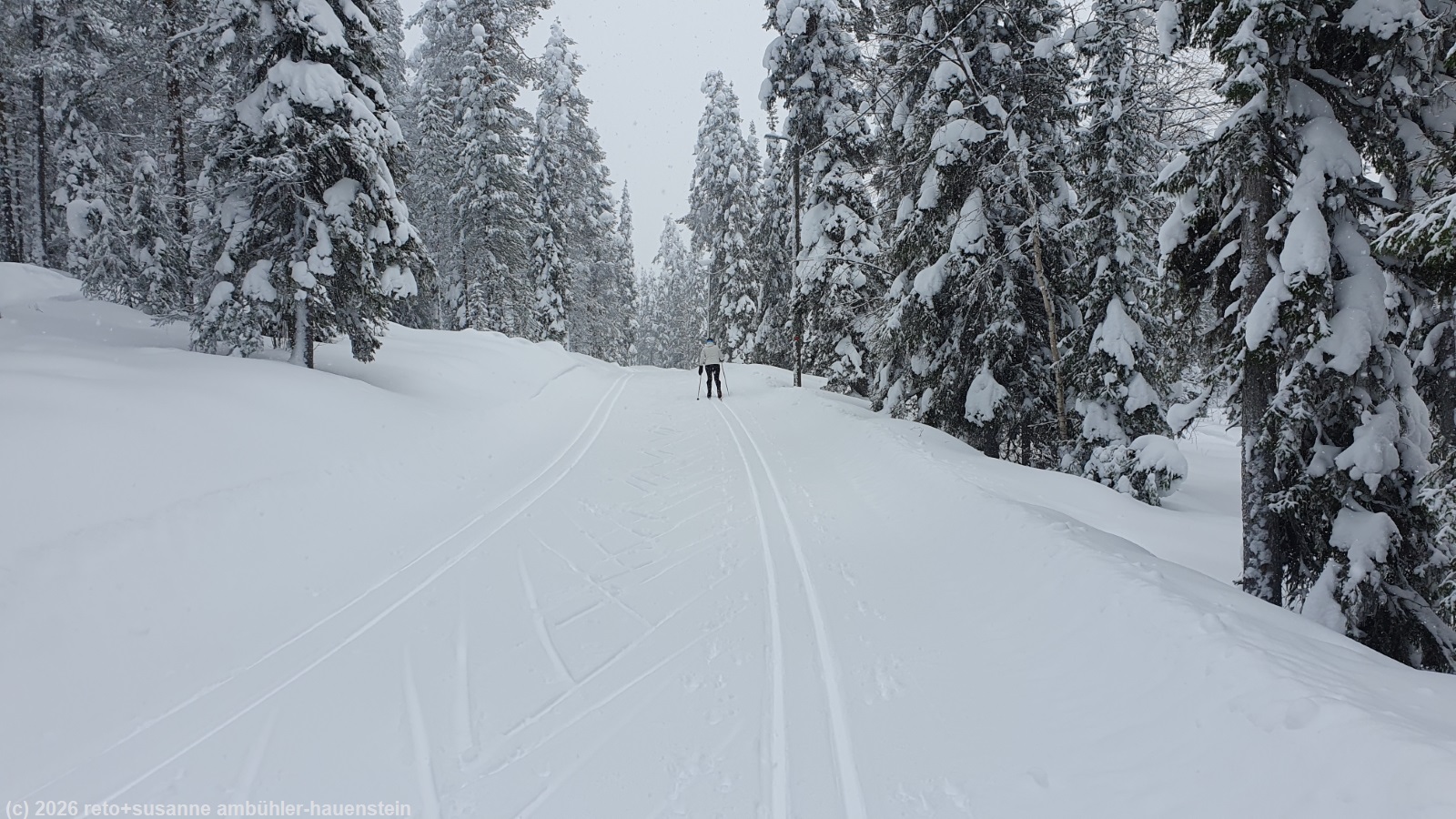 wir stehen kurz nach 8 uhr auf. draussen schweben federleichte schneeflocken vom himmel. vor dem frühstück starten wir einmal mehr die waschmaschine. als die wäsche gewaschen ist, machen wir uns auf den weg zum parkplatz bei der talstation sallatunturi. wir laufen heute eine rundstrecke, welche im wesentlichen dem sommerwanderweg "kaunisharjun kierros" folgt. einen teil davon sind wir schon am vergangenen sonntag gelaufen, allerdings in die entgegengesetzte richtung. auf den ersten 6 km ist das gelände eher flach. beim östlichsten punkt der schleife beginnt der aufstieg zum itärinteet. um 12:30 uhr erreichen wir den höchsten punkt. während wir im offenen unterstand itärinteen grillikatos picknicken, lockert sich die wolkenschicht auf und es wird richtig sonnig. bevor wir wieder aufbrechen, trinken wir in der itäkota einen kaffee. nun folgt eine längere abfahrt. um 14 uhr sind wir wieder beim auto. wir haben noch zeit und energie für eine zweite runde. der aufstieg zum höchsten punkt wird durch eine sportliche abfahrt unterbrochen. die eigentliche abfahrt auf der südflanke des pieni pyhätunturi ist weniger rassant. um 15:15 uhr sind wir wieder in sallatunturi. wir trinken etwas in der ihmekota, danach retournieren wir die langlaufausrüstung. kurz nach 16 uhr sind wir wieder bei unserem haus. wir starten noch eine maschine mit schmutziger wäsche und geniessen zwei sitzungen in der sauna. nach dem nachtessen arbeiten wir an unseren computern. vor dem zu bett gehen packen wir unsere rucksäcke, damit wir morgen gegen 8 uhr losfahren können.