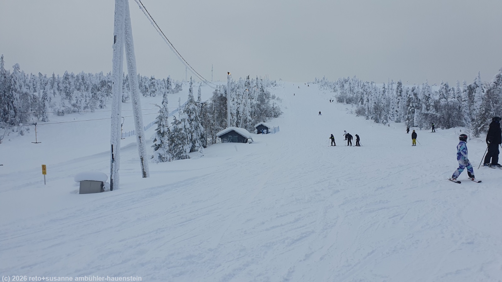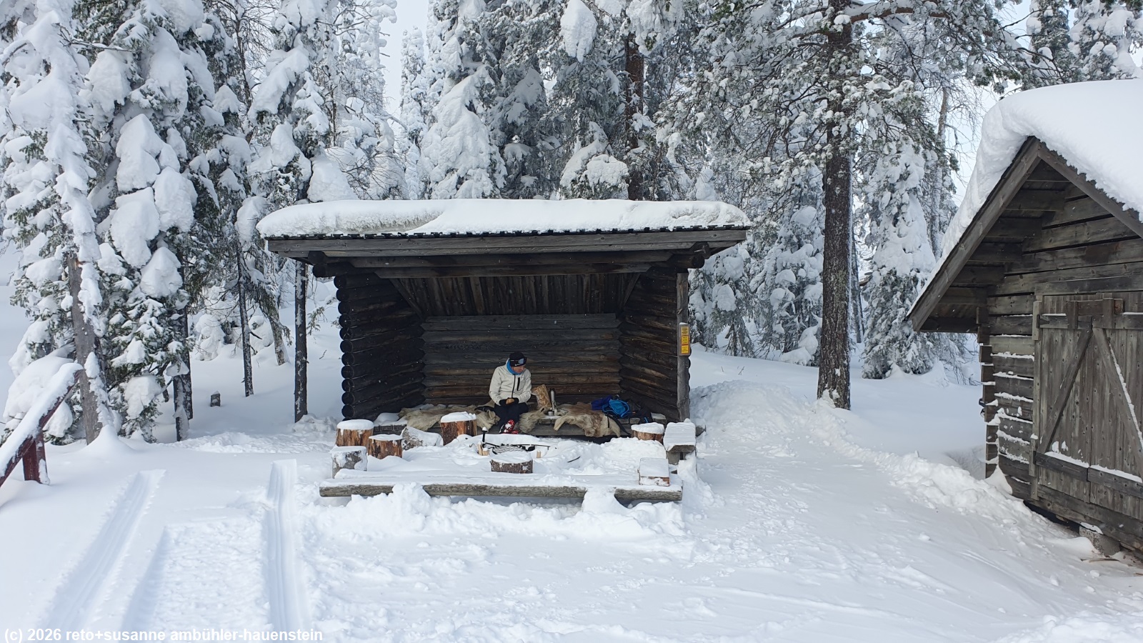 am skilift herrscht reger betrieb. die wolken lockern sich auf, bald scheint die sonne. da man in der schutzhütte neben dem cafe nicht picknicken darf, setzen wir uns in den etwas weiter entfernten offenen unterstand. immerhin liegen auch hier rentierfelle und es ist gar nicht so kalt. die feuerstelle ist zugeschneit, wir versuchen gar nicht erst ein feuer zu machen. doch kaum haben wir uns gesetzt, kommt ein junger finne, räumt den schnee aus dem feuerring und beginnt mit holz und rinde von birken ein feuer vorzubereiten. nur streichhölzer hat er keine. da können wir aushelfen. er schafft es, mit einem einzigen streichholz ein schönes feuer zu entfachen, eine stolze leistung. als es richtig schön brennt, kommen weitere junge leute dazu. sie werden wohl bald ihre würste braten. wir statten dem cafe in der kleinen hütte einen besuch ab und erfrischen uns mit kaffee und köstlichem schokoladekuchen.