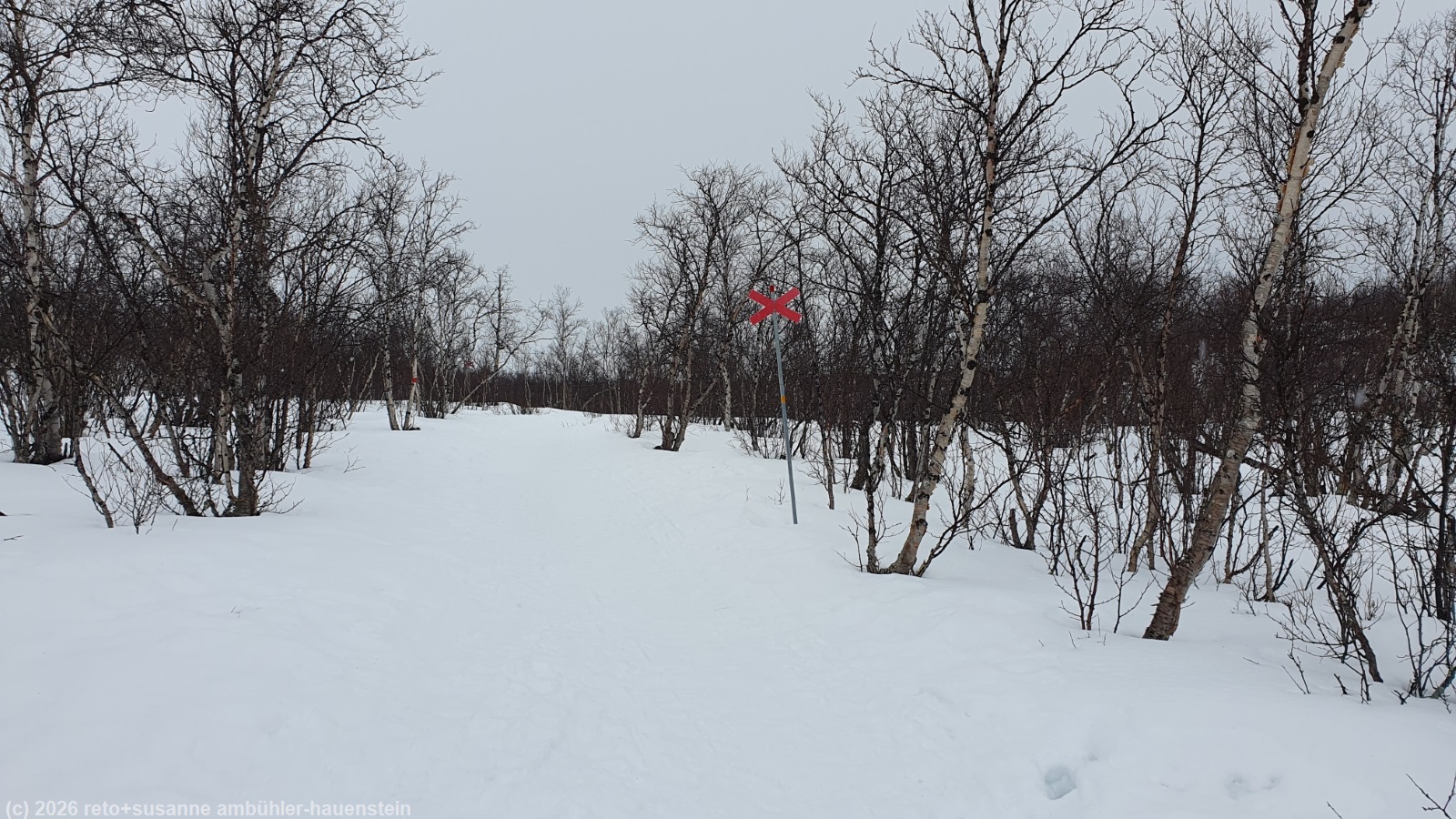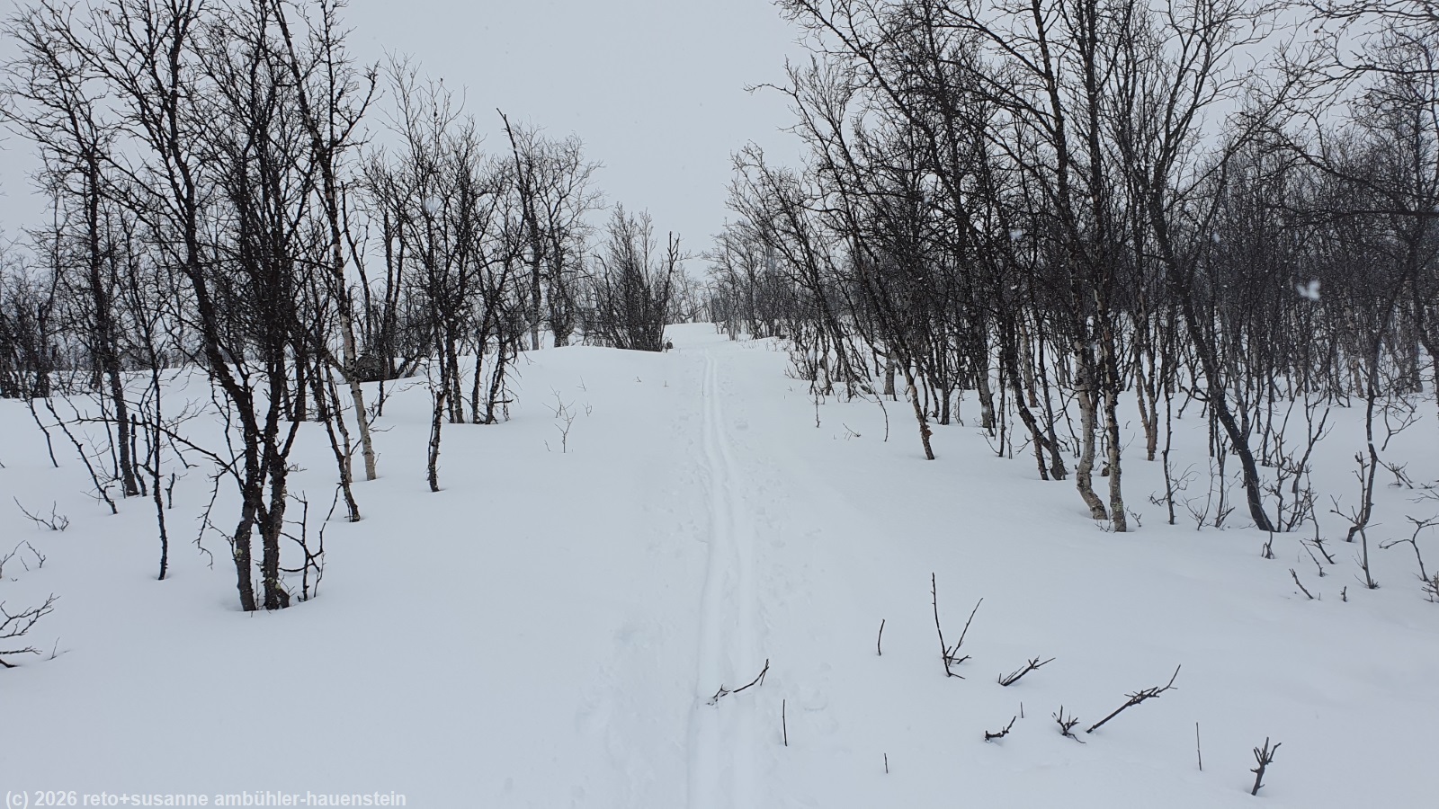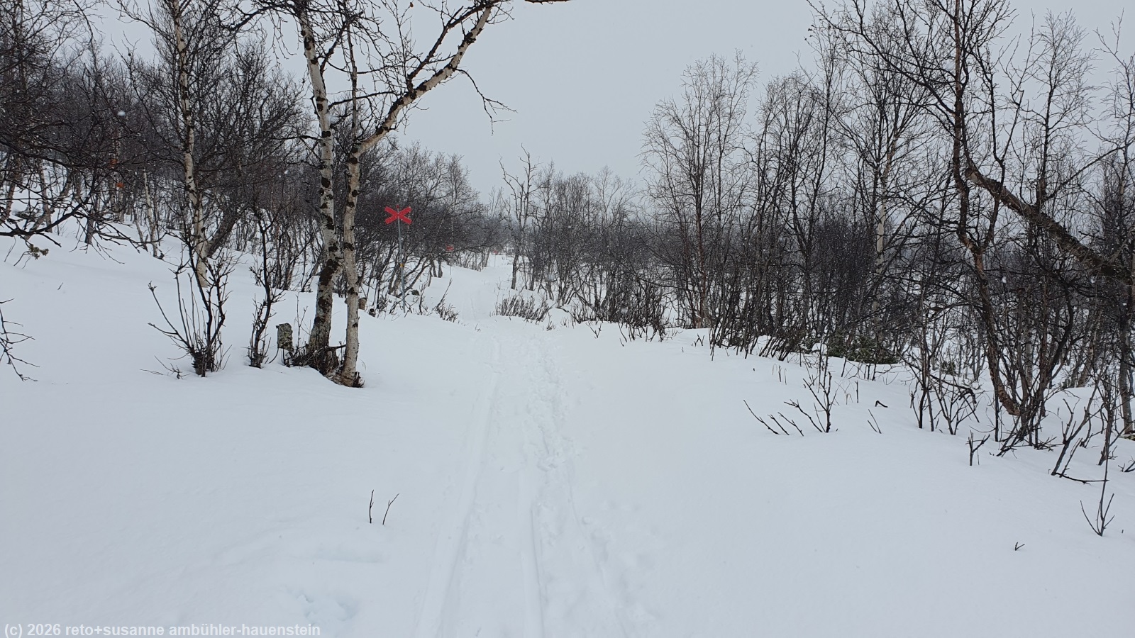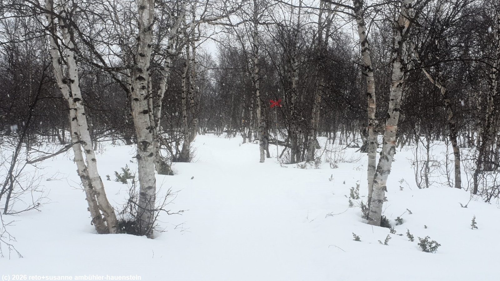 als wir kurz nach 8 uhr aufstehen ist der himmel trüb und es fällt schneeregen. beim frühstück ist das restaurant auch heute gut besucht. wir geniessen das reichhaltige buffet. zurück auf dem zimmer beraten wir, welche tour wir heute machen wollen. susanne meint, wenn wir etwas in die höhe gehen, sollte es zumindest schneien und nicht regnen. wir nehmen eine ähnliche runde in angriff, wie wir sie schon im winter 2022 und im sommer 2023 gelaufen sind. der winterwanderweg ist gut zu erkennen, es gibt auch eine skispur, der wir folgen können. der schneefall nimmt eher zu, aber die schneemenge ist an manchen stellen bedenklich gering. susanne hat die fellstreifen von anfang an montiert. als es etwas steiler wird, montiere auch ich die fellstreifen. die skis bieten extrem guten halt. ich könnte selbst die steilsten stellen einfach gerade hinaufsteigen, aber es ist so steil, dass ich nicht mehr stehen kann und die skis trotzdem querstellen muss. nach einigen kilometer kommen uns zwei junge frauen zu fuss entgegen. sie haben mit ihren fussstapfen die schöne spur ziemlich zertrampelt, das ist etwas schade. nach knapp 5 km befinden wir uns auf einem kleinen zwischengifpel auf 600 m.ü.m. ich bin während dem aufstieg ganz schön ins schwitzen gekommen, obwohl ich mich heute noch etwas leichter angezogen habe als gestern. nach einer kleinen abfahrt erreichen wir eine weggabelung, bei der eine alternative route zurück nach abisko beginnt. da noch nicht einmal mittag ist, entscheiden wir uns, noch ein stück weiter zu laufen und dann wieder hierher zurück zu kommen. wir befinden uns nun über der baumgrenze und folgen den roten kreuzen richtung kårsavaggestugan. bis zur hütte ist es leider zu weit für einen tagesausflug, denn mit den waldskis kommen wir kaum schneller voran als zu fuss. da wo der weg richtung njulla abzweigt, kehren wir wieder um. kurz vor der oben erwähnten verzweigung setzen wir uns unter eine gruppe birken und essen zu mittag.