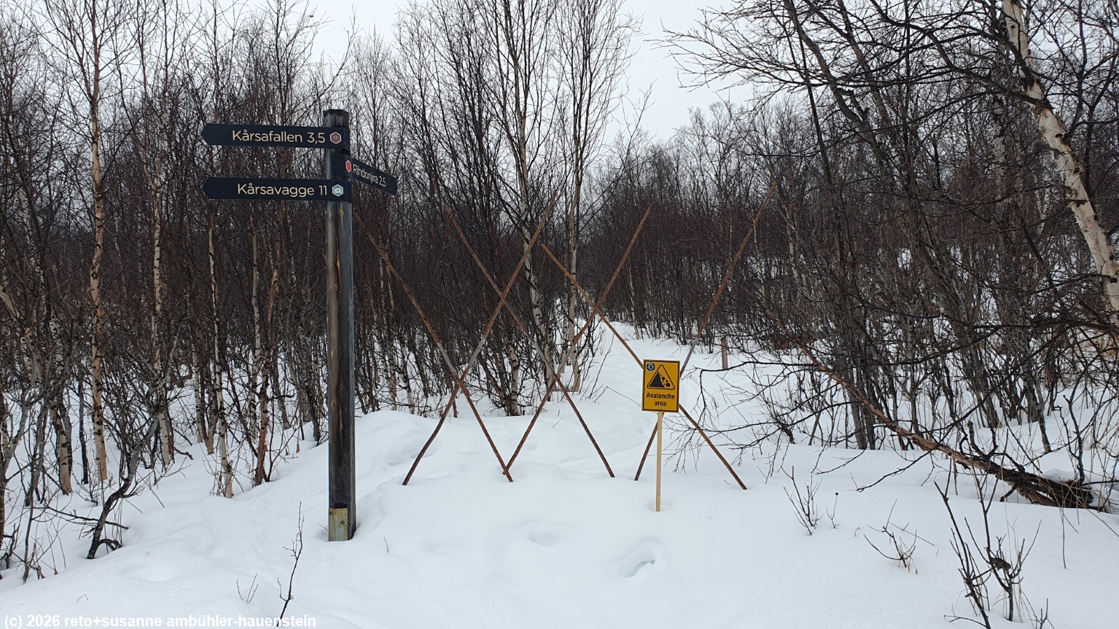 | weg von der abisko turiststation richtung kårsavagge | wegweiser und warnschild entlang des weges |