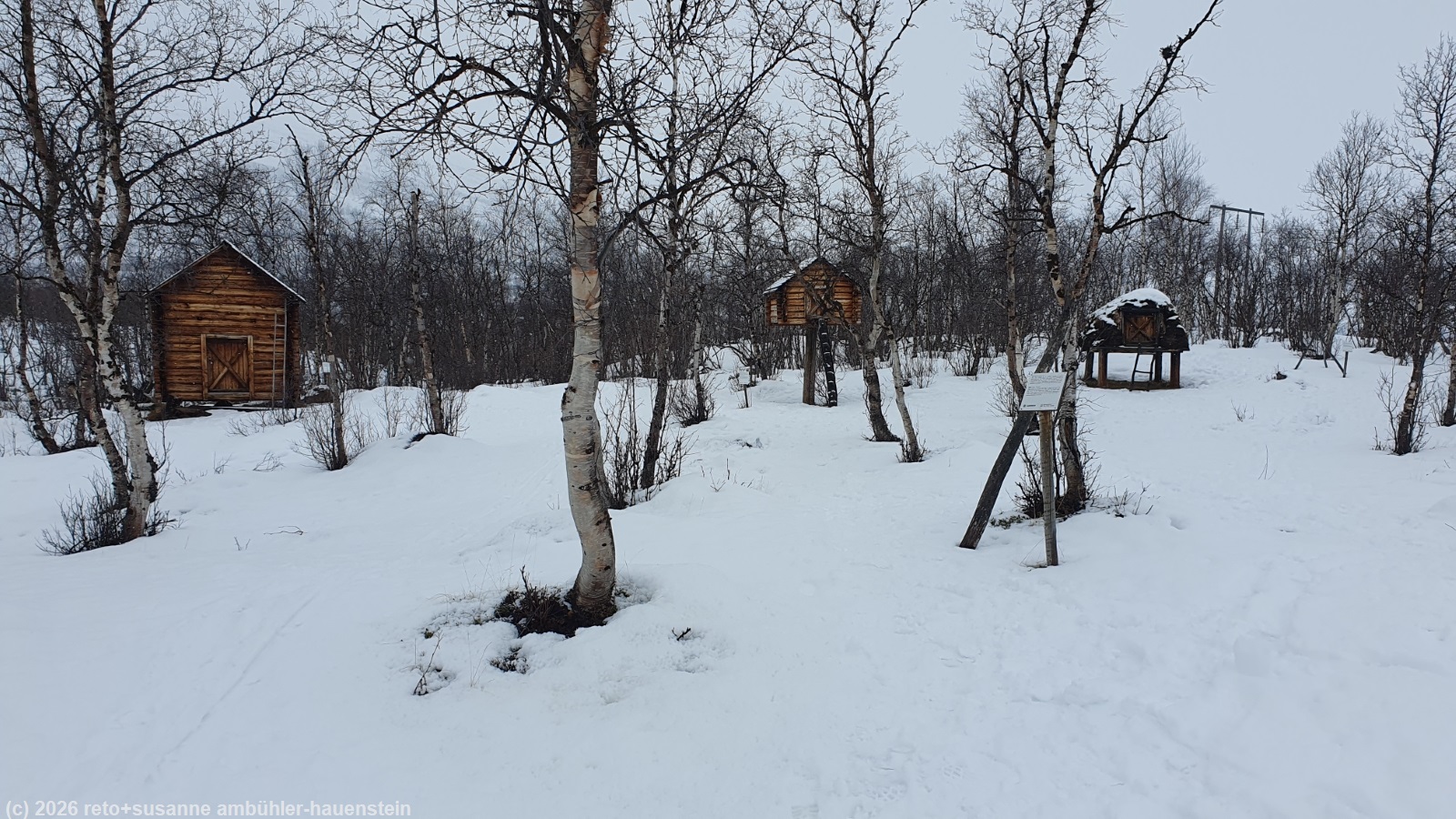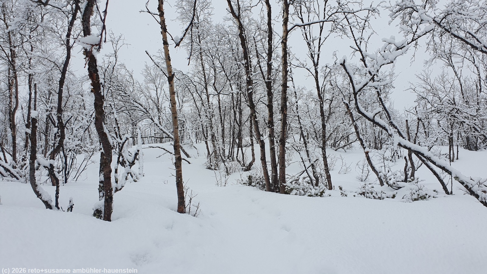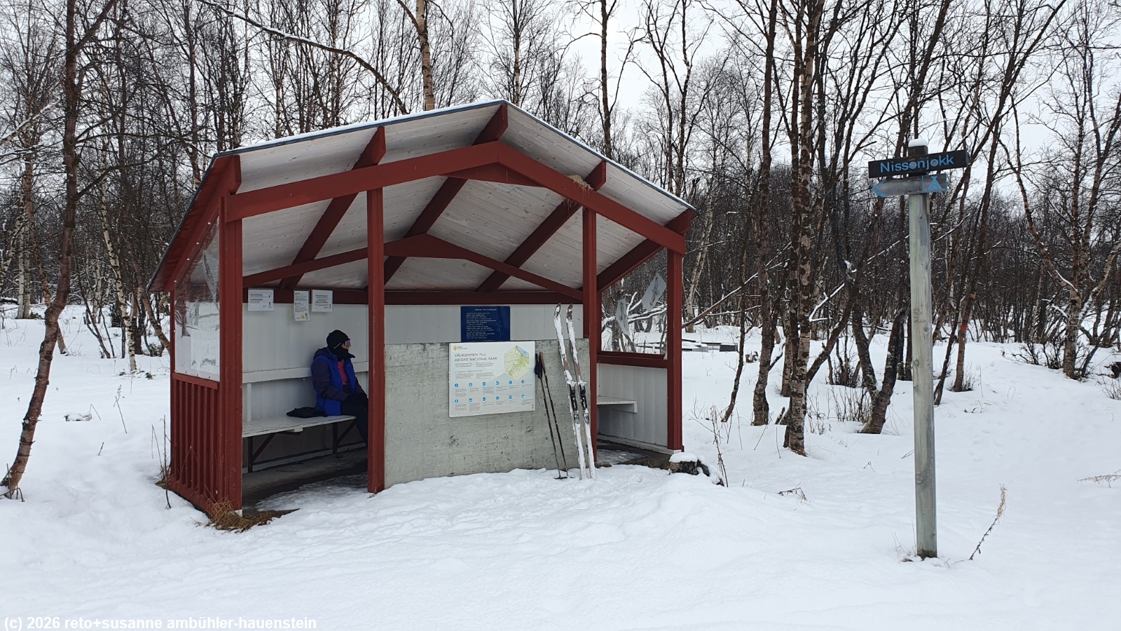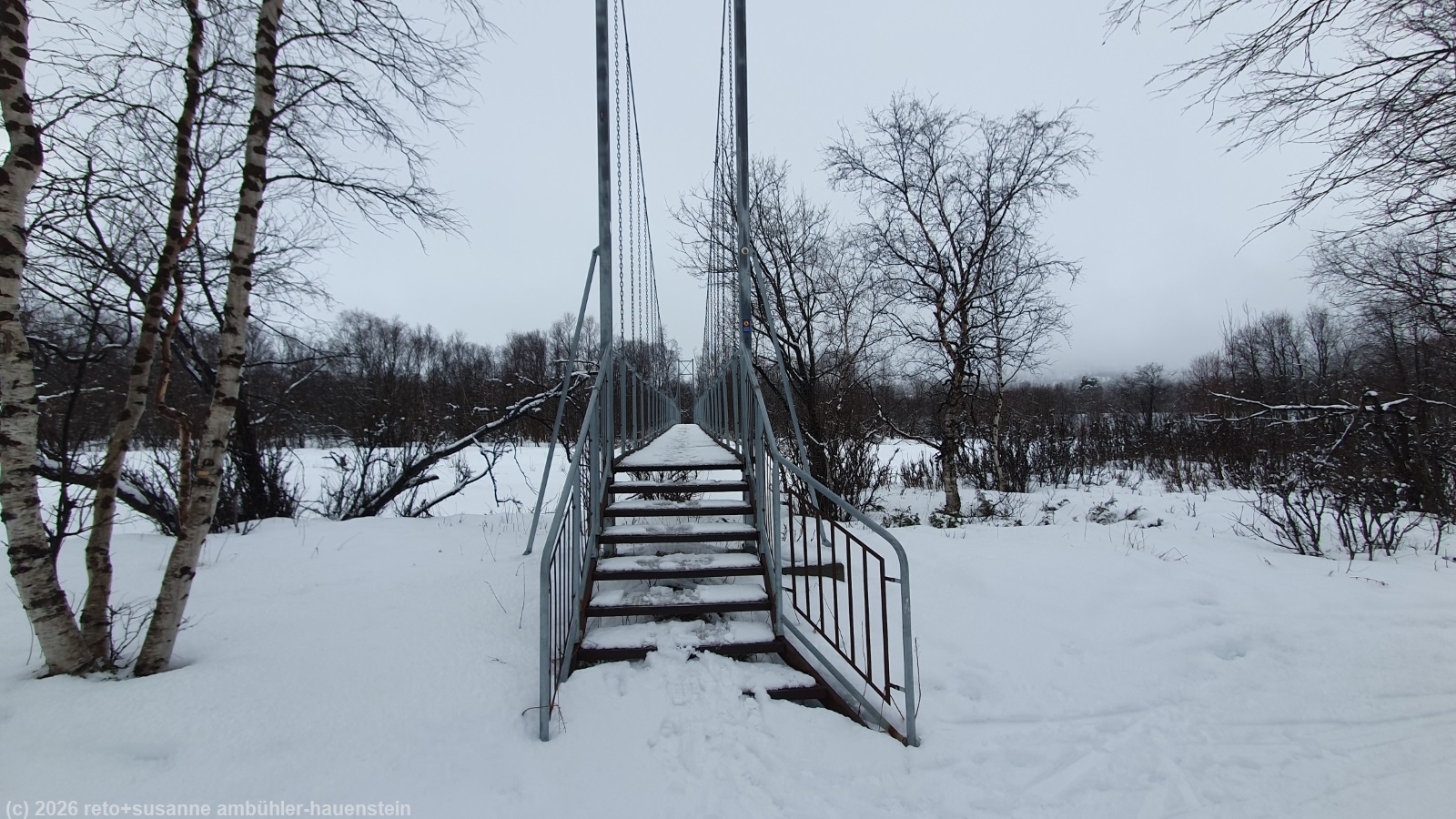 wir stehen auch heute um 8 uhr auf. das wetter ist ähnlich wie gestern. allerdings fällt nicht schneeregen, sondern es schweben grosse schneeflocken vom grauen himmel. wir frühstücken wie gewohnt im restaurant der fjällstation. wieder auf dem zimmer überlegen wir, welche runde wir laufen wollen. eigentlich würden wir gerne mit dem sessellift auf den njulla hinauffahren und den weiten bogen durchs tal zurücklaufen, aber wir sind uns nicht sicher, ob es überhaupt eine spur hat auf dem fjäll. wir sind diese runde im winter 2022 schon einmal gelaufen, allerdings in umgekehrter richtung. als wir oben ankamen, lief der sessellift nicht und wir mussten mit den waldskis den berg hinab rutschen, das war äusserst abenteuerlich, siehe tagebuch vom 23-feb-2022. auf grund der eher mässig vielversprechenden wettervorhersage entscheiden wir uns für eine tour im tal richtung abiskojaure. damit wir nicht den selben weg laufen müssen wie morgen, folgen wir dem wanderweg östlich des kungsleden richtung vuolip njahkajärvi. wir laufen durch einen niederen birkenwald. der schneefall hat die landschaft wieder mehr winterlich gemacht, das ist erfreulich. der weg ist gut markiert, aber wohl schon länger nicht mehr begangen worden. dies hat den vorteil, dass keine fussstapfen die spur kaputt gemacht haben. wir kommen sehr gut voran und geniessen die ruhe und abgeschiedenheit. auf dem kungsleden wird vermutlich mehr betrieb herrschen. wir sehen jeden tag gruppen von menschen, die meistens mit umgeschnallten warenschlitten aufbrechen. manche haben skis, andere schneeschuhe. die gruppe ist aber immer geführt, aus unserer sicht der bare albtraum. gegen 11 uhr erreichen wir den meditationsplatz hoch über dem abiskojåkka. der fluss ist nicht völlig zugefroren. wir machen einige bilder und laufen dann ein kurzes stück zurück, denn der direkte weg ist ziemlich steil und wir wollen kein risiko eingehen. wenig später erreichen wir den nissonjohka. eine hängebrücke führt über den fluss. gut 100 meter später erreichen wir den gleichnamigen rastplatz, bei welchem man auch campieren darf.