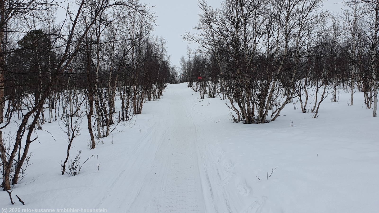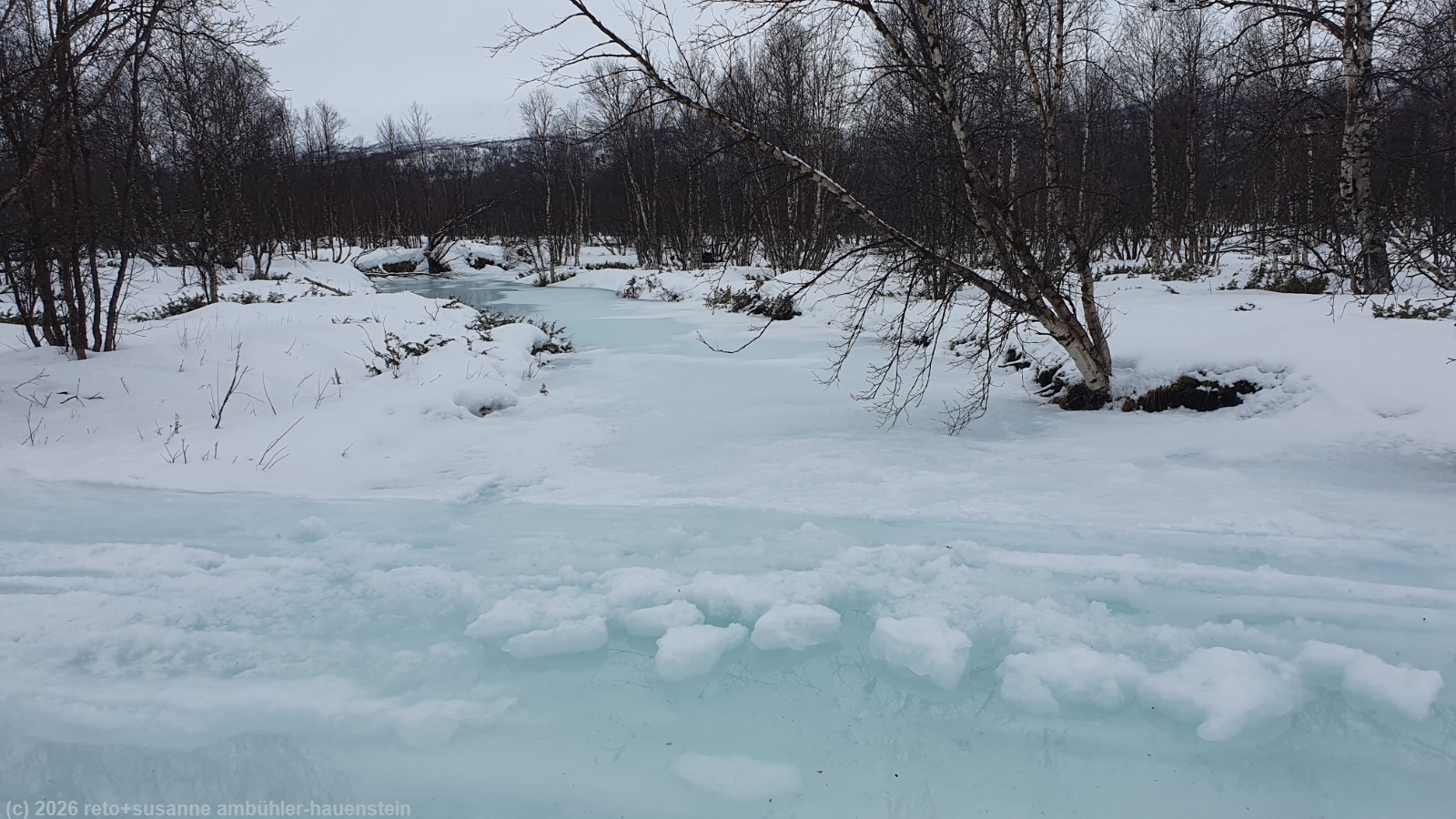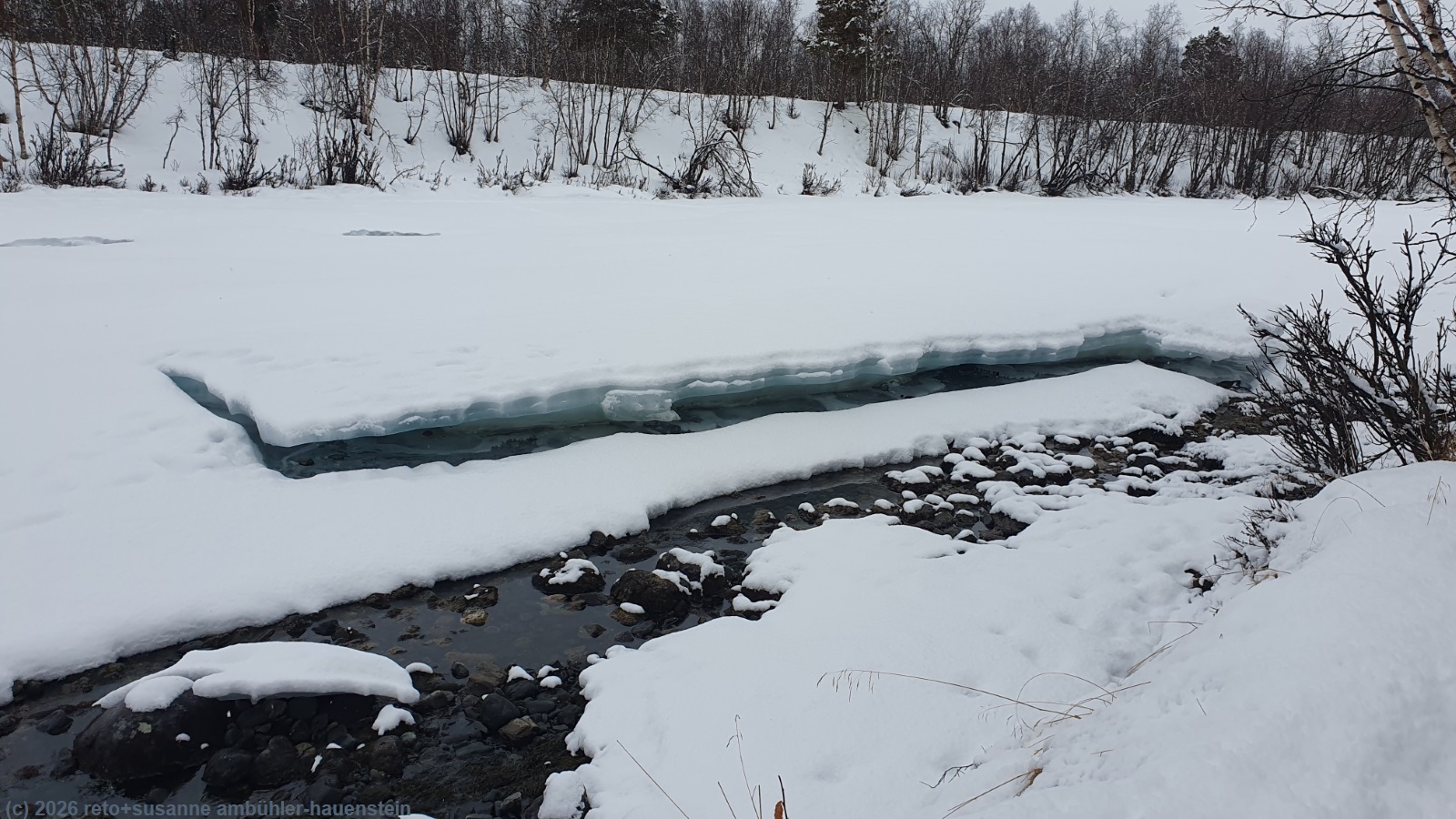 wir setzen uns in den offenen windschutz und essen unsere brote. plötzlich taucht am gegenüberliegenden ufer ein mensch auf. die person dreht aber um und verschwindet wieder. einige minuten später erscheint die person in begleitung einer zweiten wieder auf dem hügel. diesmal wagen sie sich über den fluss. ein risiko, das wir wohl nicht eingegangen wären, denn das eis sieht nicht besonders dick aus und vorallem nicht kompakt. die beiden erreichen aber das ufer auf unserer seite unbeschadet und bald folgt noch eine dritte person. auf grund ihres gespräches schliessen wir, dass sie zu einer grösseren reisegruppe aus deutschland gehören. die übrigen haben offenbar umgedreht. kurz nach 12:30 uhr brechen wir wieder auf. wir laufen zurück bis zur hängebrücke, überqueren diese aber nicht, sondern folgen dem fluss ostwärts. der pfad wendet sich bald in südöstlicher richtung. am südlichsten punkt treffen wir auf motorschlittenspuren. der weg ist nun ziemlich breit und der schnee festgepresst. wir überqueren kleinere flussläufe. die spur ist an manchen stellen unter wasser, wir hoffen, dass das eis noch genügend tragfähig ist. glücklicherweise überstehen wir den abschnitt trockenen fusses. der pfad steigt jetzt kontinuierlich an. kurz vor dem höchsten punkt gelangen wir wieder in den abisko nationalpark. es folgt eine längere abfahrt zwischen zahlreichen kleineren bäumen hindurch. das gefäll ist aber so gering, dass wir die geschwindigkeit gut kontrollieren können. knapp 2 km vor dem ziel gelangen wir auf den weg, auf dem wir am samstag schon gelaufen sind, siehe tagebuch vom 07-mar-2026. kurz vor 14:30 uhr sind wir wieder bei der fjällstation.