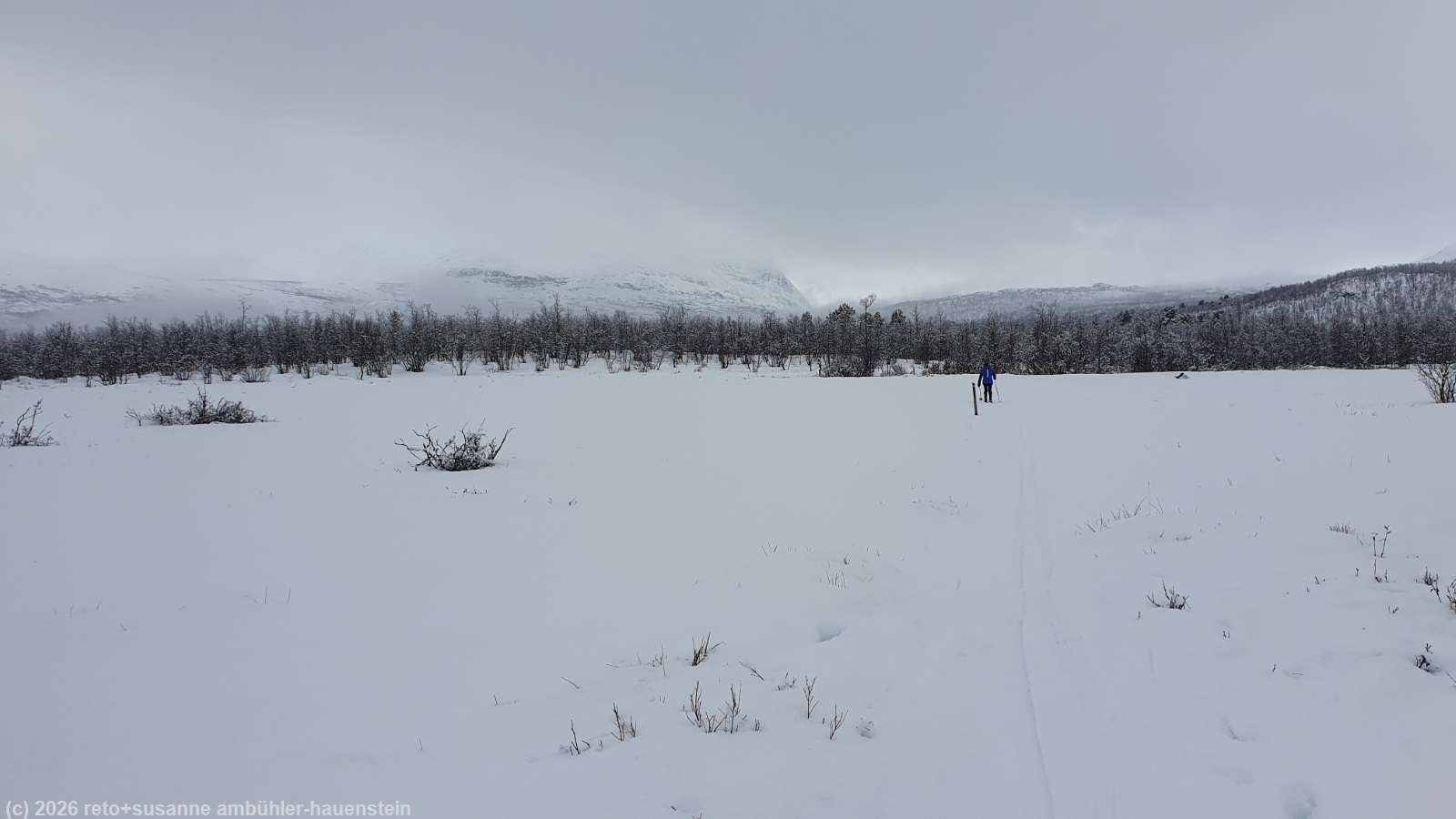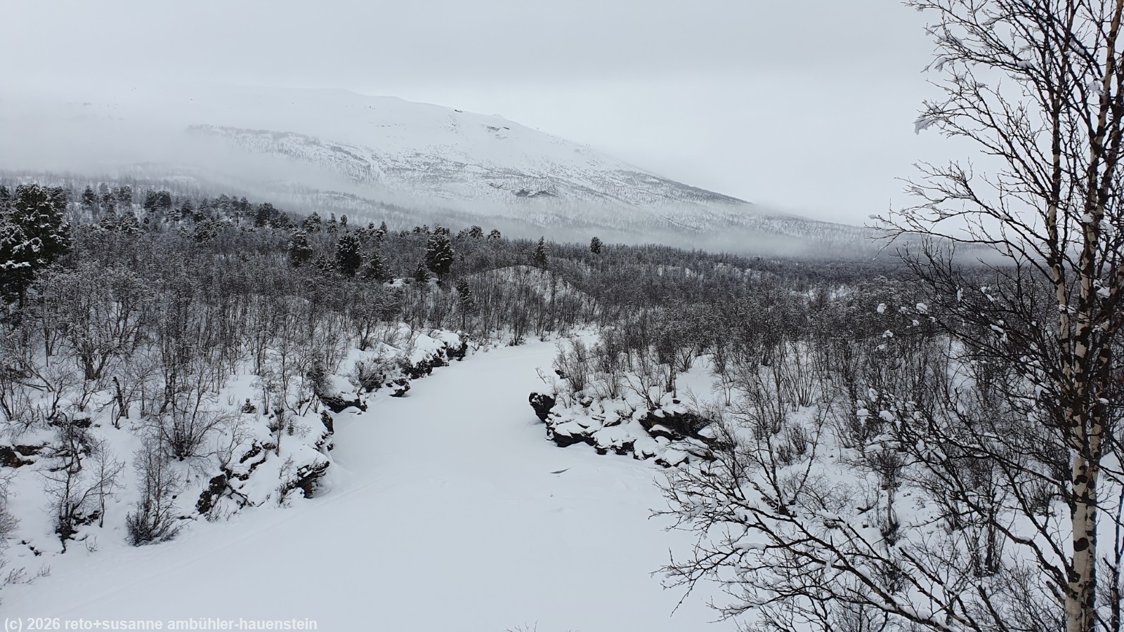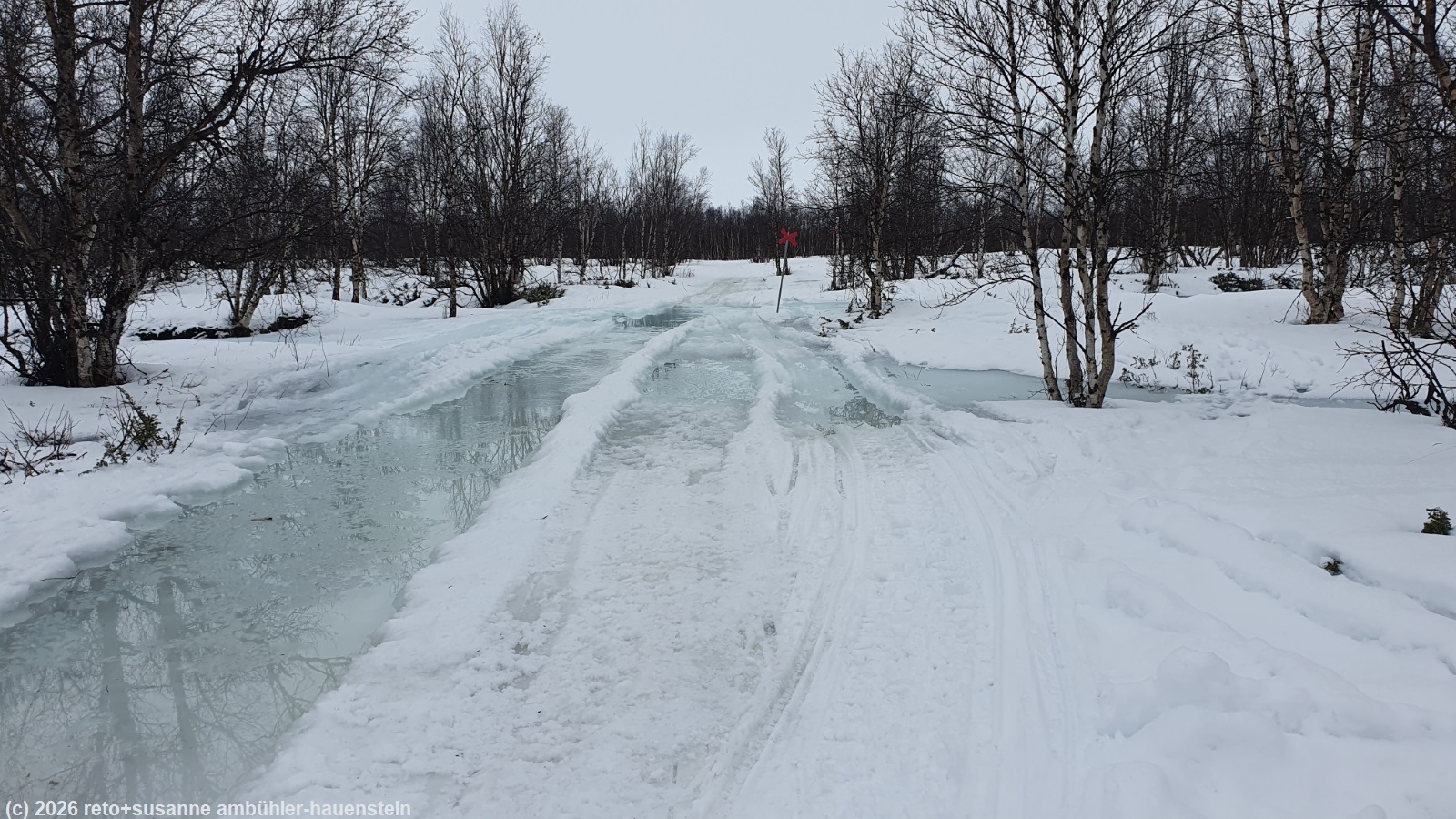 wir setzen uns in den offenen windschutz und essen unsere brote. plötzlich taucht am gegenüberliegenden ufer ein mensch auf. die person dreht aber um und verschwindet wieder. einige minuten später erscheint die person in begleitung einer zweiten wieder auf dem hügel. diesmal wagen sie sich über den fluss. ein risiko, das wir wohl nicht eingegangen wären, denn das eis sieht nicht besonders dick aus und vorallem nicht kompakt. die beiden erreichen aber das ufer auf unserer seite unbeschadet und bald folgt noch eine dritte person. auf grund ihres gespräches schliessen wir, dass sie zu einer grösseren reisegruppe aus deutschland gehören. die übrigen haben offenbar umgedreht. kurz nach 12:30 uhr brechen wir wieder auf. wir laufen zurück bis zur hängebrücke, überqueren diese aber nicht, sondern folgen dem fluss ostwärts. der pfad wendet sich bald in südöstlicher richtung. am südlichsten punkt treffen wir auf motorschlittenspuren. der weg ist nun ziemlich breit und der schnee festgepresst. wir überqueren kleinere flussläufe. die spur ist an manchen stellen unter wasser, wir hoffen, dass das eis noch genügend tragfähig ist. glücklicherweise überstehen wir den abschnitt trockenen fusses. der pfad steigt jetzt kontinuierlich an. kurz vor dem höchsten punkt gelangen wir wieder in den abisko nationalpark. es folgt eine längere abfahrt zwischen zahlreichen kleineren bäumen hindurch. das gefäll ist aber so gering, dass wir die geschwindigkeit gut kontrollieren können. knapp 2 km vor dem ziel gelangen wir auf den weg, auf dem wir am samstag schon gelaufen sind, siehe tagebuch vom 07-mar-2026. kurz vor 14:30 uhr sind wir wieder bei der fjällstation.