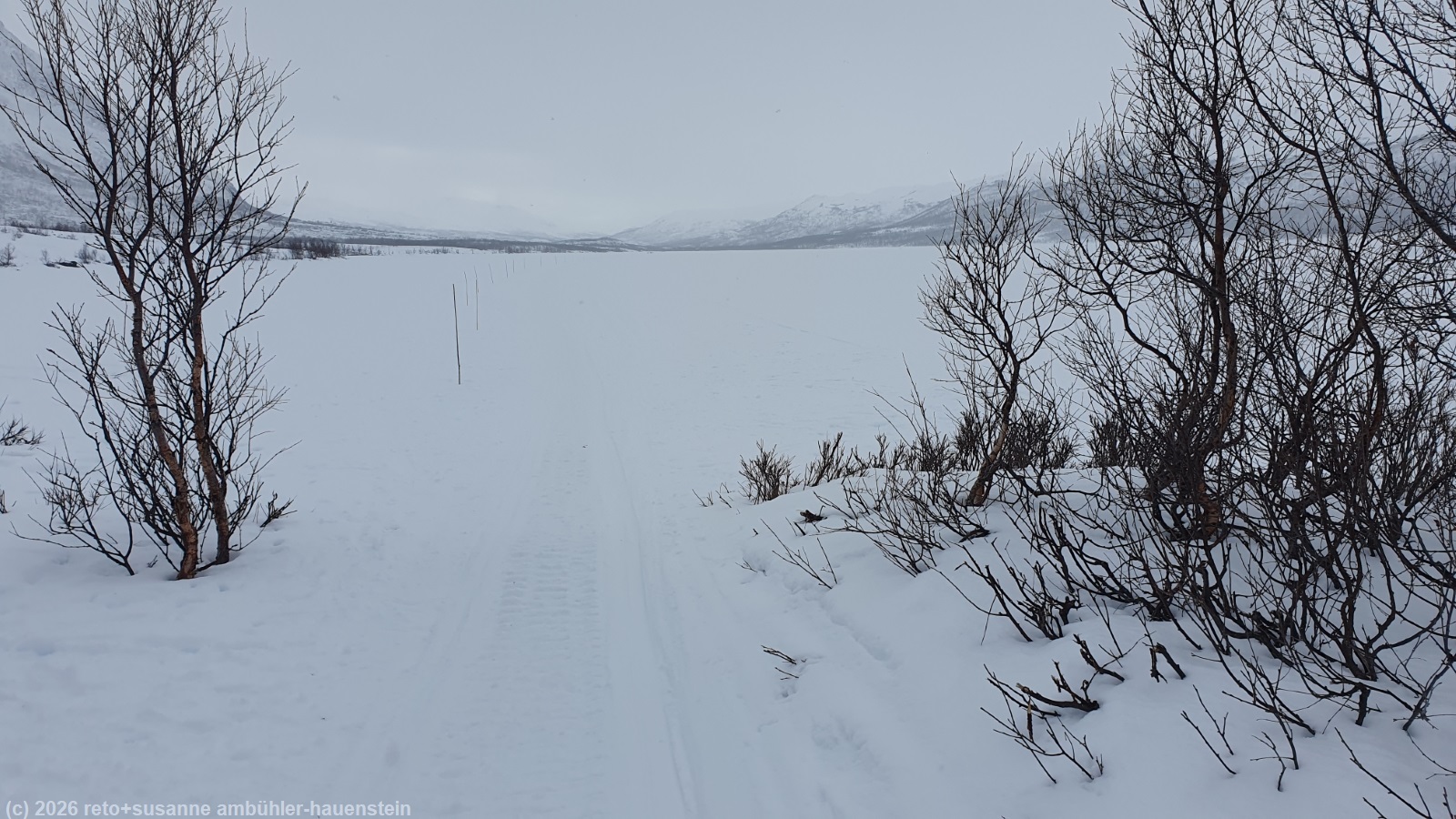 | skispuren am nordöstlichen ende des abiskojaure | giron am südöstlichen ufer des abiskojaure |